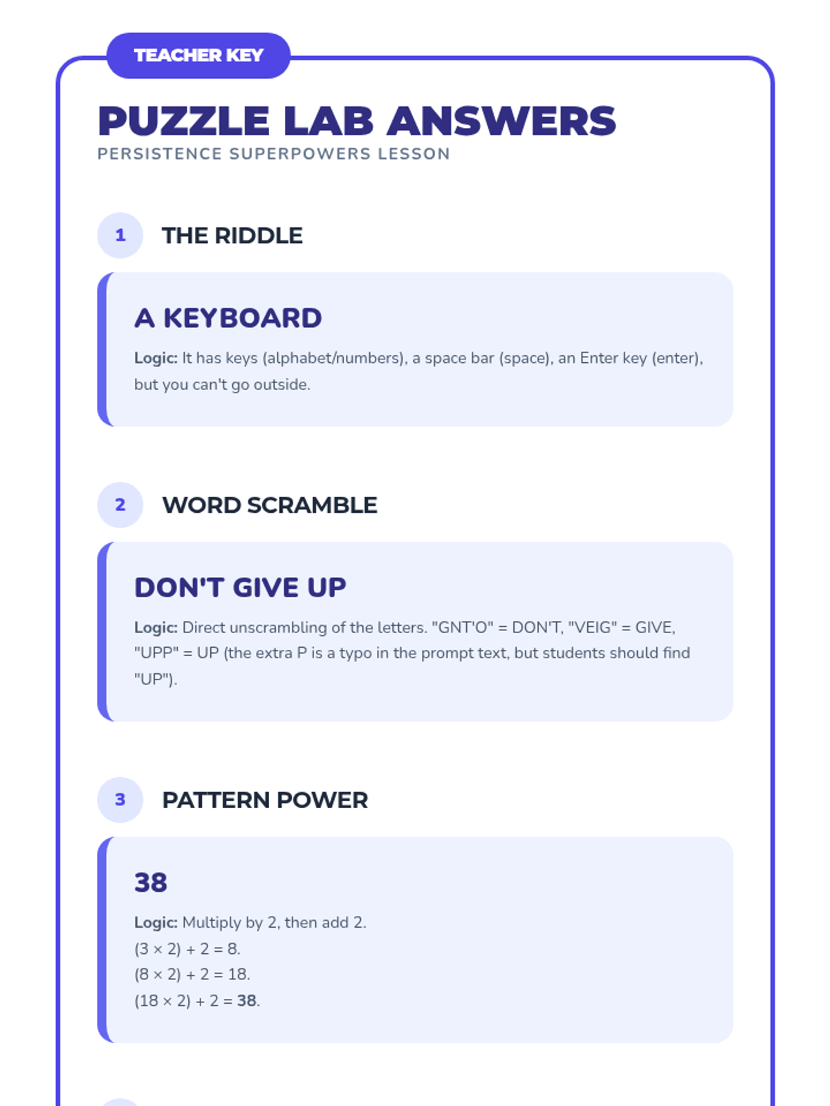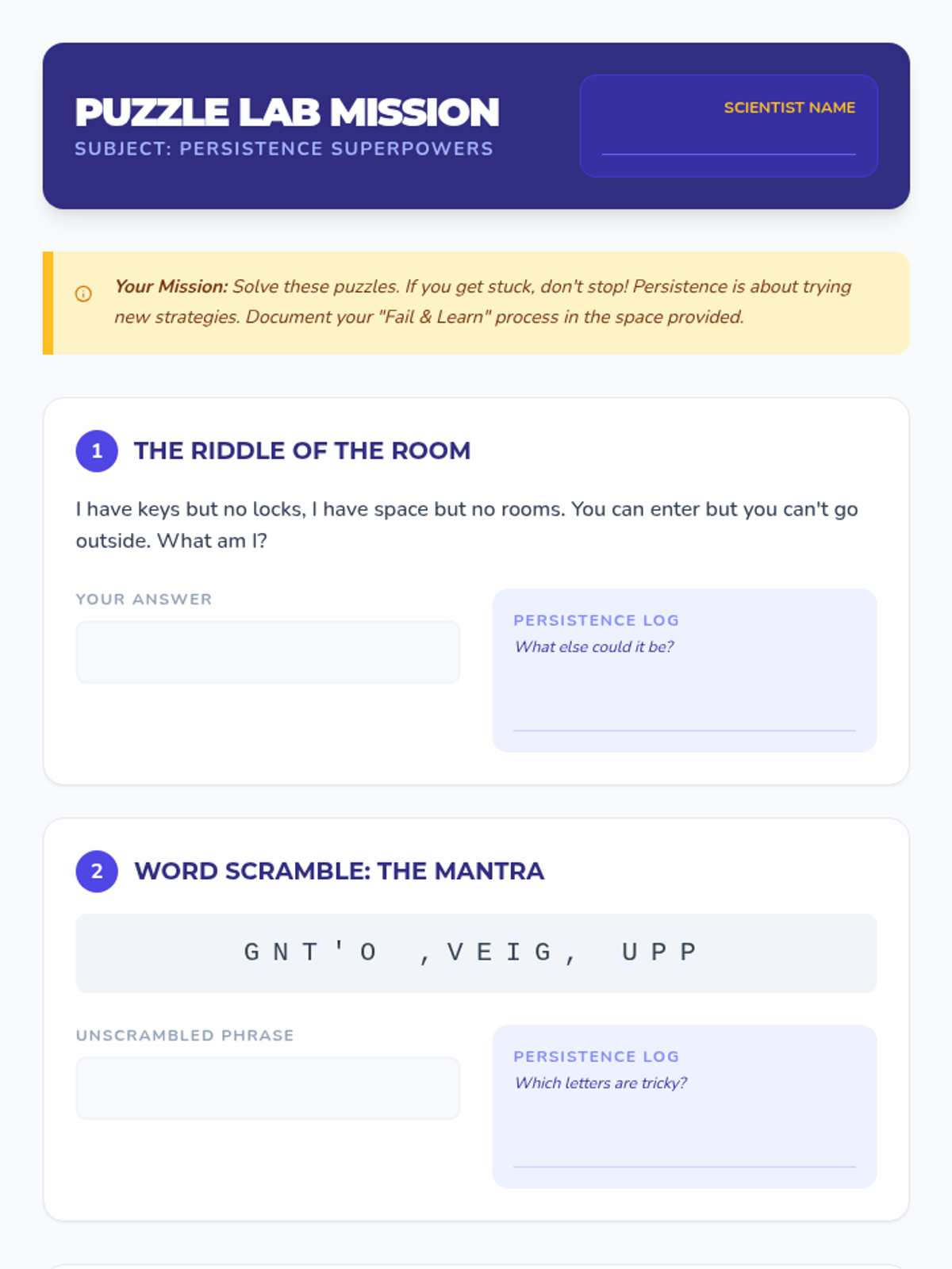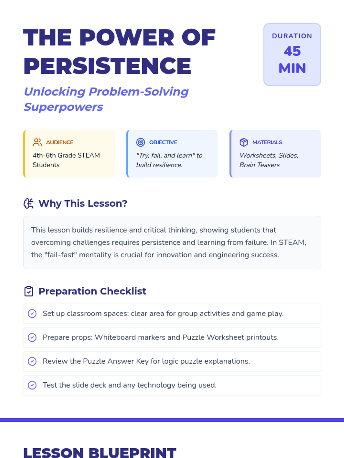 A 45-minute STEAM lesson for 4th-6th graders that uses puzzles and challenges to teach the value of persistence and learning from failure.