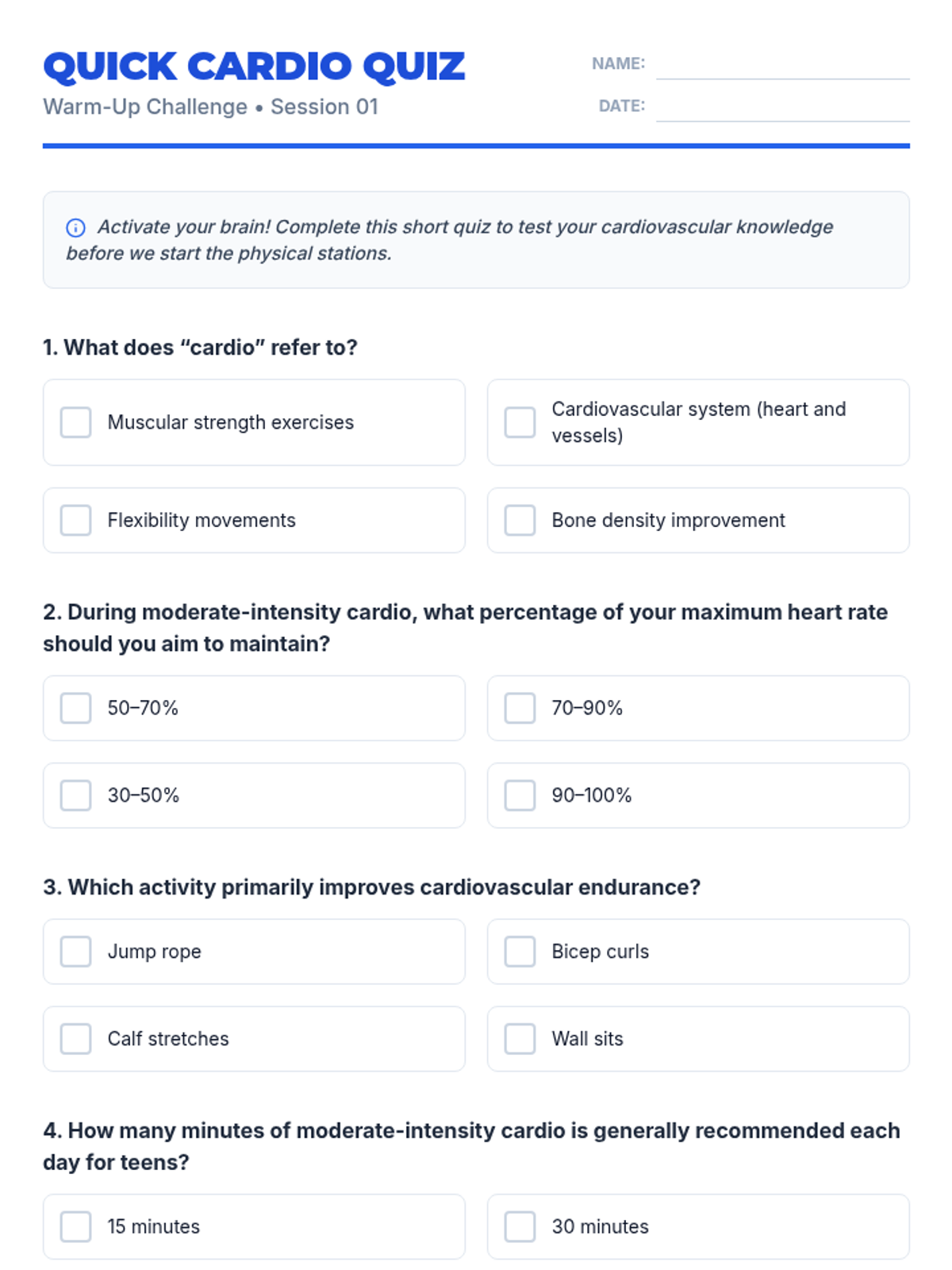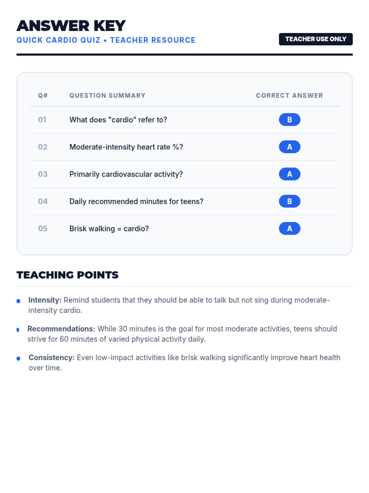 A high-energy lesson focused on understanding heart health through cardiovascular exercise, specifically walking, running, and machine-based cardio. Students will learn to monitor their heart rate and understand the benefits of aerobic activity.