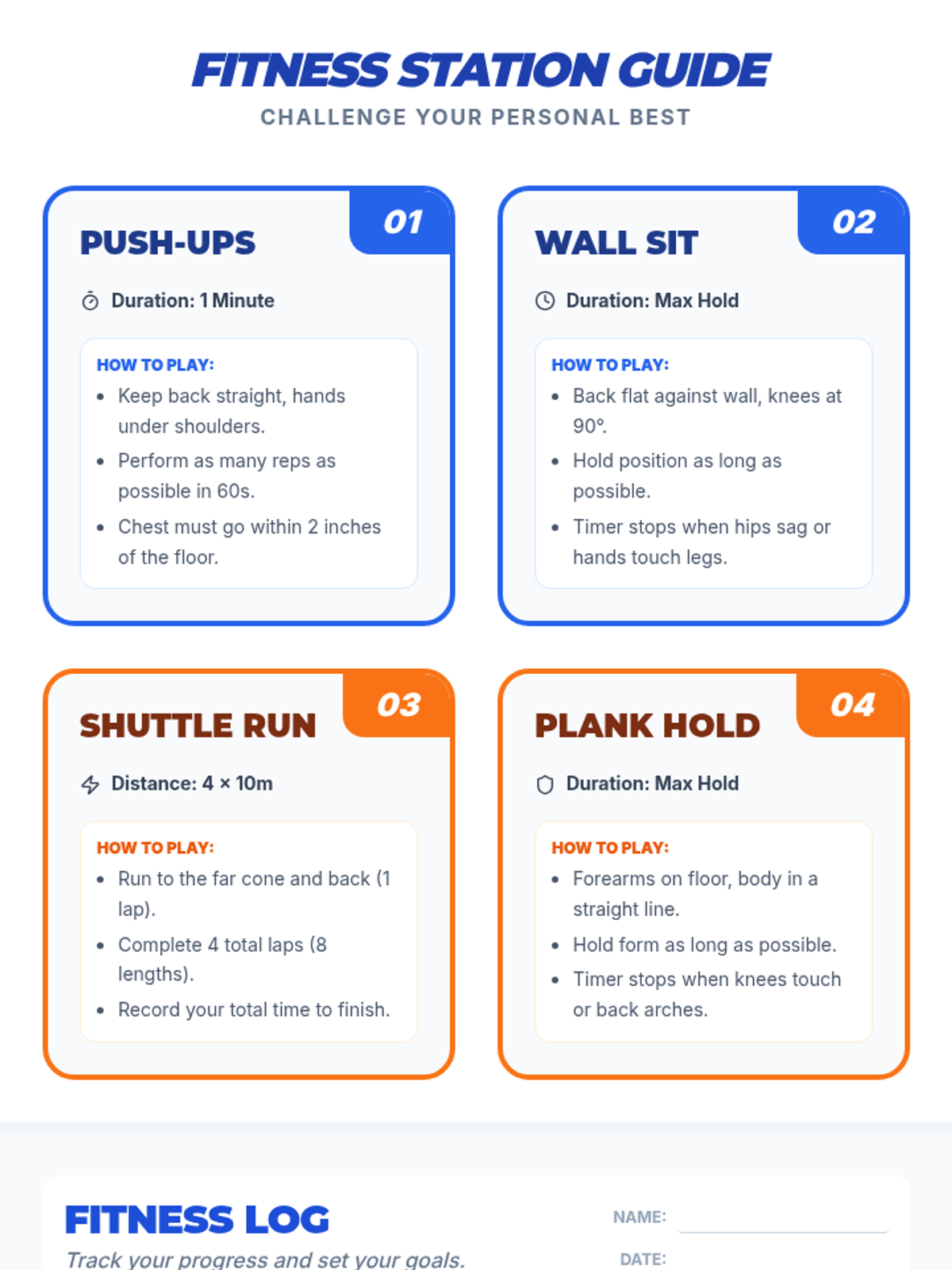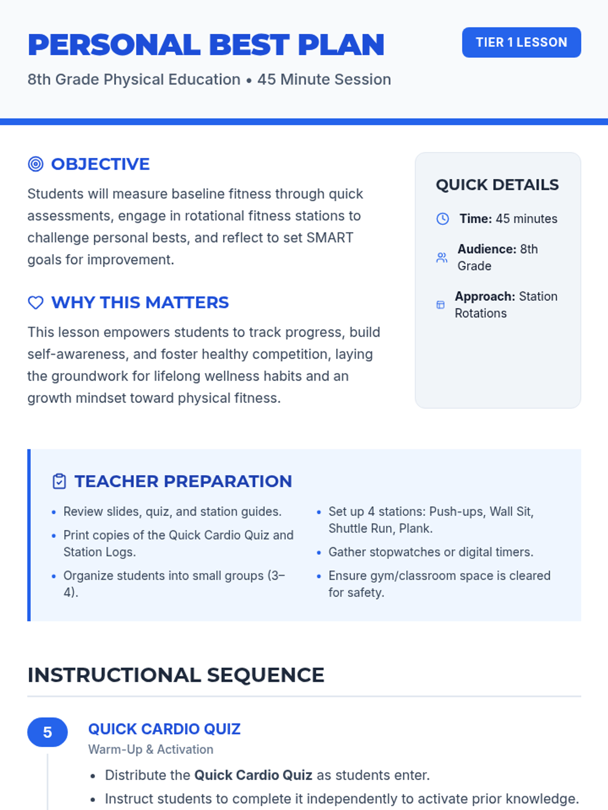 A dynamic 45-minute lesson for 8th graders to track and improve fitness scores through station-based activities, SMART goal setting, and guided reflection.