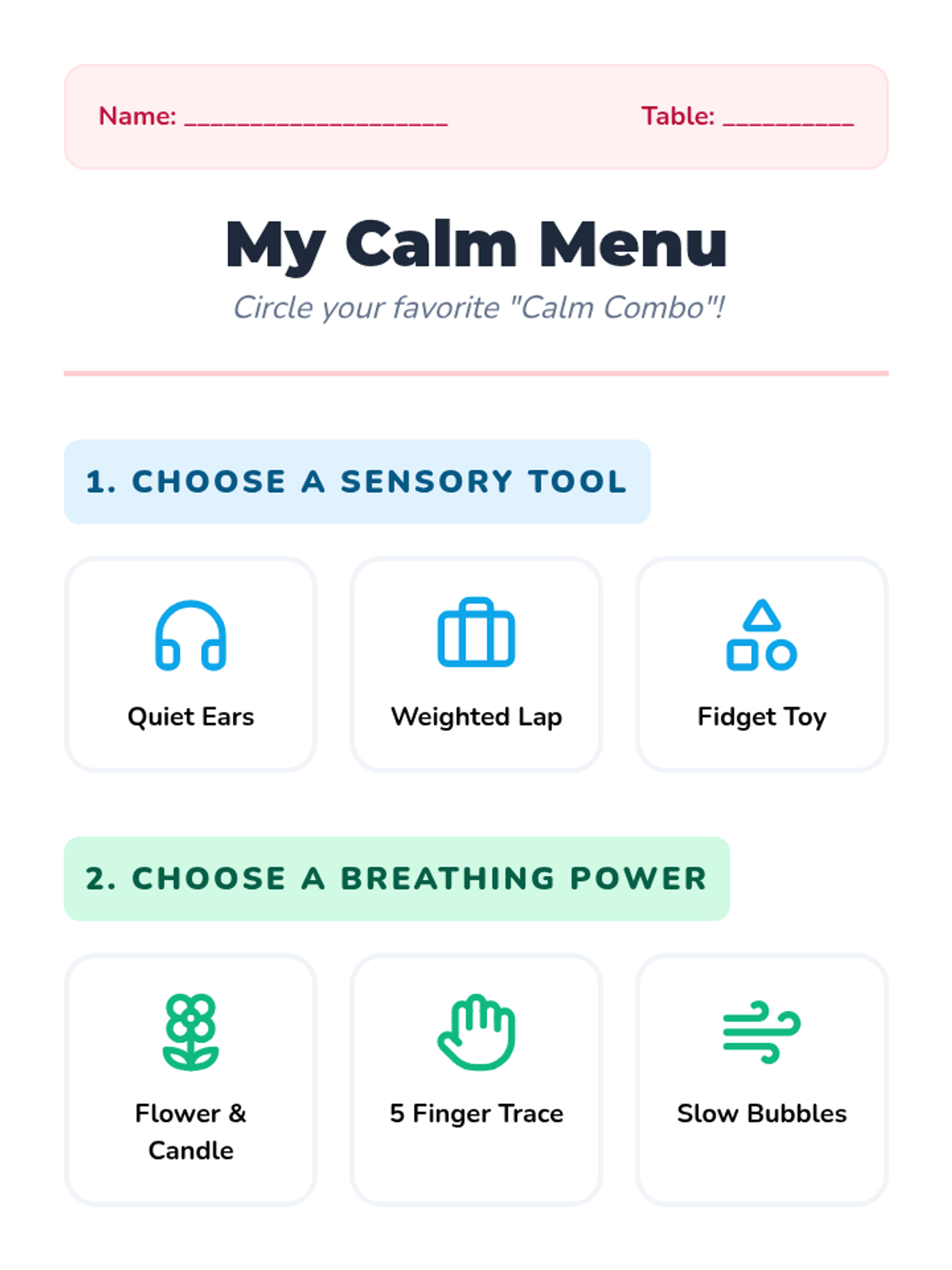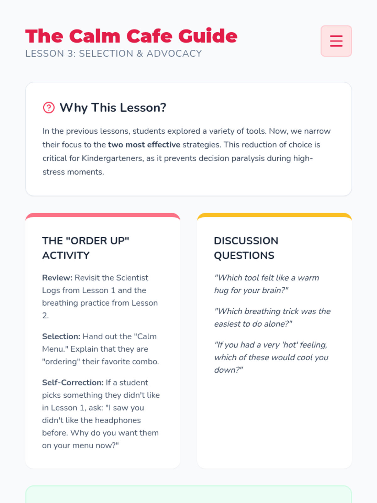 Students review their experiences to select their top two favorite calming methods, preparing the visual components for their personal script.