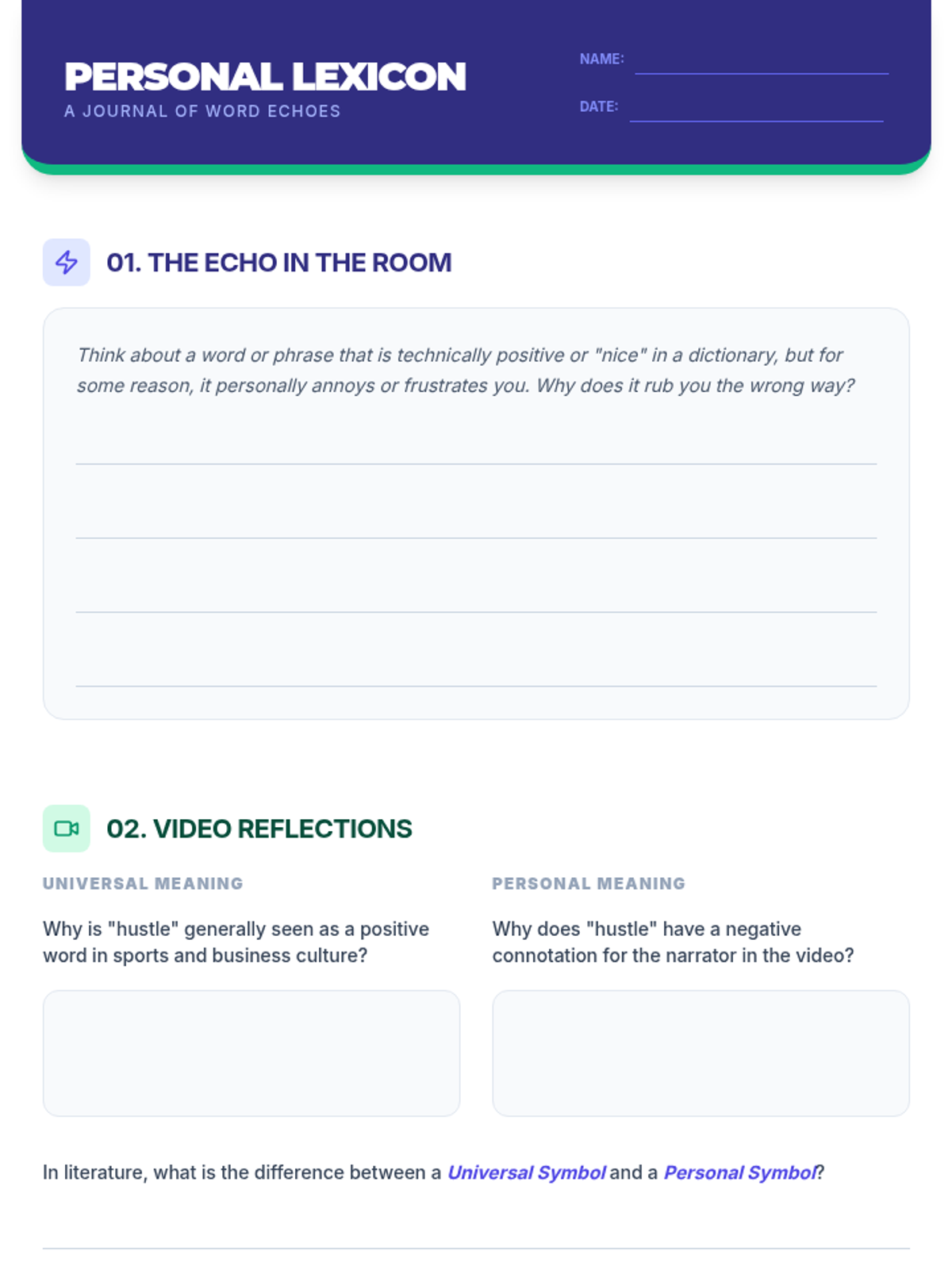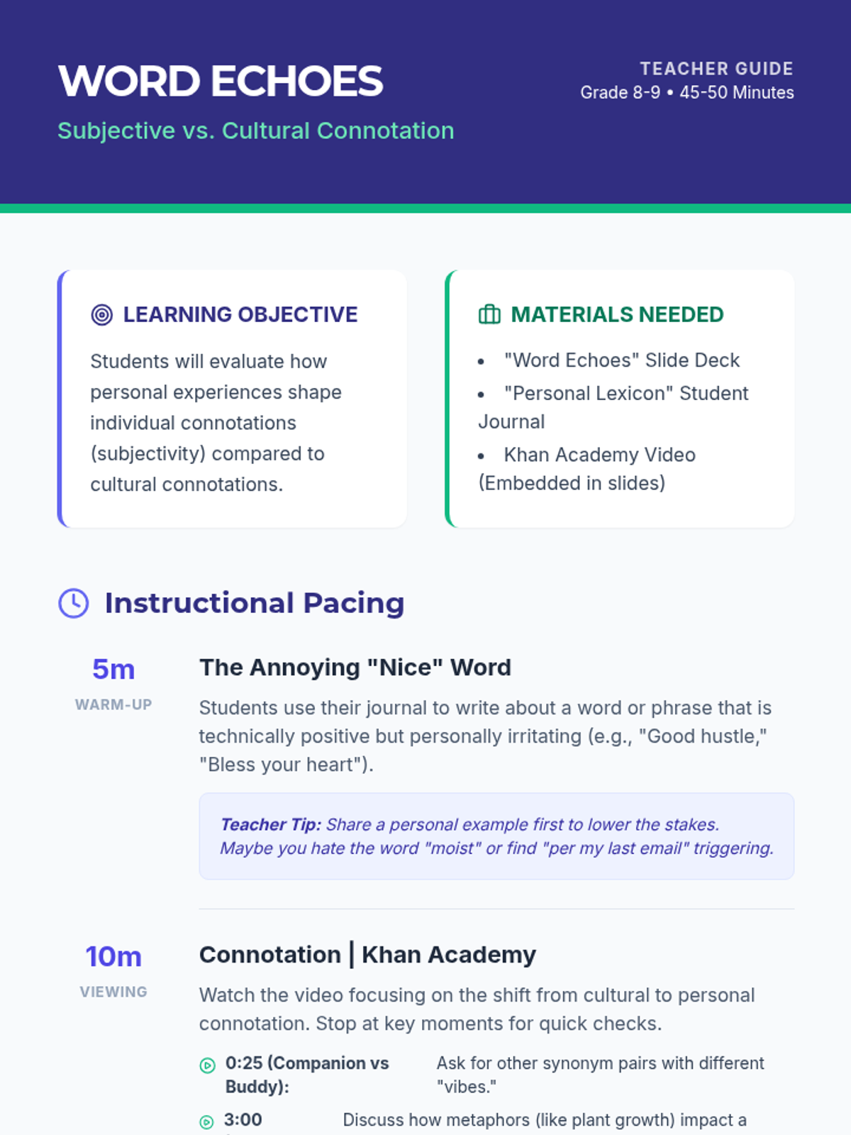 Students explore how personal experiences create subjective connotations for words, contrasting them with standard dictionary definitions and cultural associations through the lens of a Khan Academy video.