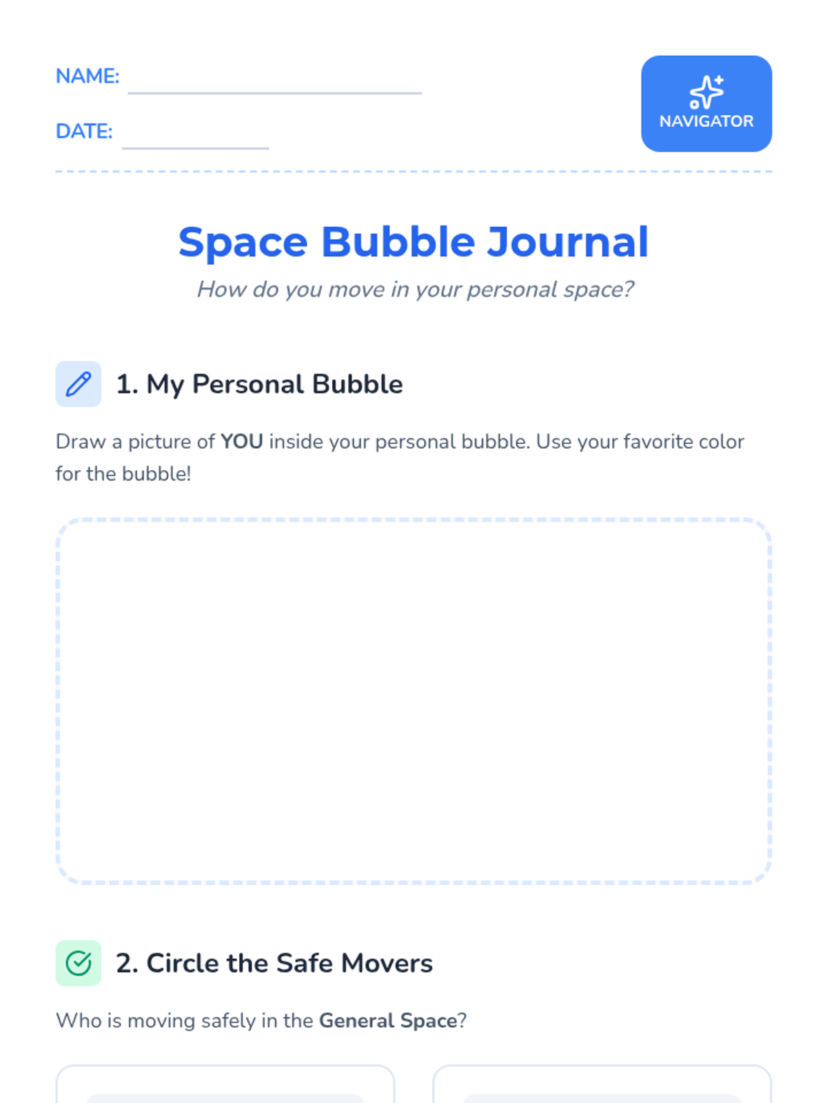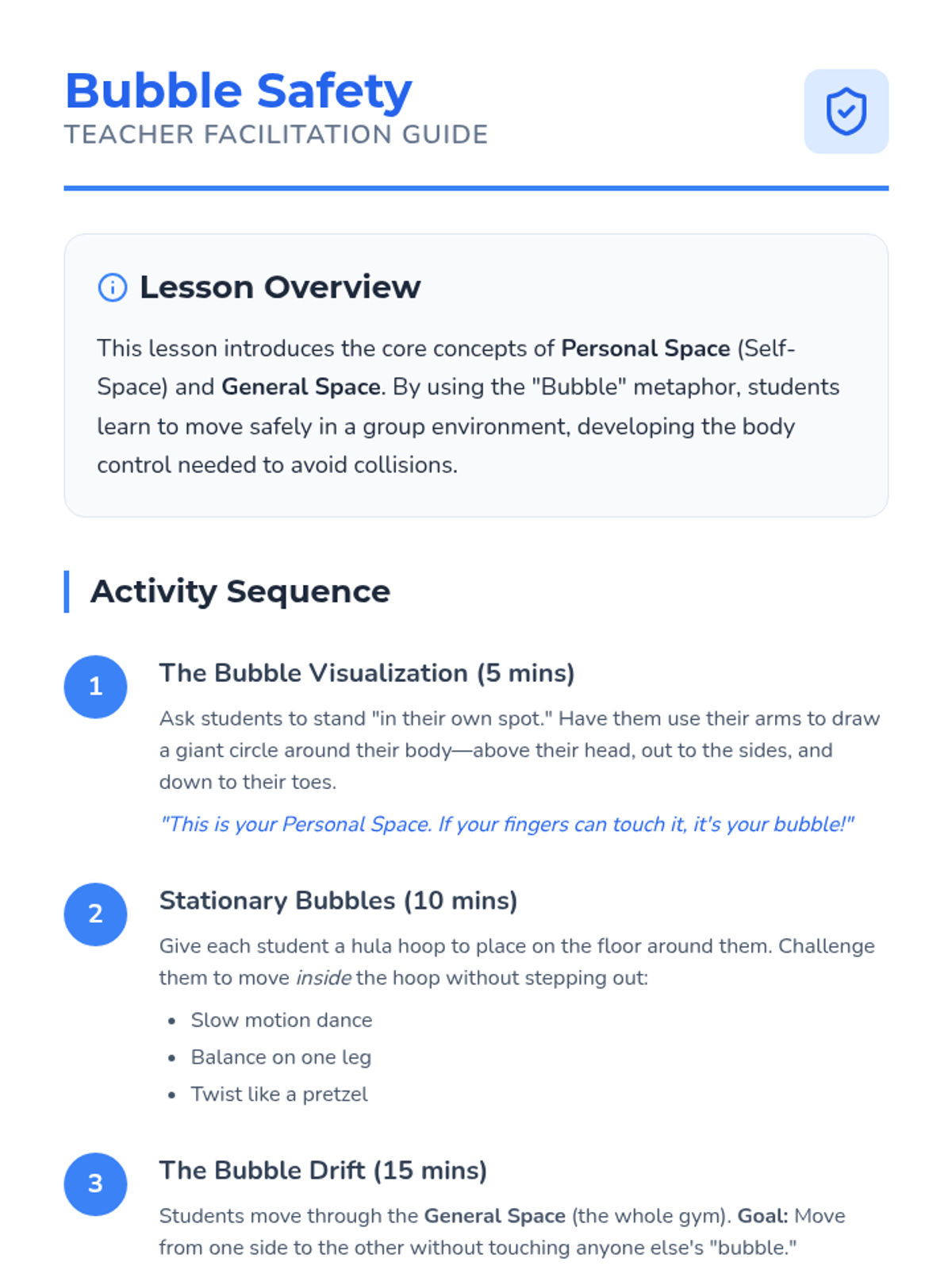 Students learn to identify and respect their 'personal bubble' using visual boundaries like hoops. They practice moving through general space without colliding, establishing the foundation for group safety.