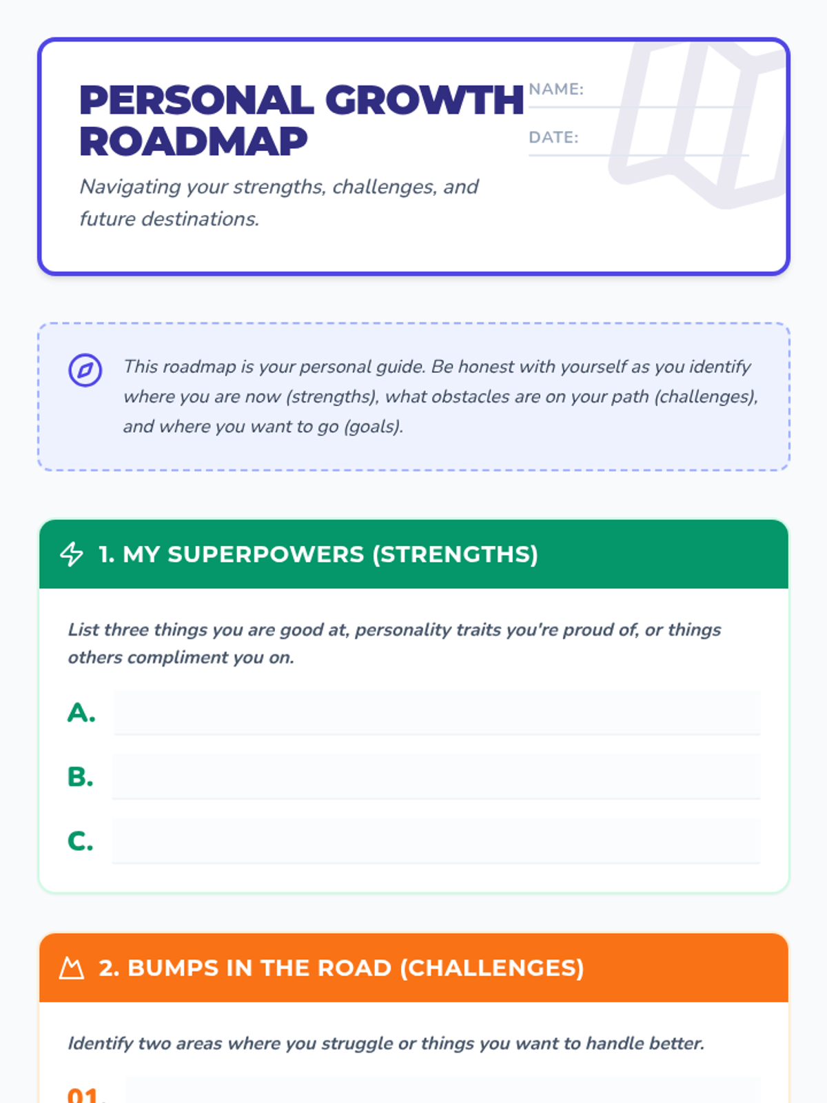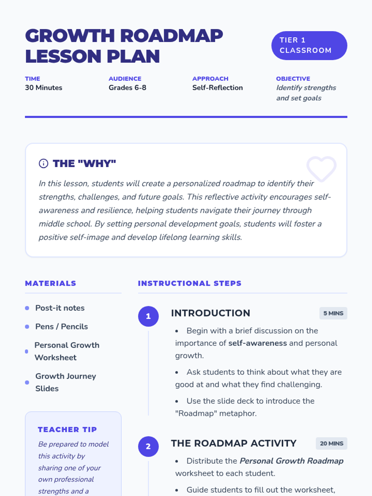 A reflective lesson for middle school students to identify strengths, challenges, and set goals using a roadmap metaphor to foster self-awareness and resilience.
