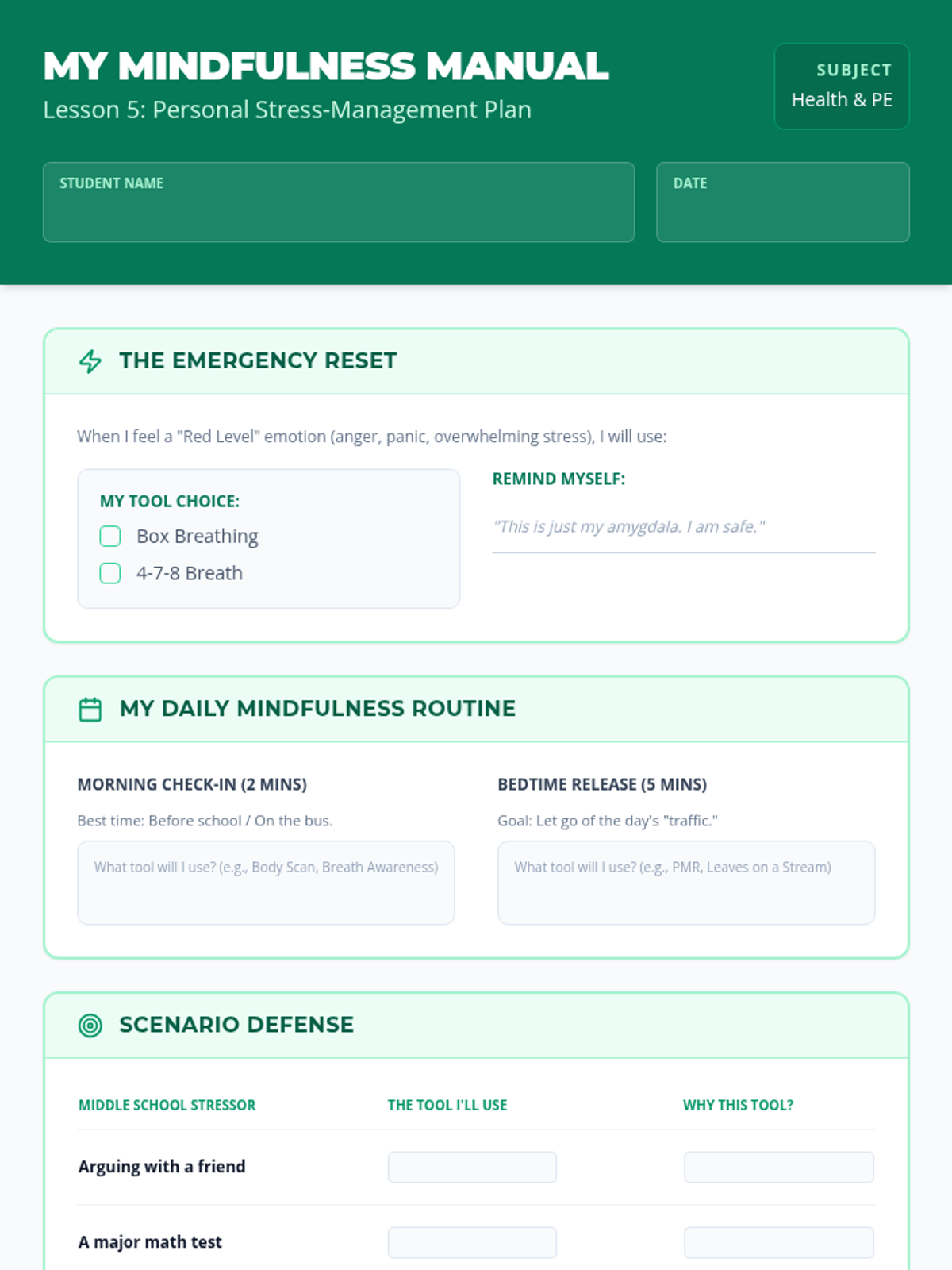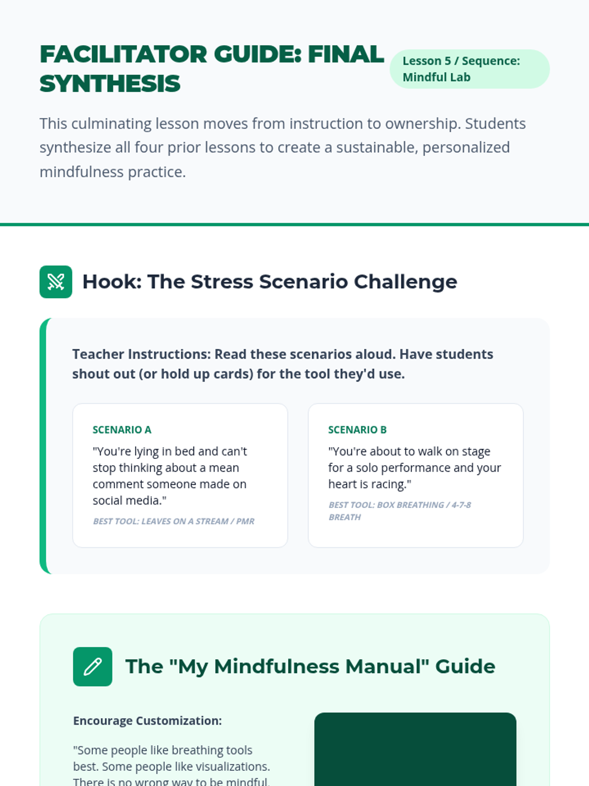 Students synthesize learned techniques to create a personalized stress-management plan, matching specific meditation tools to real-world middle school stressors.
