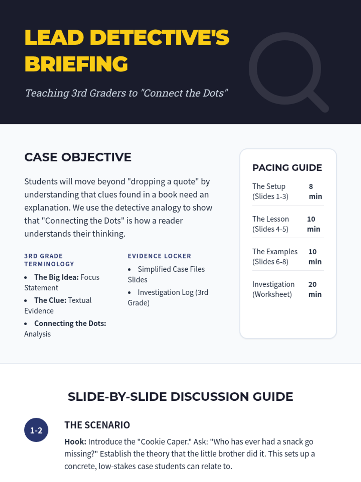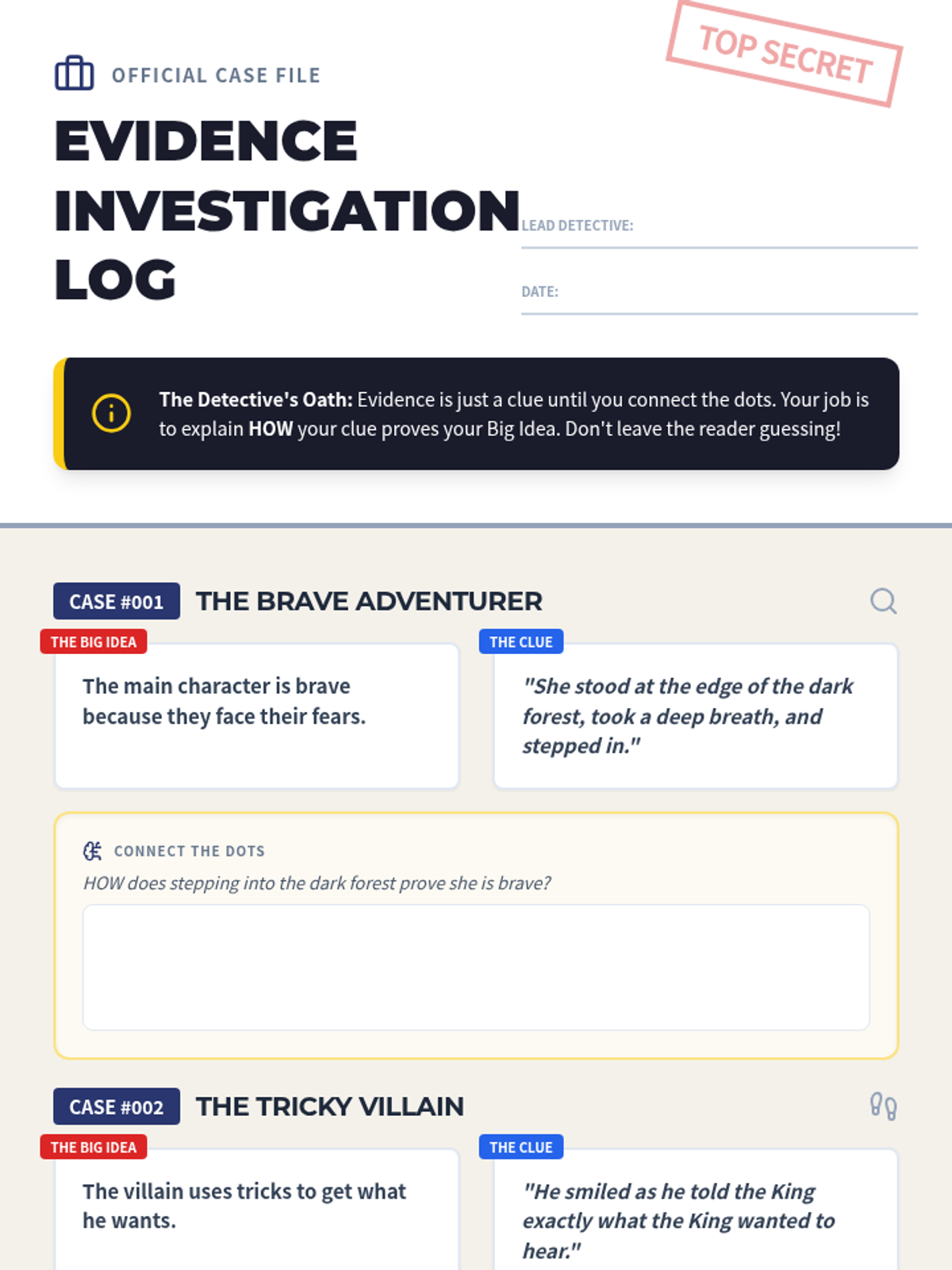 A lesson using a detective analogy to teach students how to analyze evidence. Students learn that clues (evidence) mean nothing without a detective's logic (analysis) to solve the case (argument).