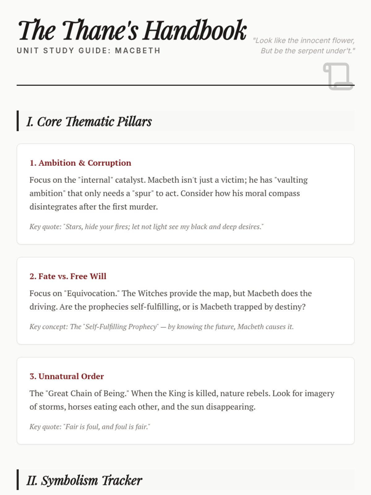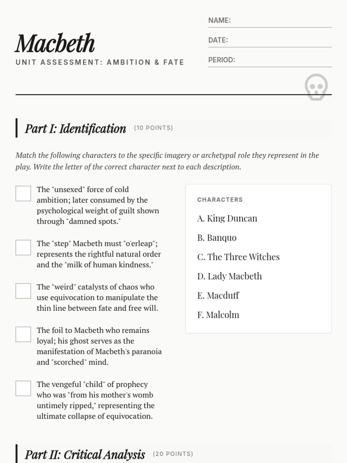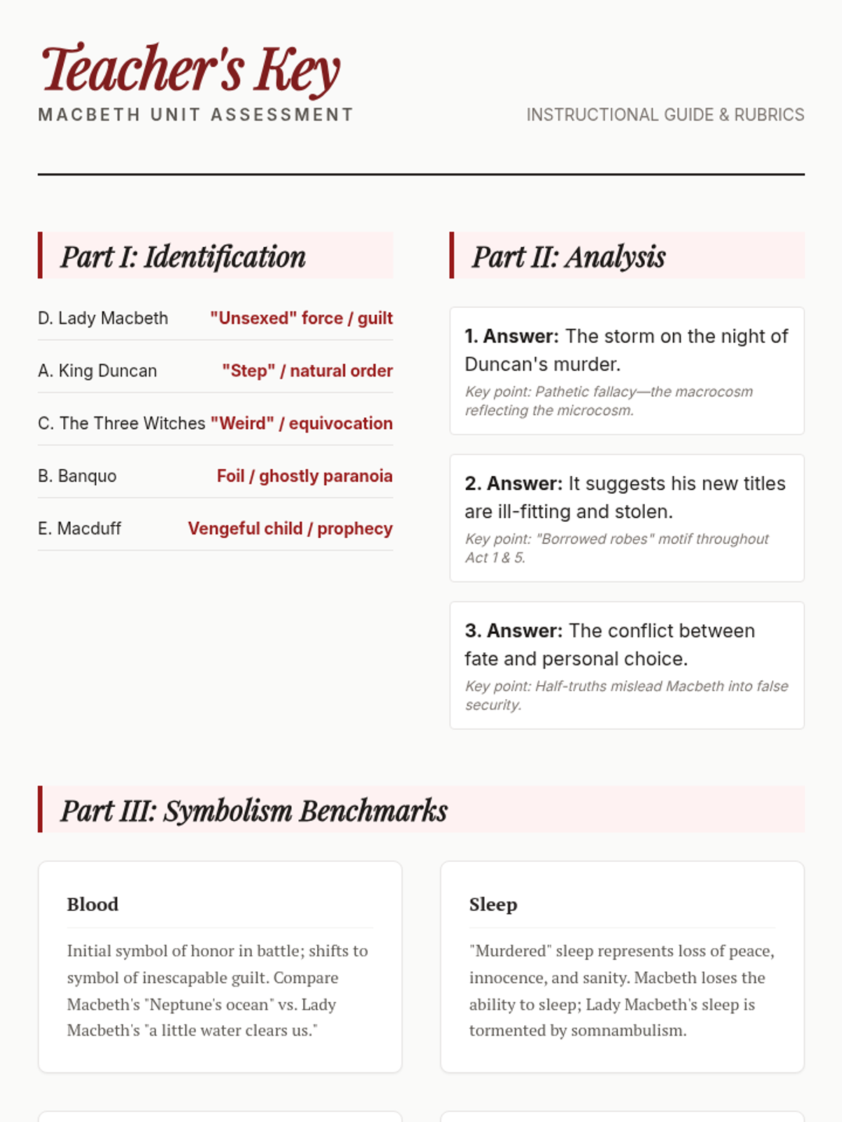 A comprehensive final assessment for William Shakespeare's Macbeth, focusing on imagery, symbolism, fate, and the corrupting nature of ambition.