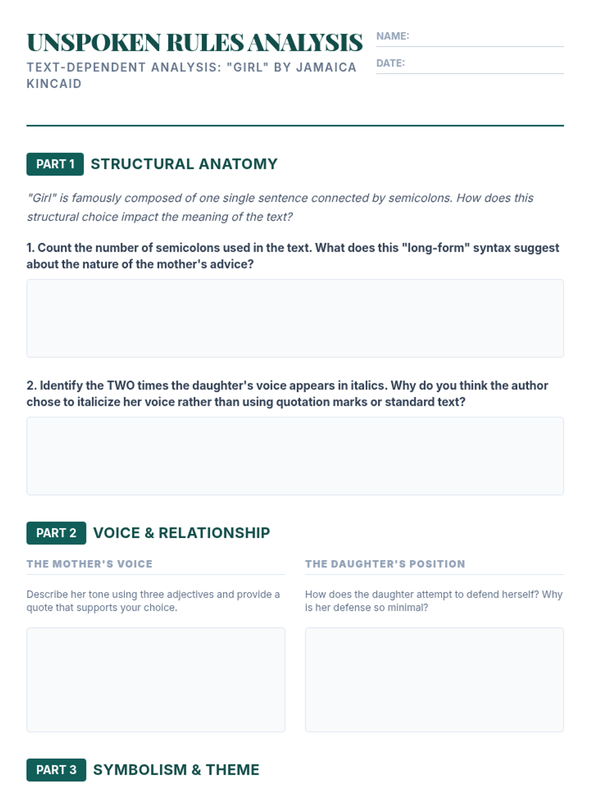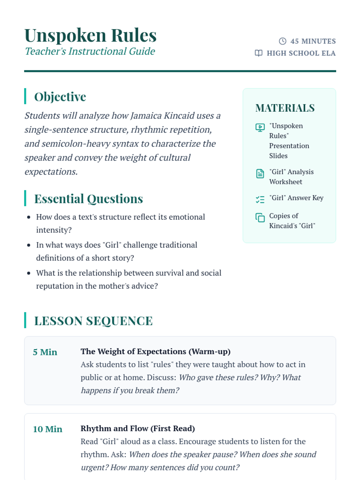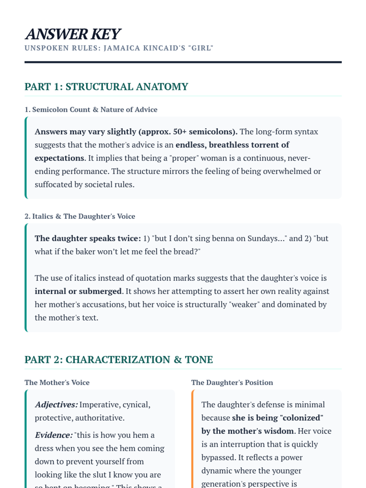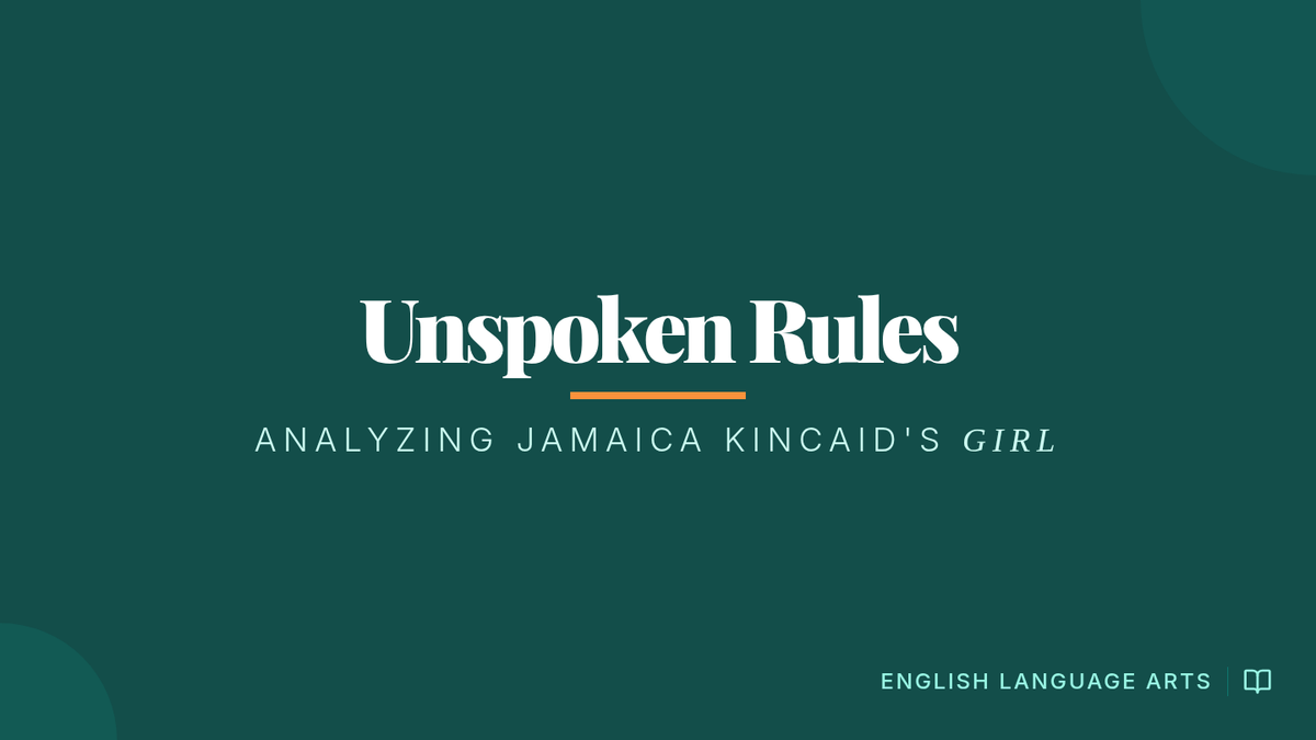 An introductory lesson on Jamaica Kincaid's 'Girl' focusing on the unique structural choice of a single-sentence narrative, its rhythmic style, and the complex characterization of the mother-daughter relationship.