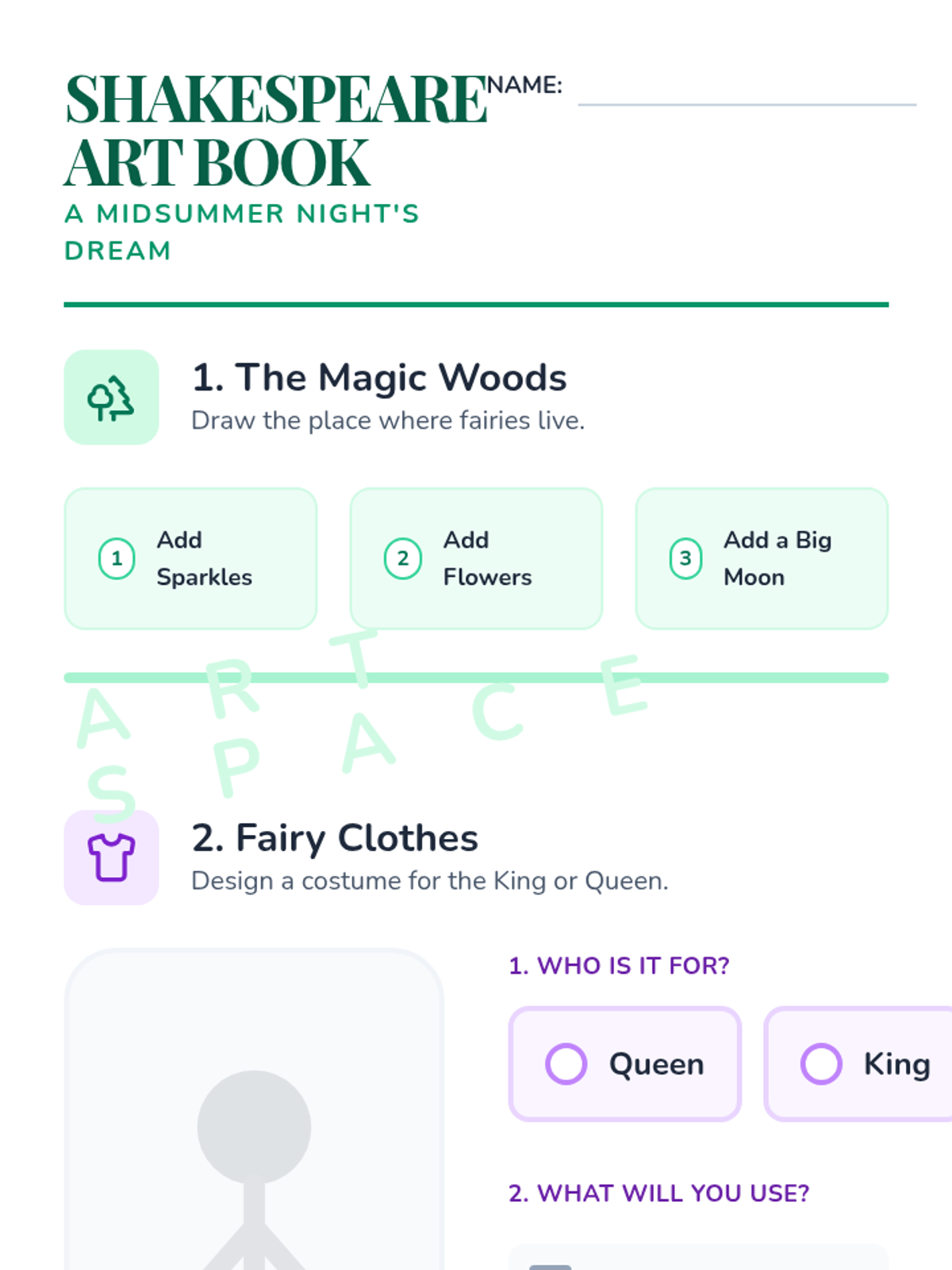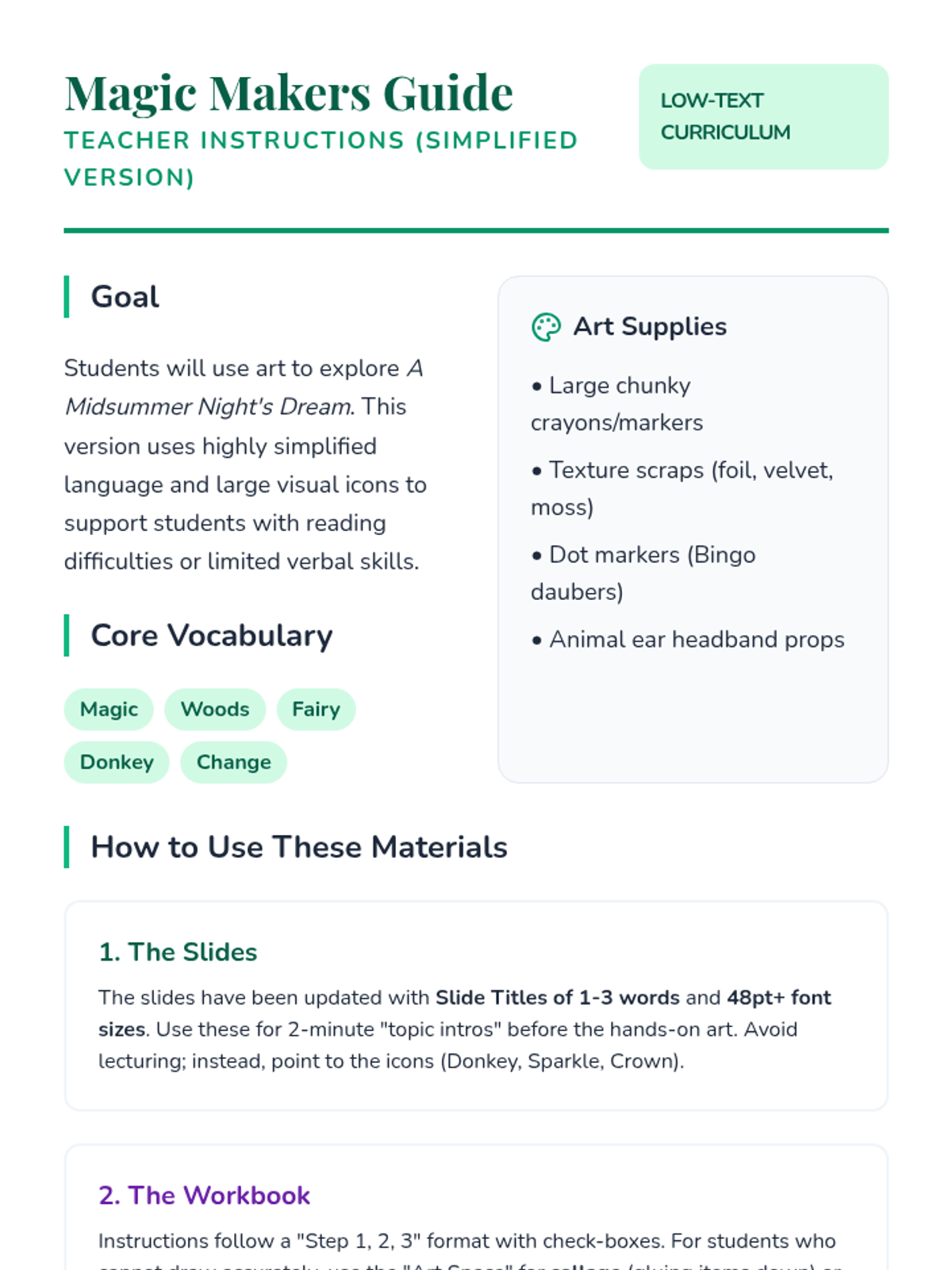 A creative arts-focused lesson on A Midsummer Night's Dream designed for special education students, focusing on character visual design and setting illustration.