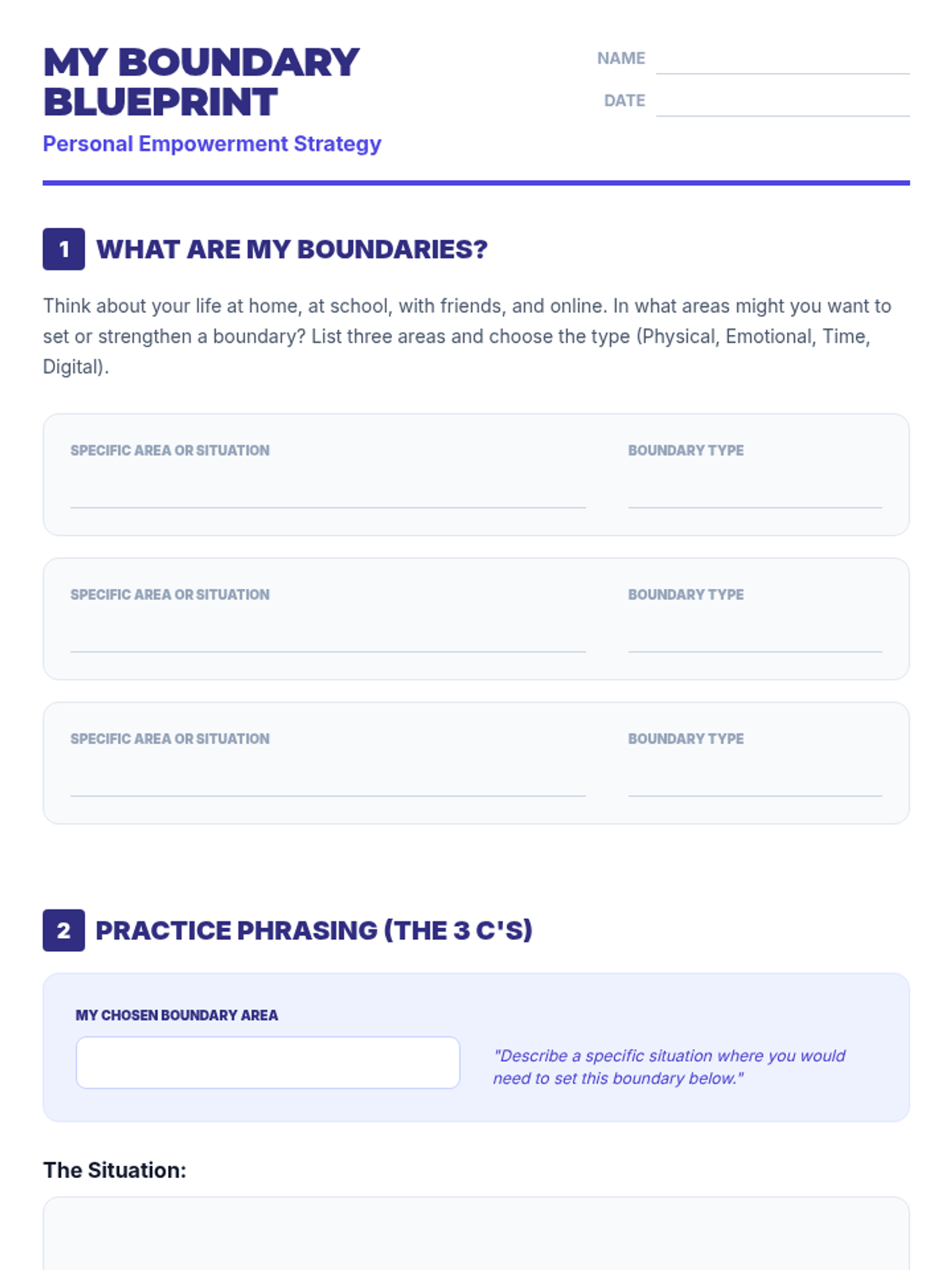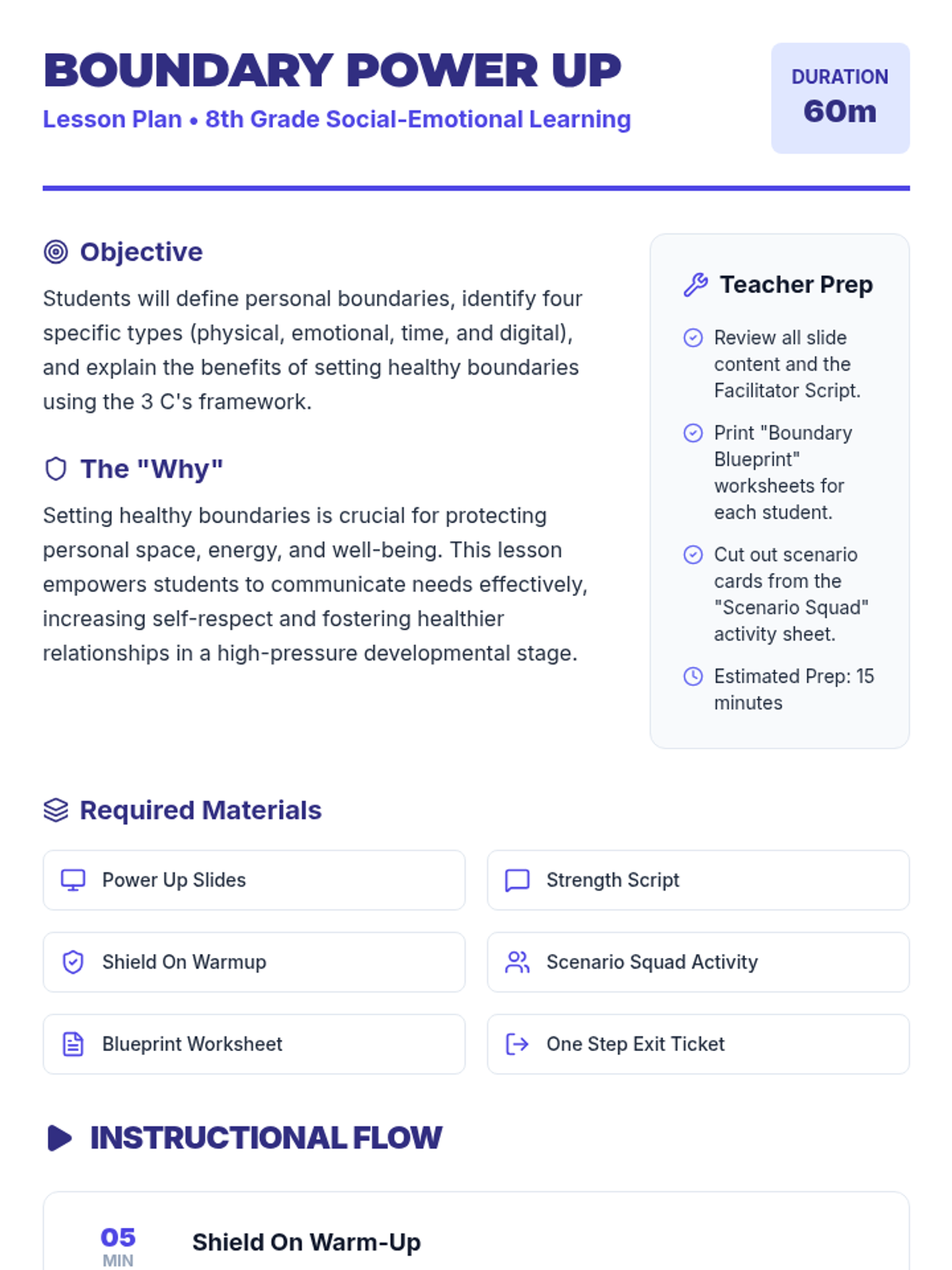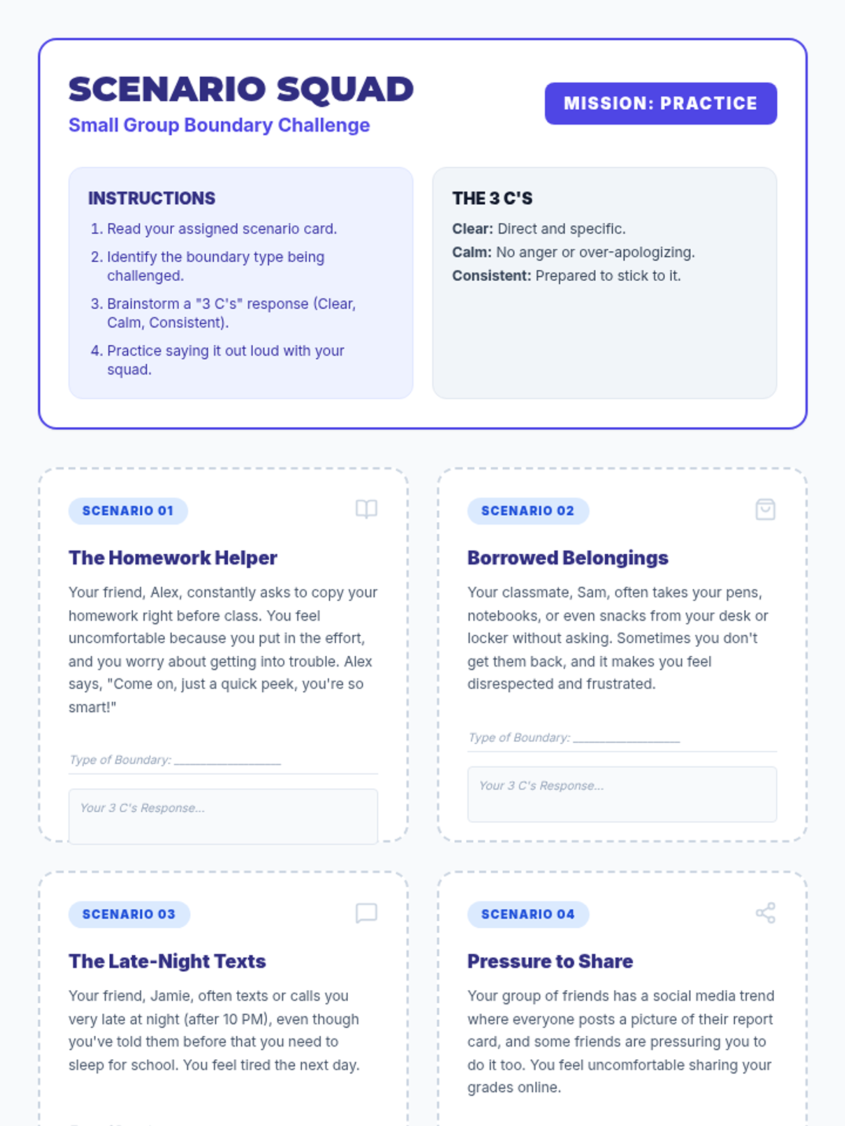 An empowering 60-minute small group lesson for 8th graders on defining and setting healthy physical, emotional, time, and digital boundaries. students will learn the '3 Cs' (Clear, Calm, Consistent) and practice applying them to real-life scenarios.