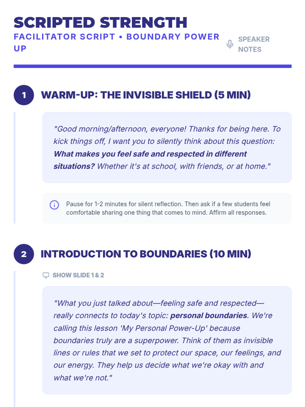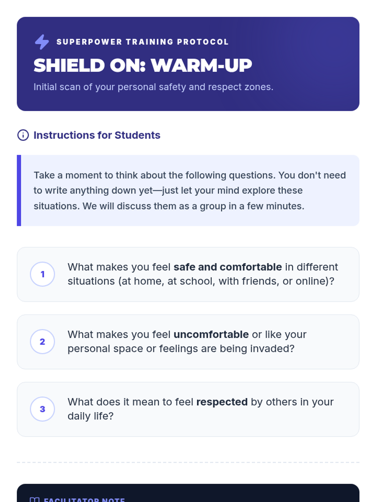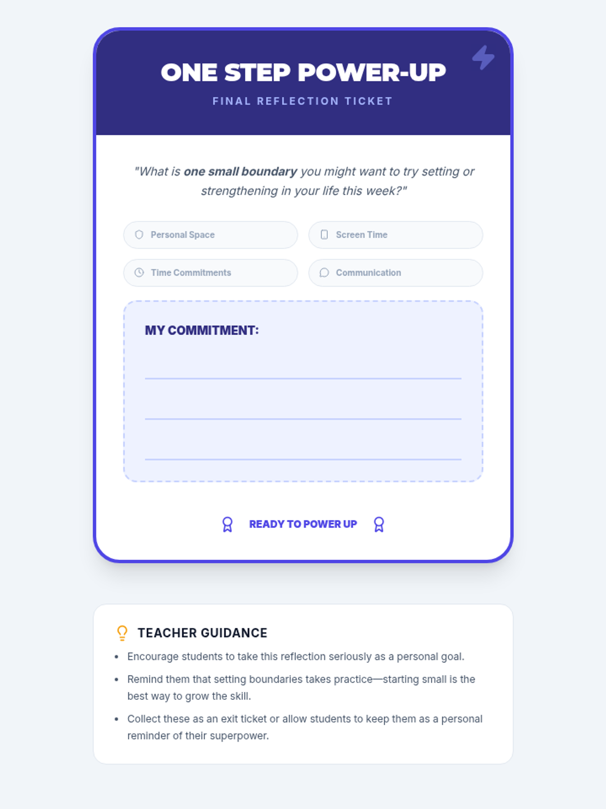 An empowering 60-minute small group lesson for 8th graders on defining and setting healthy physical, emotional, time, and digital boundaries. students will learn the '3 Cs' (Clear, Calm, Consistent) and practice applying them to real-life scenarios.