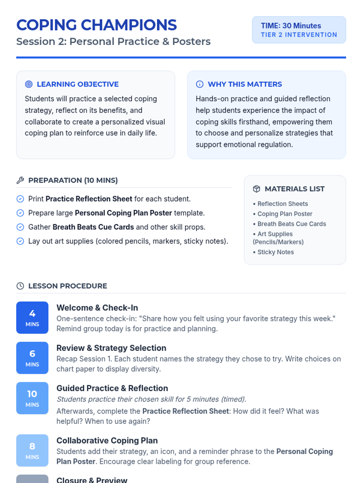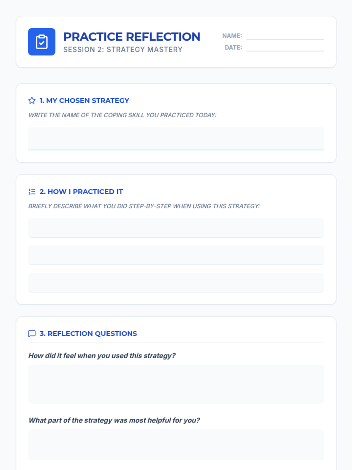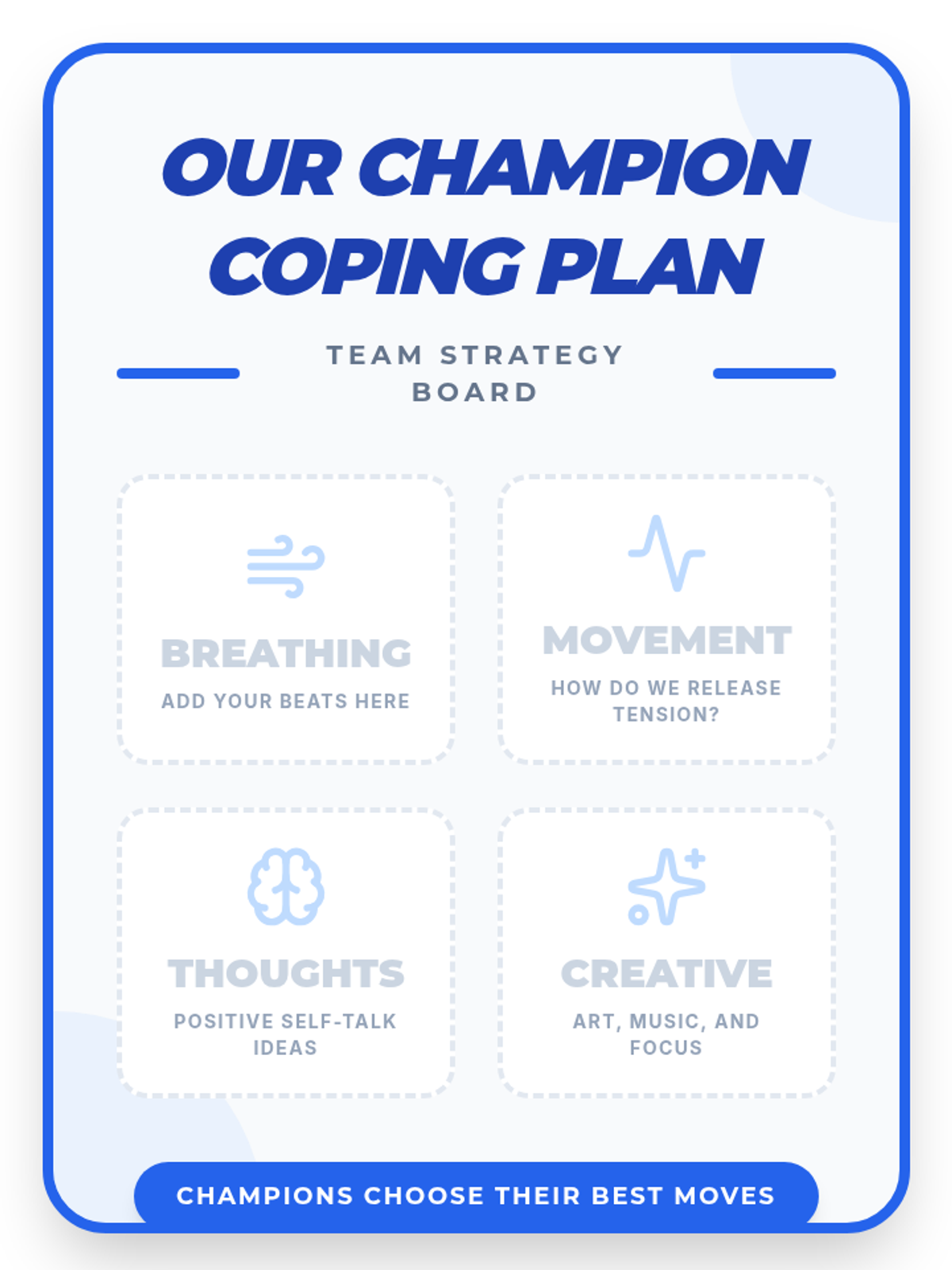 Students will practice a selected coping strategy, reflect on its benefits, and collaborate to create a personalized visual coping plan to reinforce use in daily life.