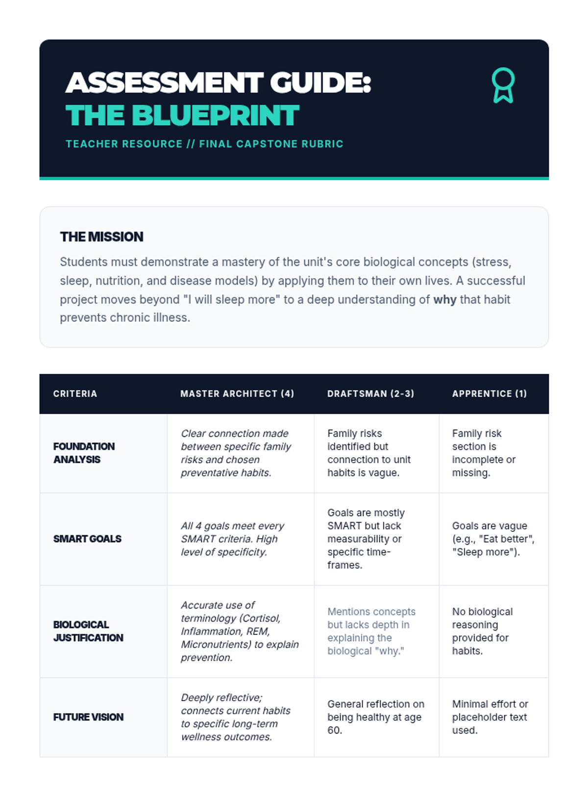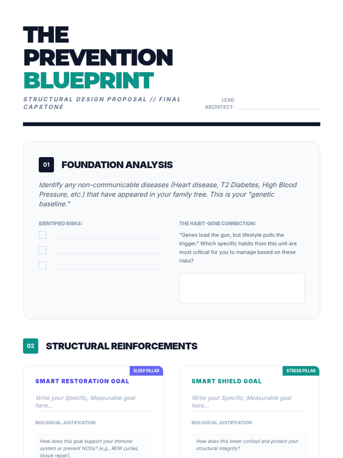 Students synthesize their learning to create a personalized 'Disease Prevention Blueprint' that addresses their specific family history and lifestyle risks. They set SMART goals for hygiene, sleep, stress, and activity to build long-term resilience.