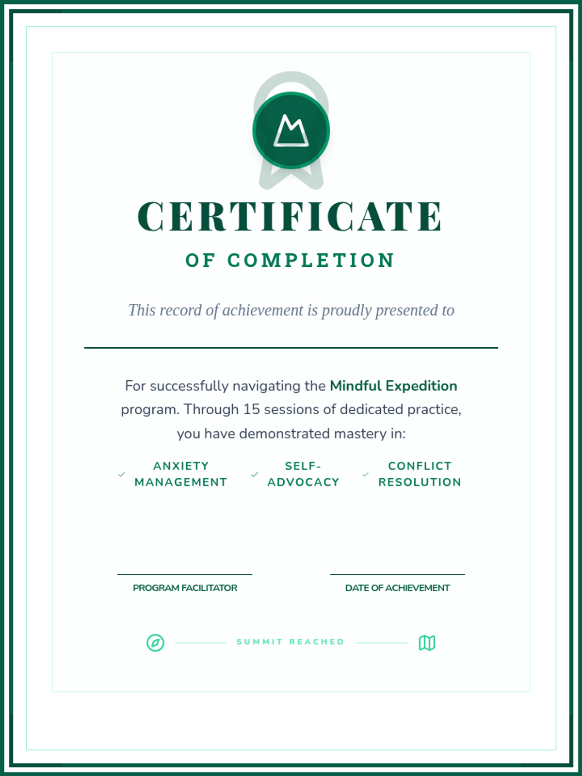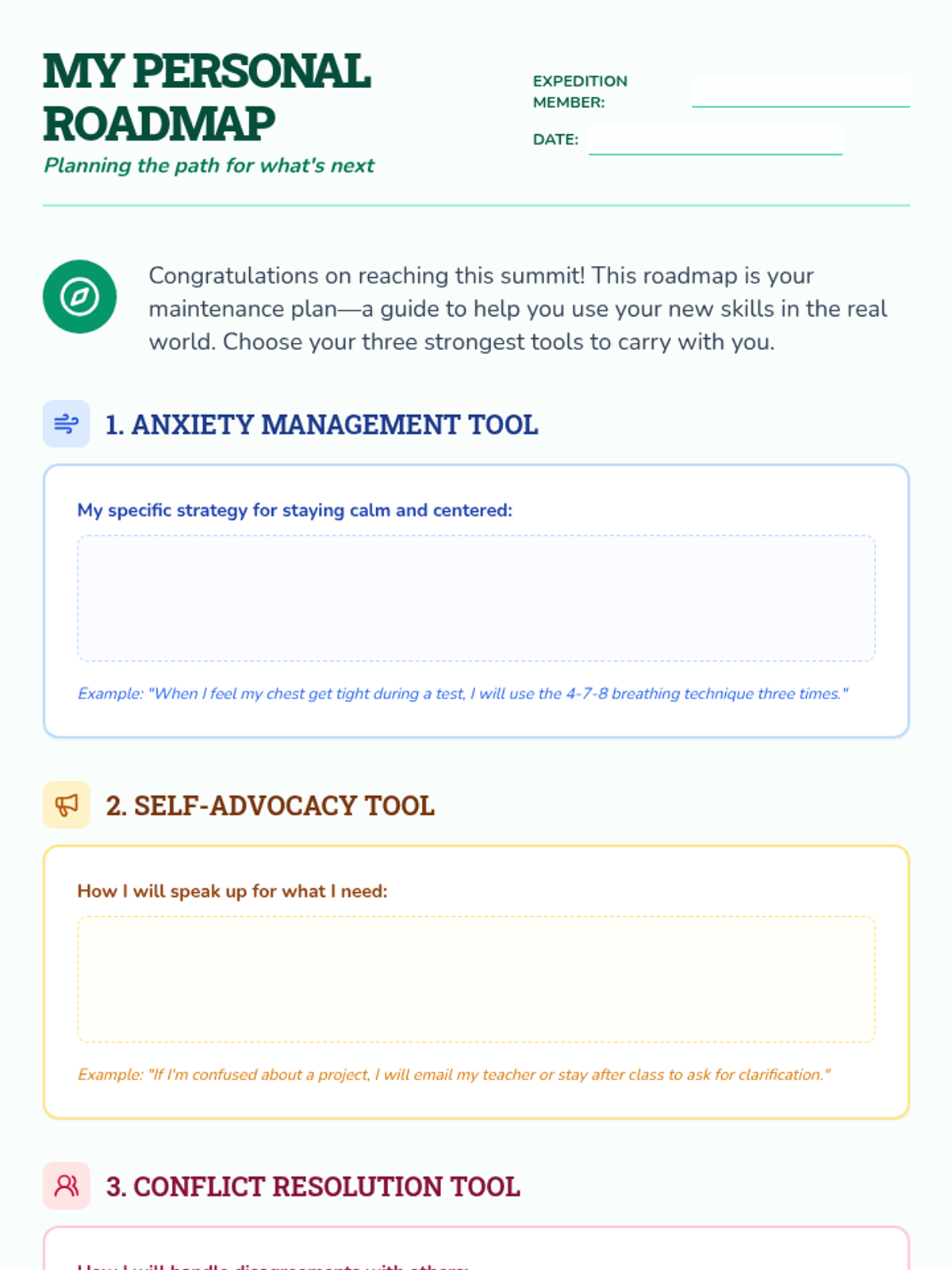 Students synthesize their learning into a concrete personal maintenance plan, focusing on anxiety management, self-advocacy, and conflict resolution as they transition out of the formal program.