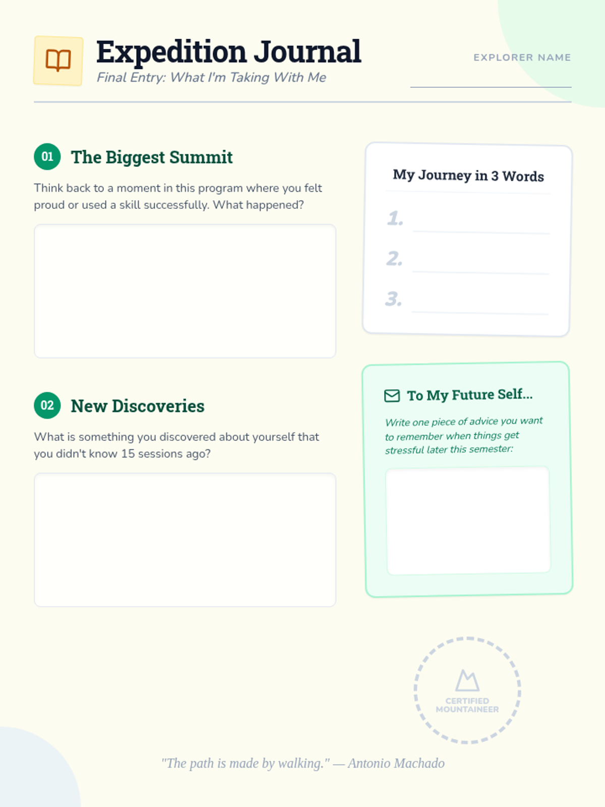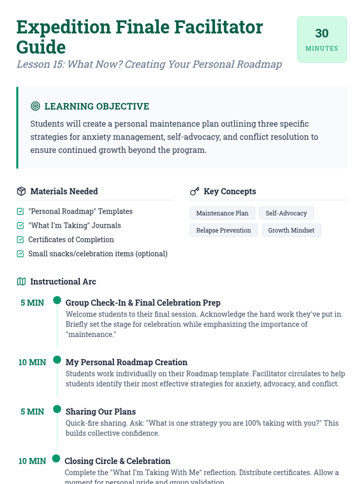 The final session focuses on long-term maintenance and 'relapse prevention.' Students will create a take-home survival kit and celebrate their growth within the collective.