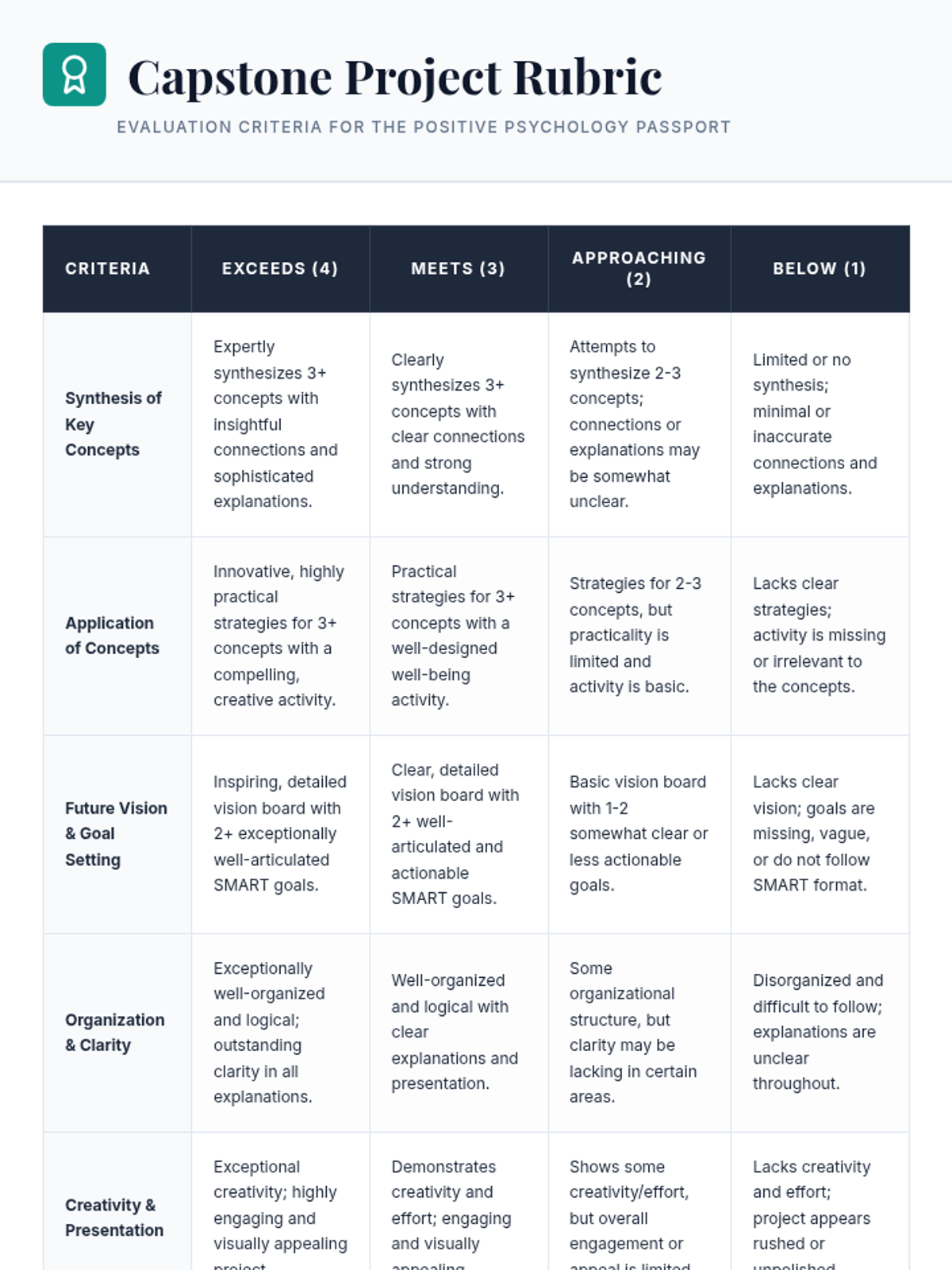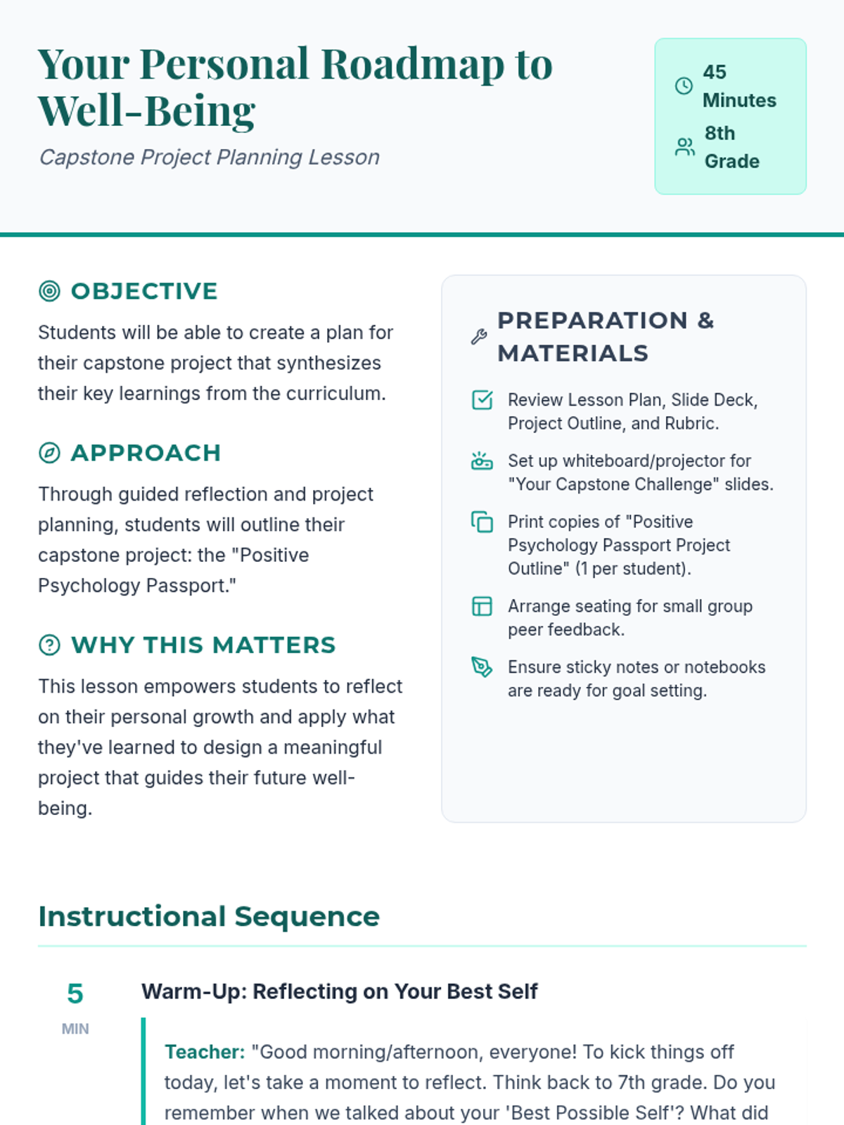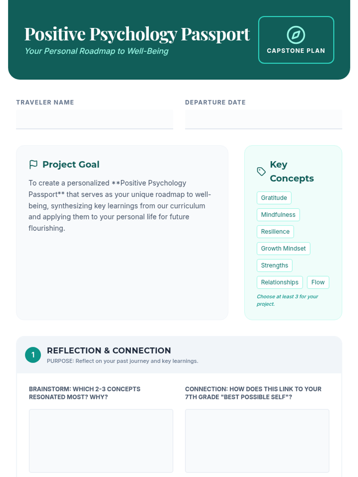 A 45-minute capstone planning lesson where 8th graders design a 'Positive Psychology Passport' to synthesize their well-being journey and plan for future flourishing.