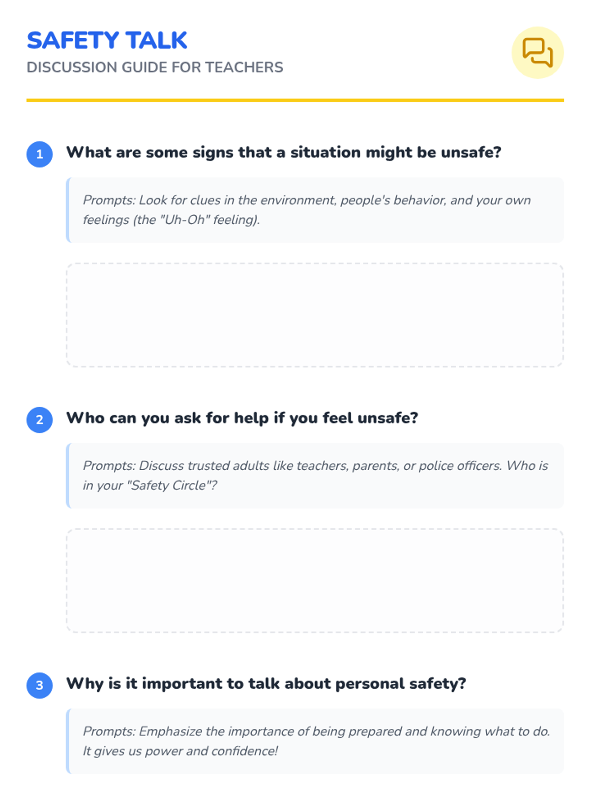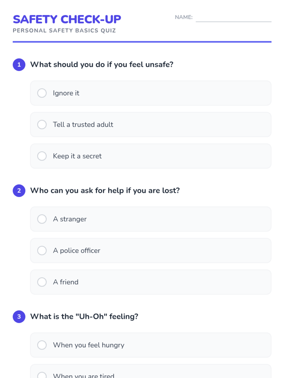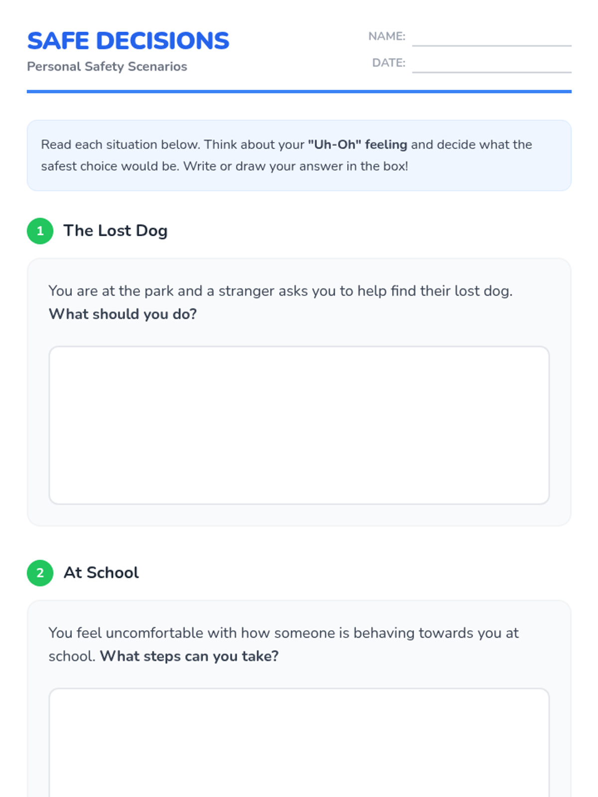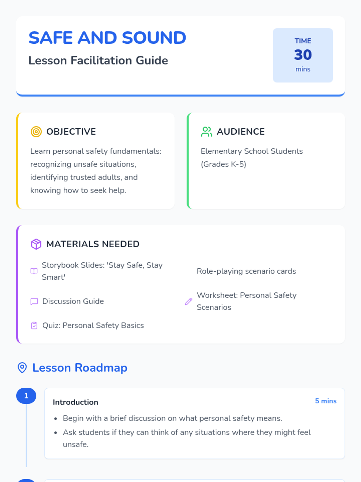 This lesson introduces elementary school students to the basics of personal safety through engaging stories and role-playing activities. Students will learn to recognize unsafe situations and understand how to seek help when needed.