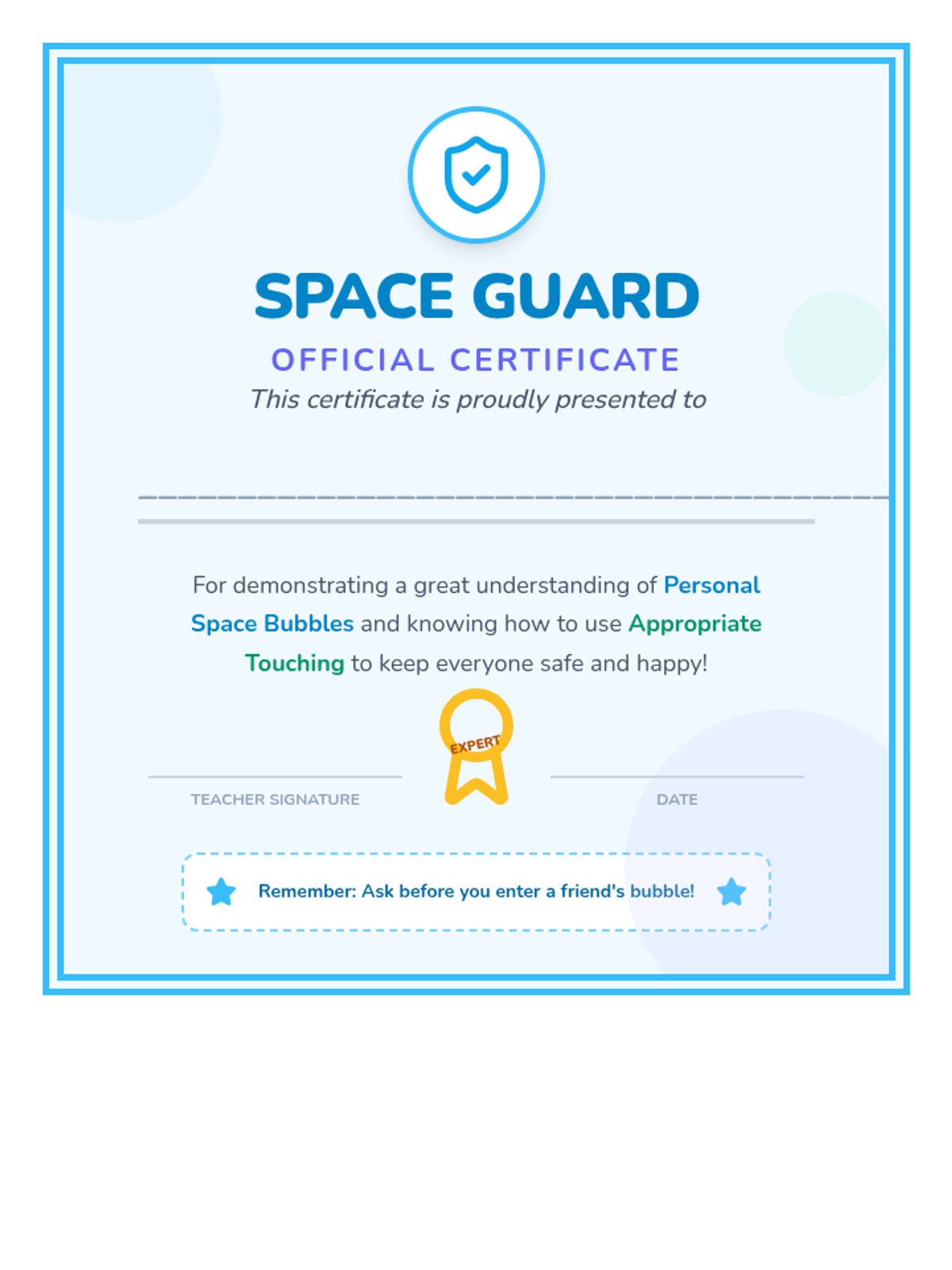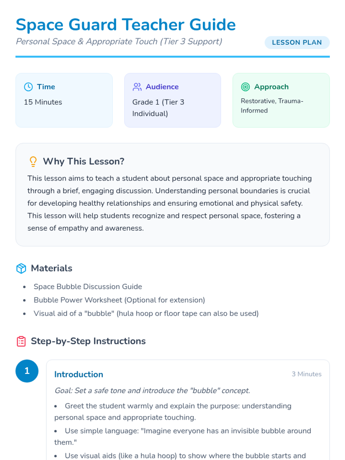 A brief, restorative lesson for Grade 1 students to understand personal boundaries, the concept of a 'personal bubble,' and appropriate touching.