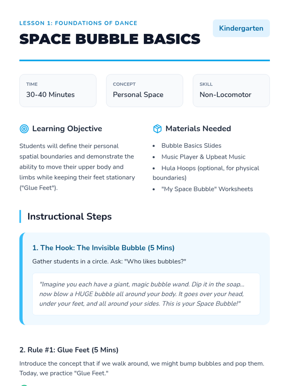 Students explore the concept of 'personal space' by visualizing a protective bubble around their bodies while practicing non-locomotor movements.
