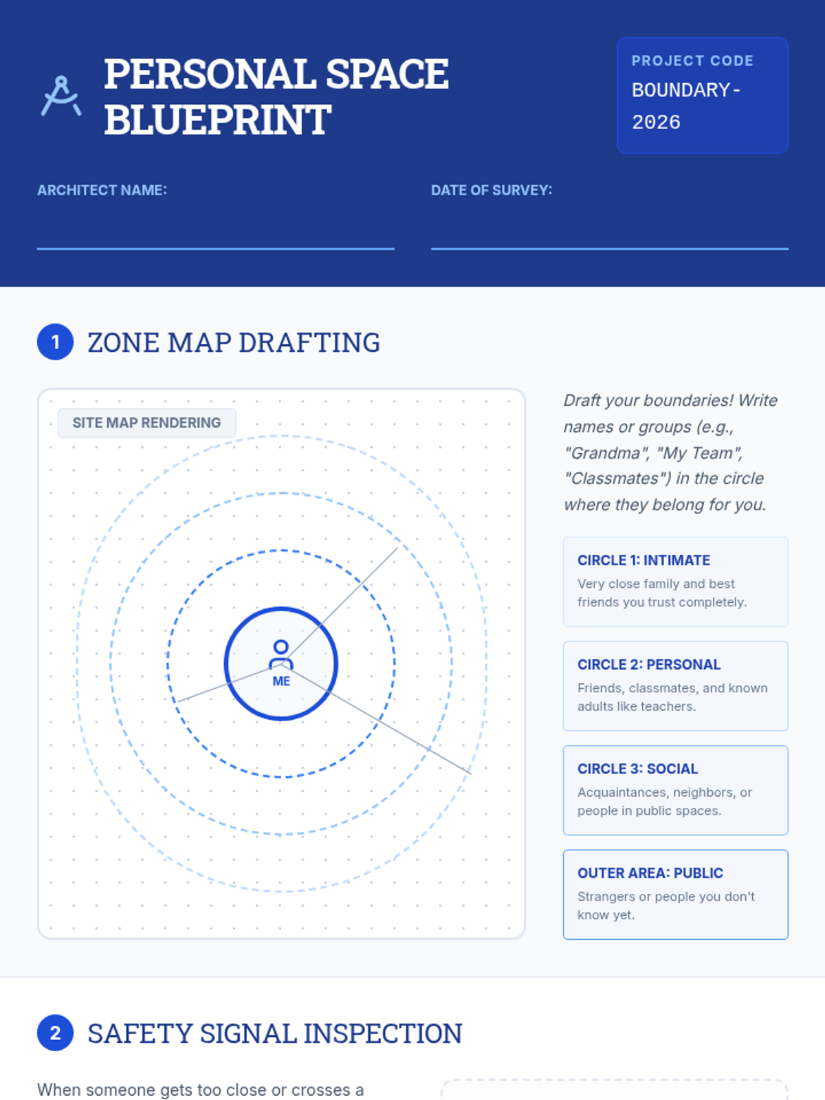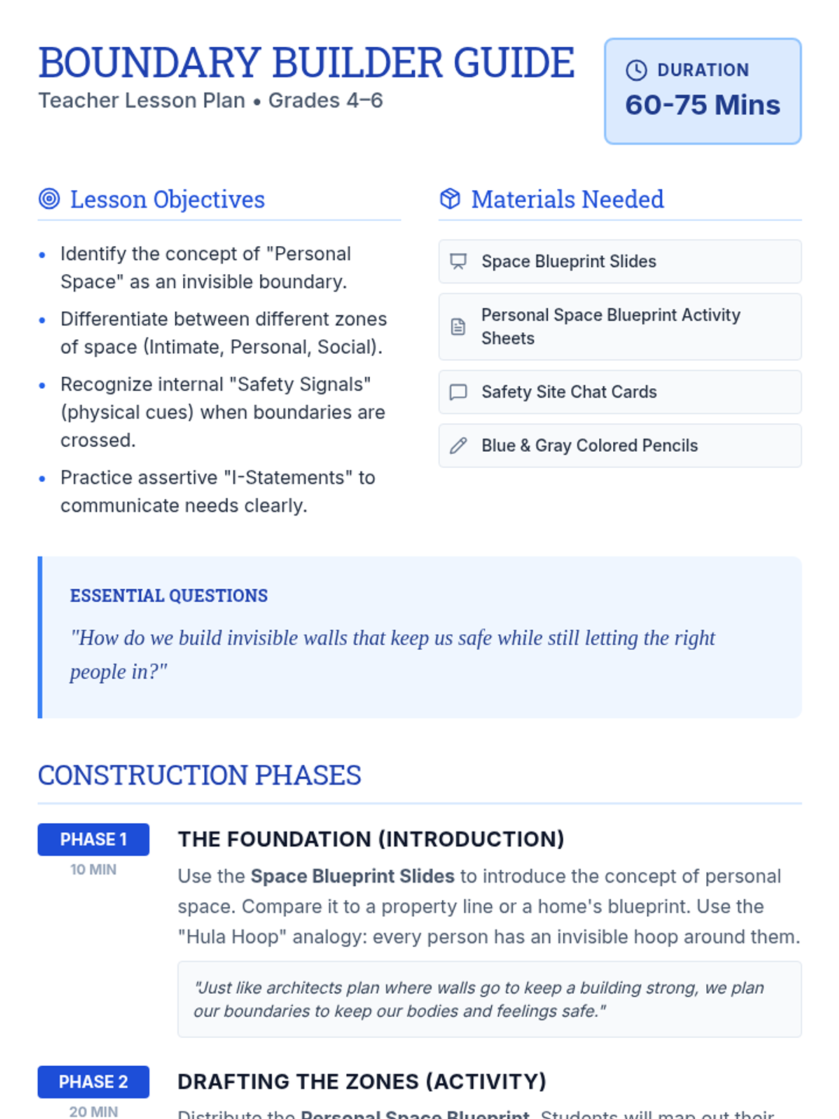 A comprehensive lesson helping 4th-6th graders understand, visualize, and communicate their personal boundaries using an architectural blueprint theme. Students will create their own personal space maps and practice assertive communication.