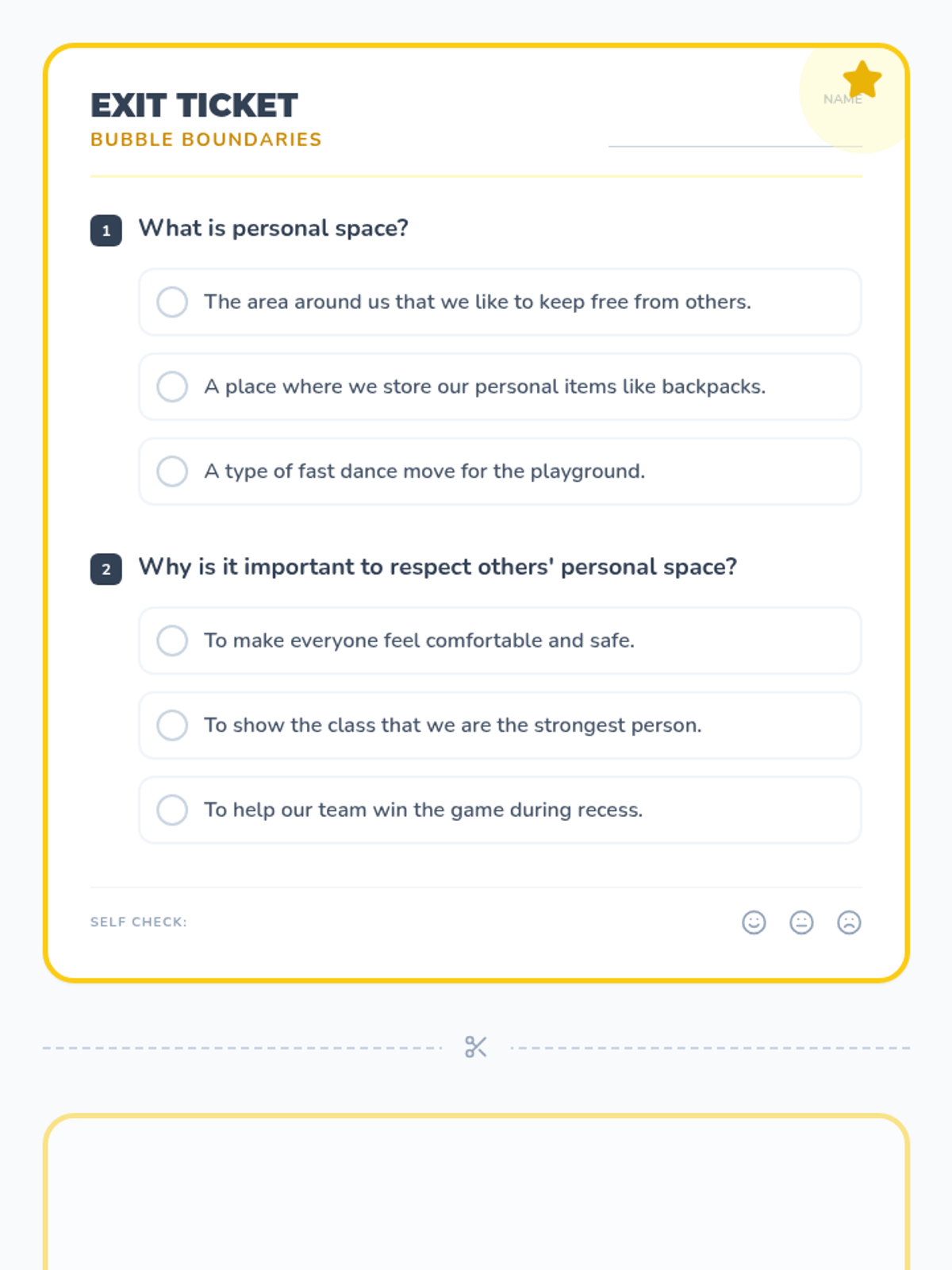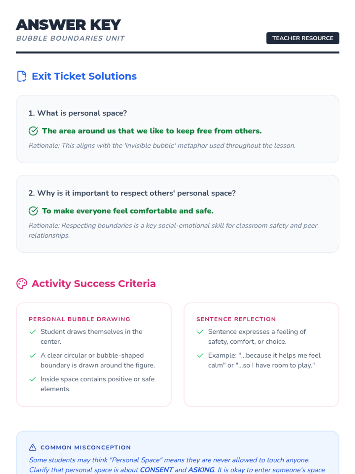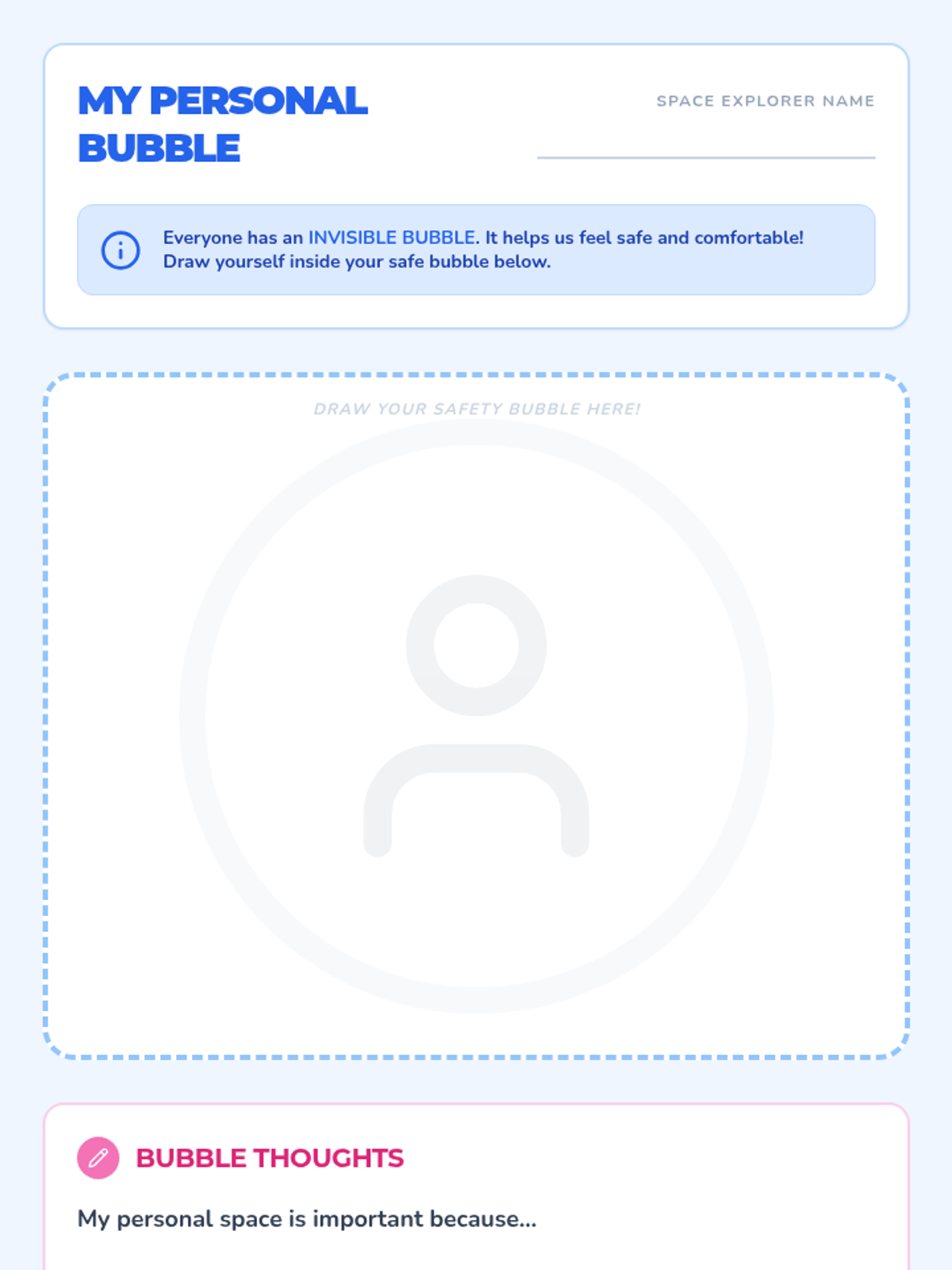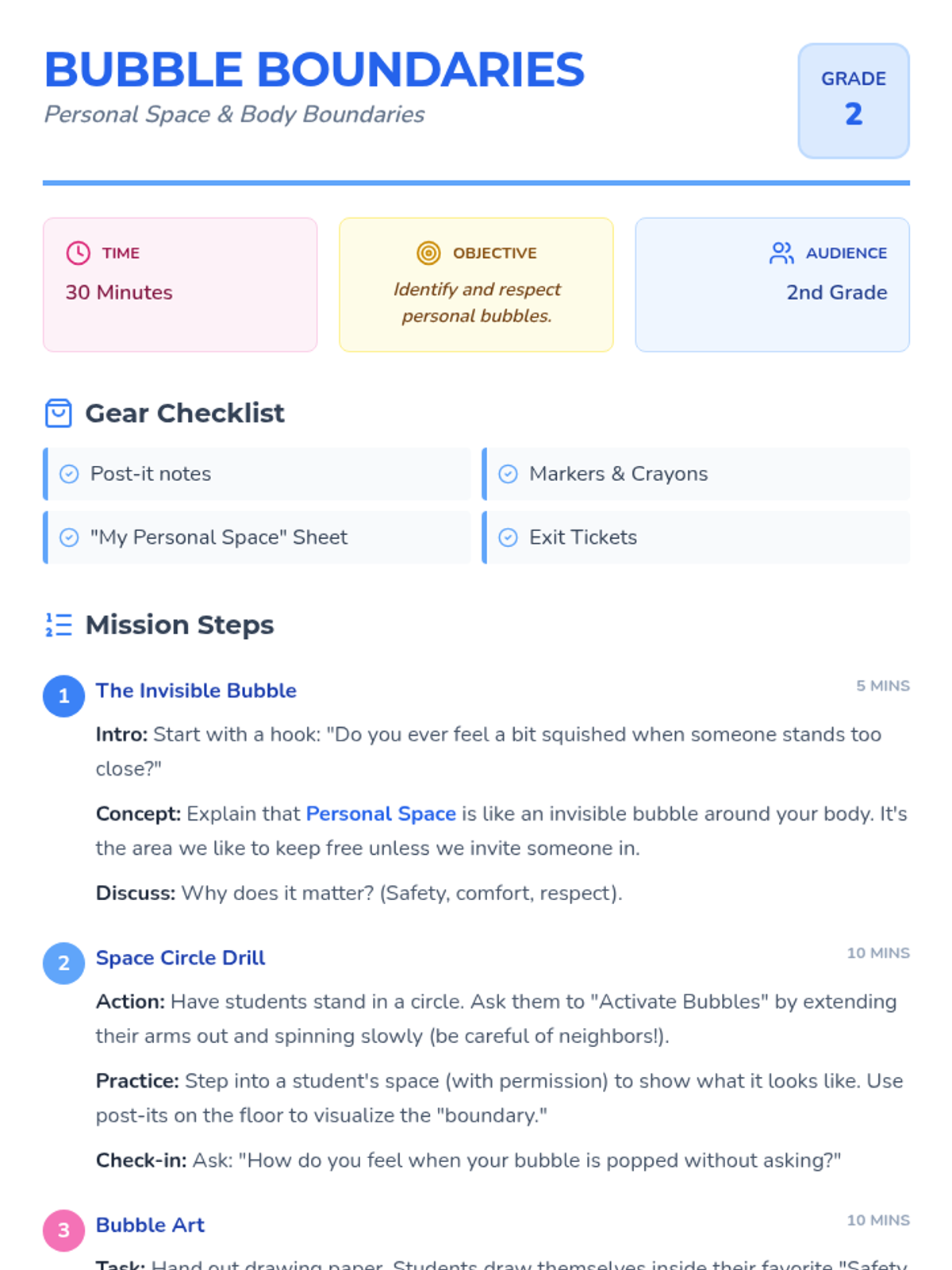 A social-emotional learning lesson for second graders focused on understanding and respecting personal space and body boundaries using the 'personal bubble' concept.