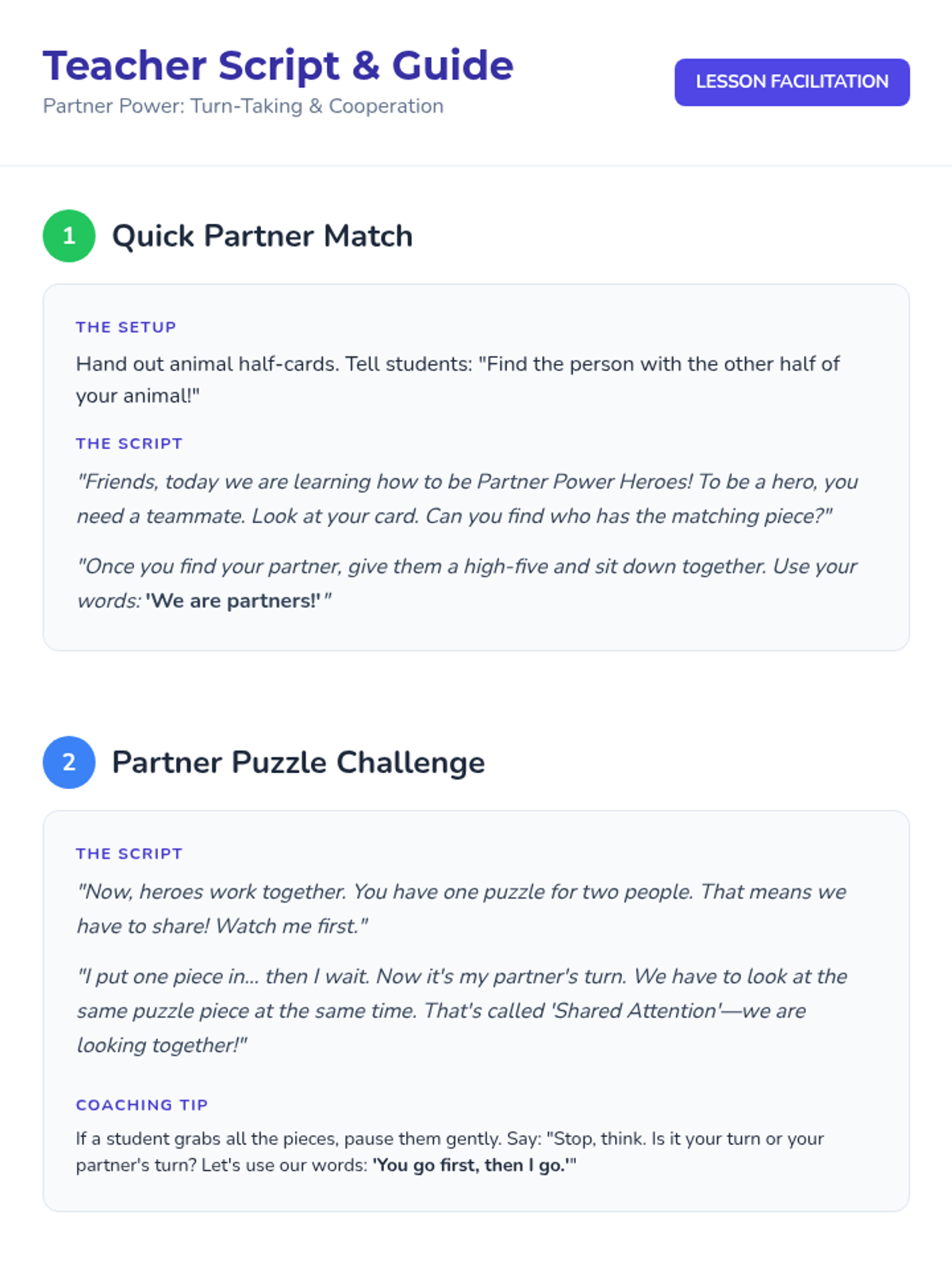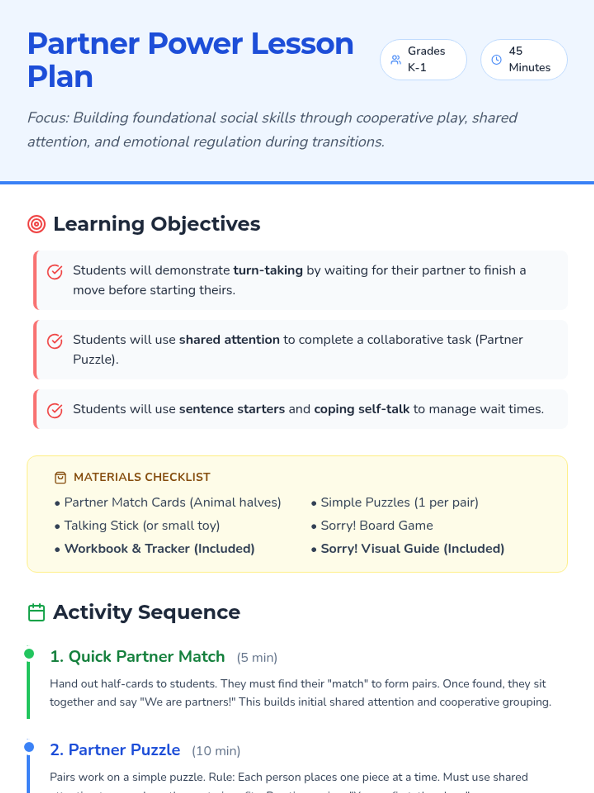 A comprehensive social skills lesson for Kindergarten and 1st grade focused on turn-taking, shared attention, and cooperative play using partner puzzles and the game Sorry!