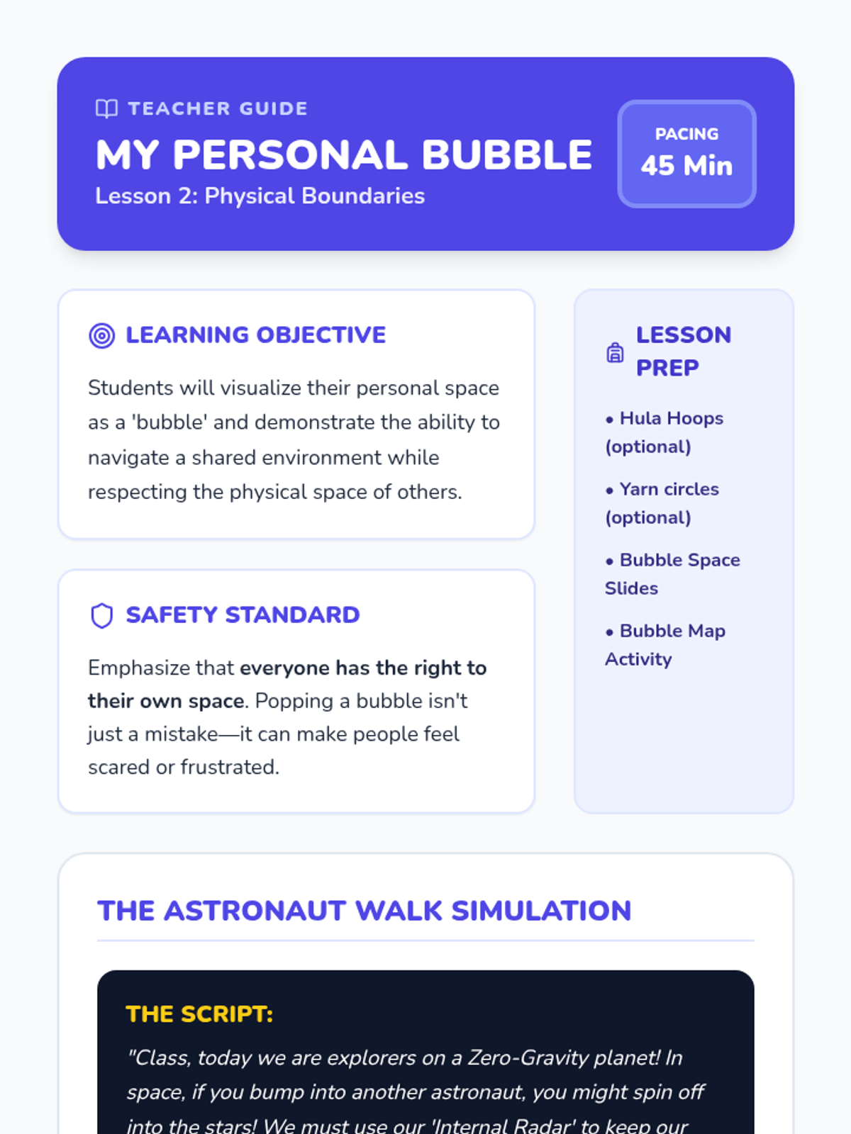 Students visualize personal space as a 'bubble' and practice navigating their environment while respecting the boundaries of others.