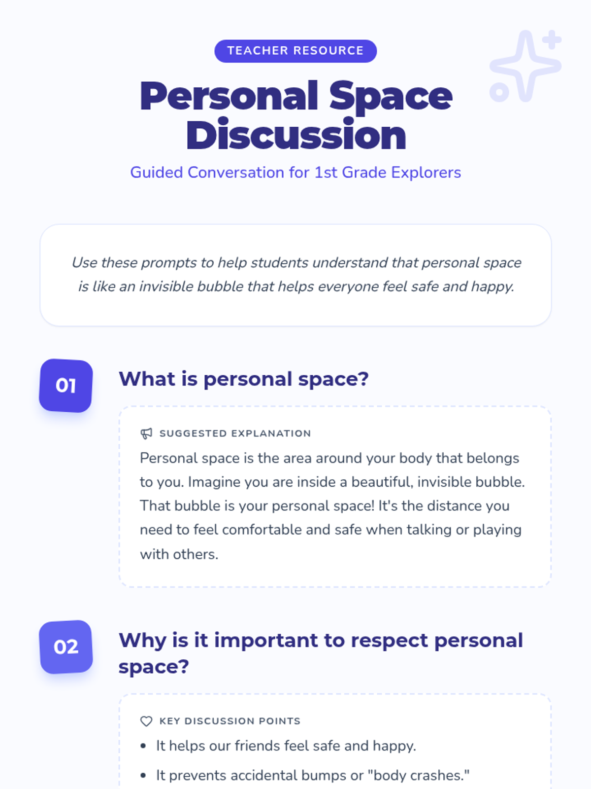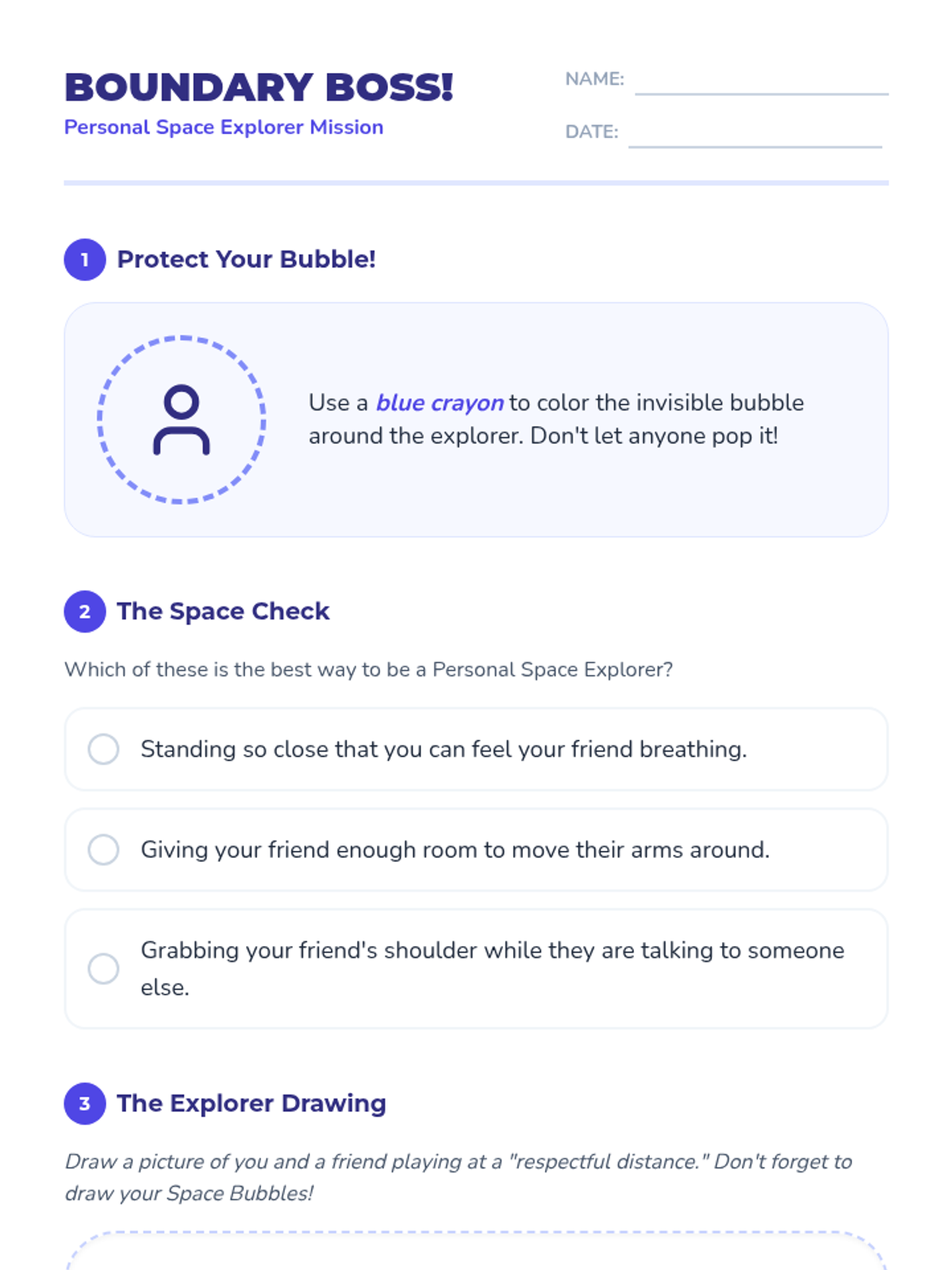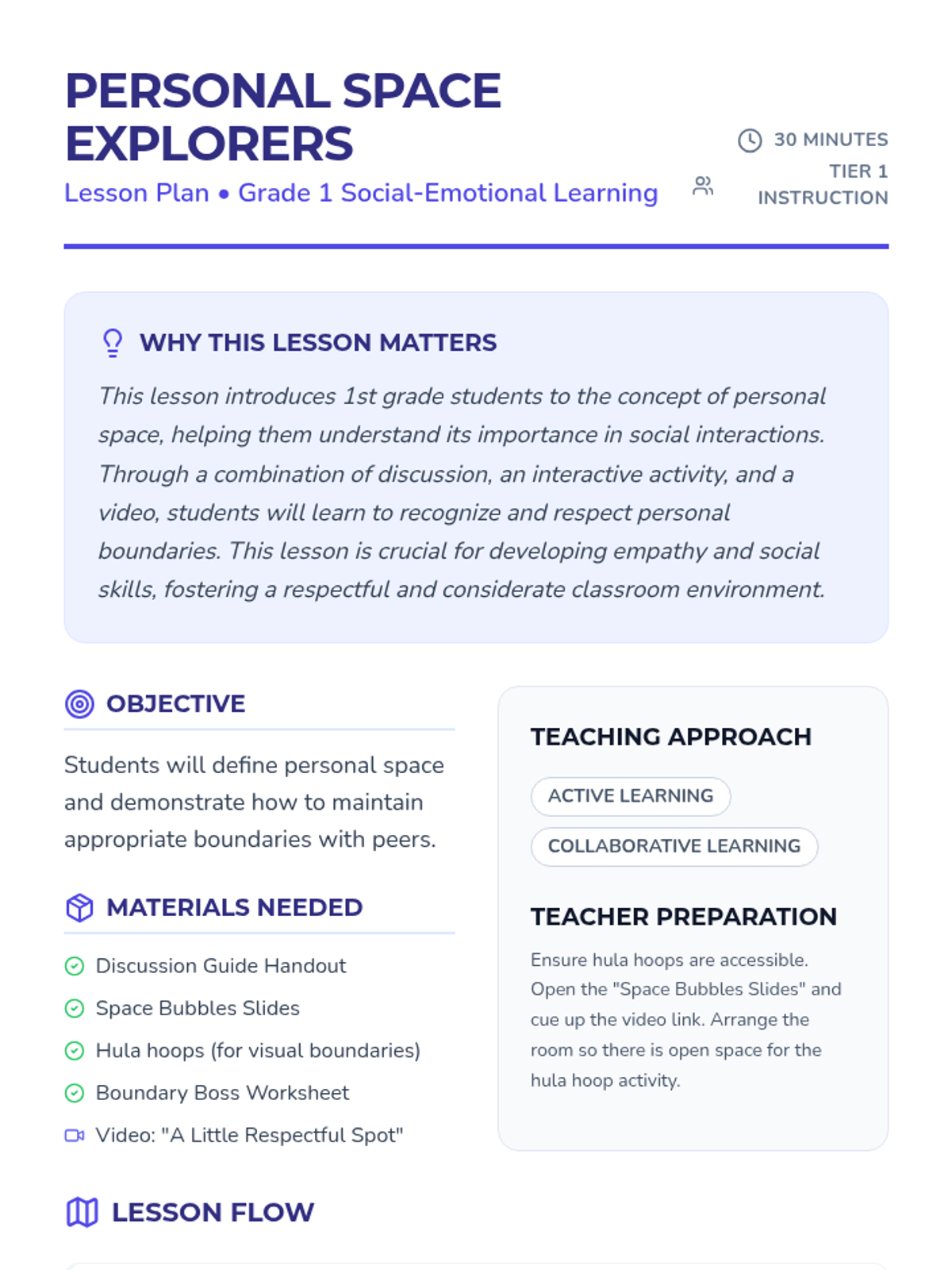 This lesson introduces 1st grade students to the concept of personal space, helping them understand its importance in social interactions. Through a combination of discussion, an interactive activity, and a video, students will learn to recognize and respect personal boundaries.