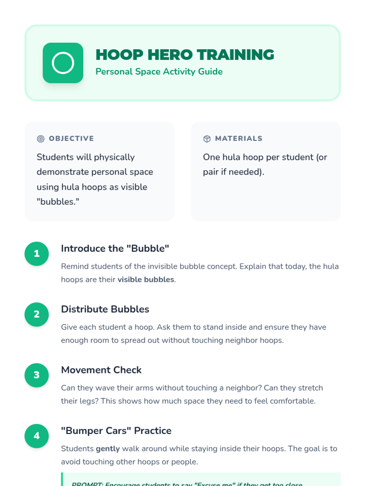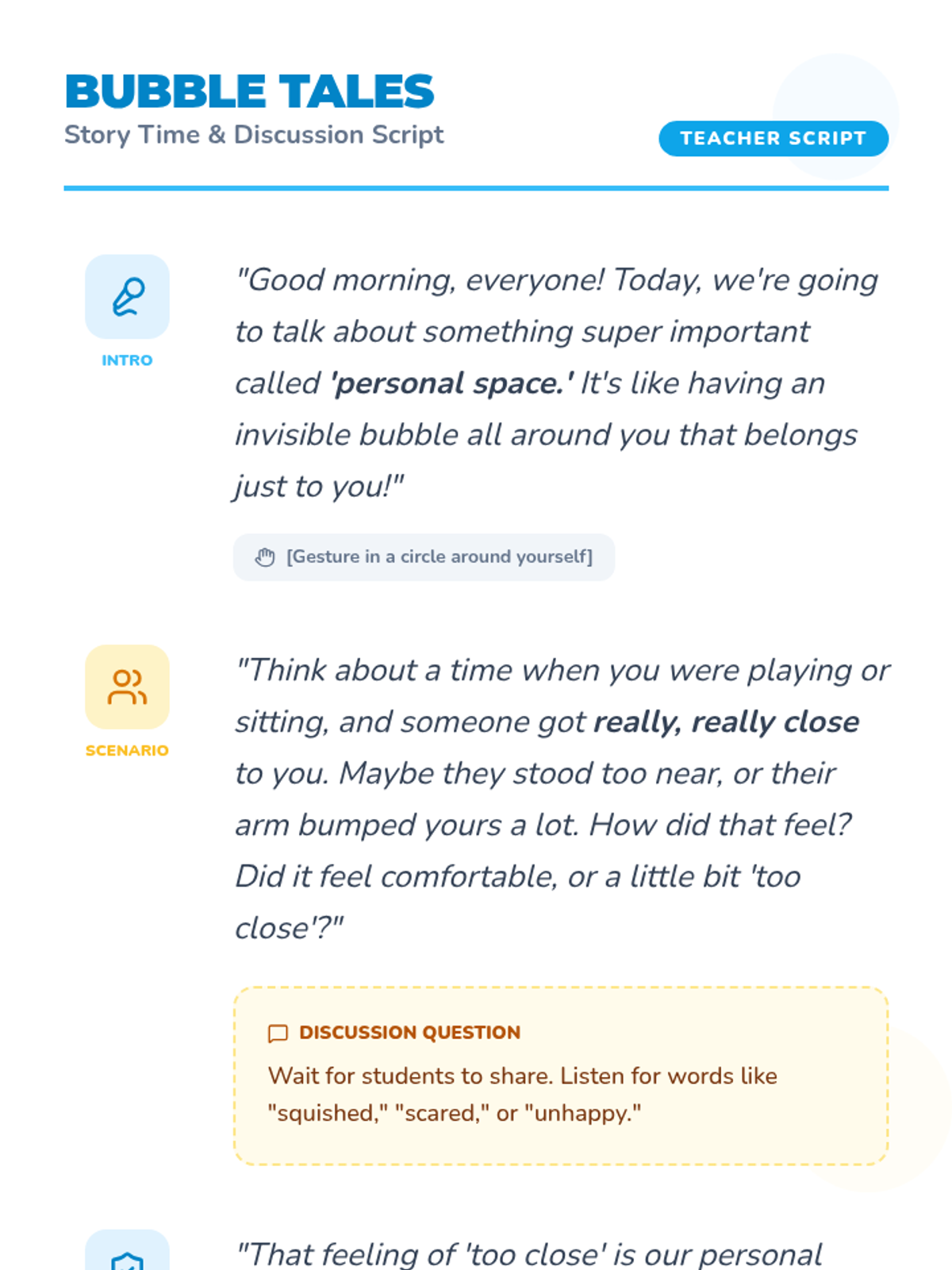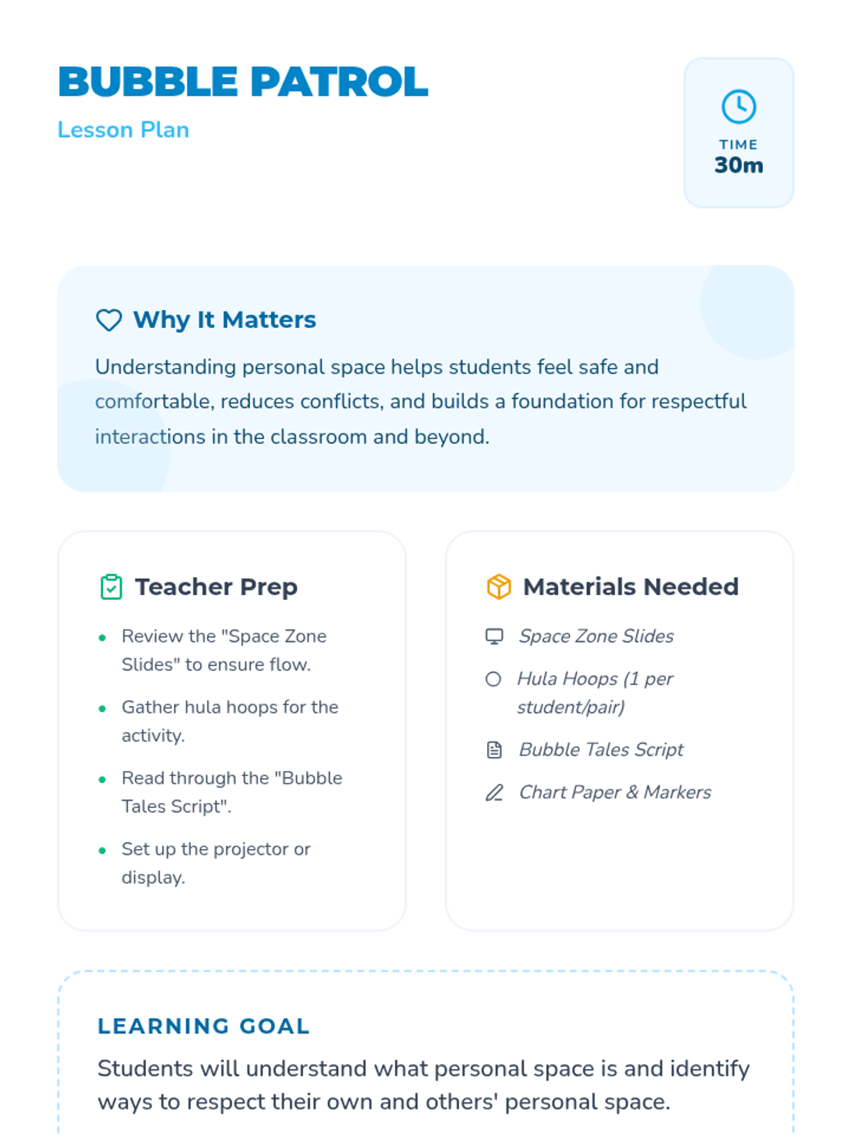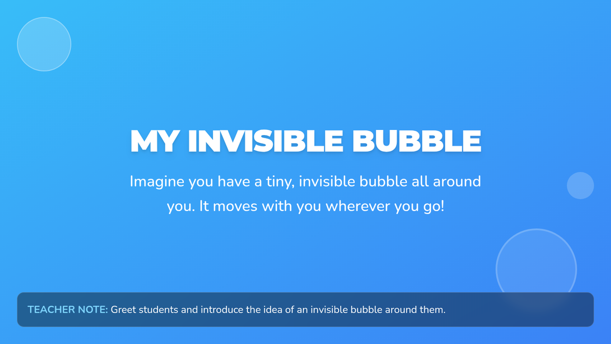 A 30-minute Kindergarten lesson introducing the concept of personal space through the 'invisible bubble' analogy, physical activities, and interactive storytelling.