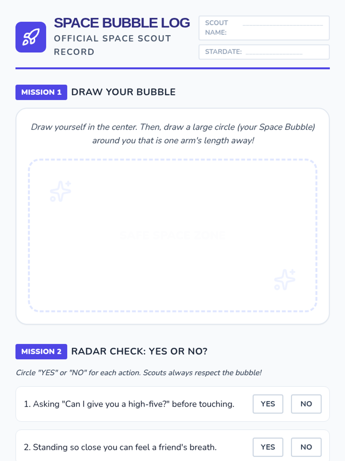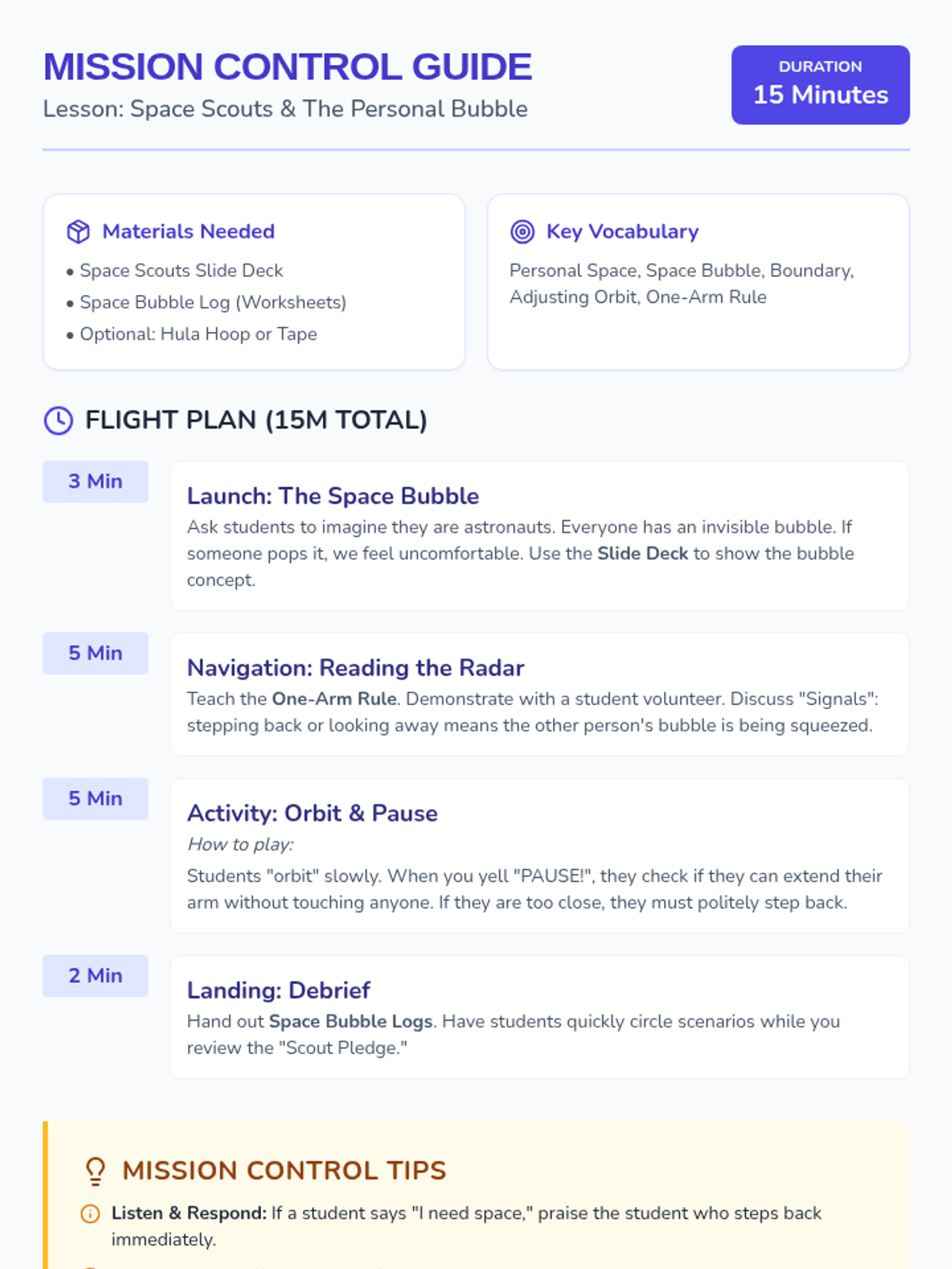 A quick-fire 15-minute lesson for 3rd graders focusing on understanding and respecting personal space using a 'Space Scouts' theme. Students learn the 'Space Bubble' concept and practice boundaries through an active movement game.