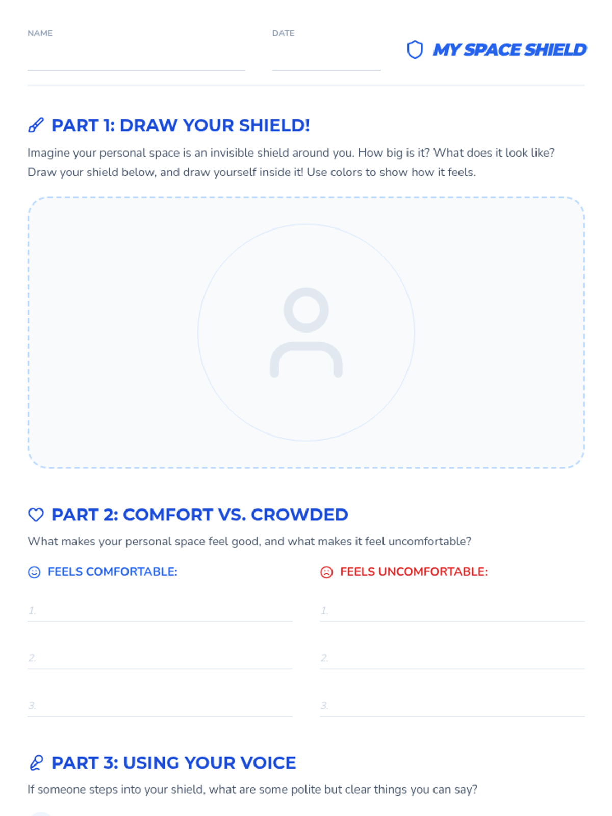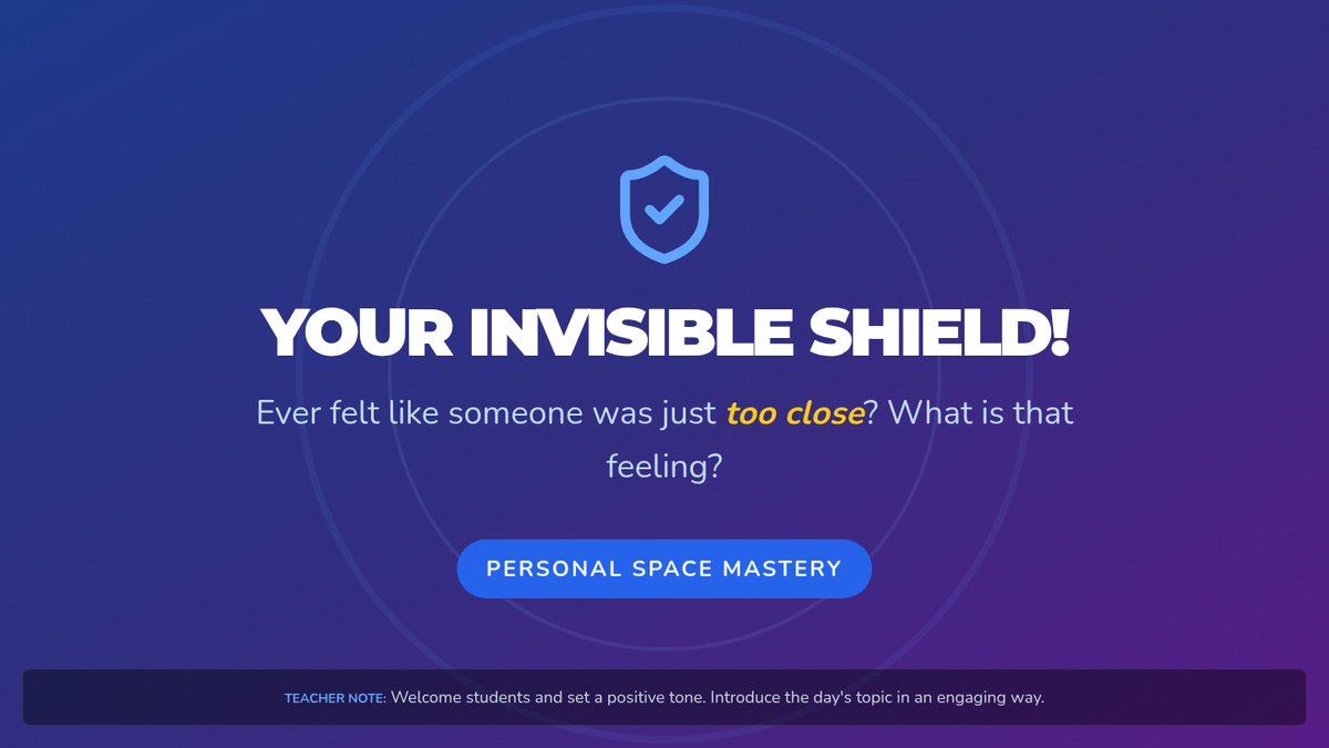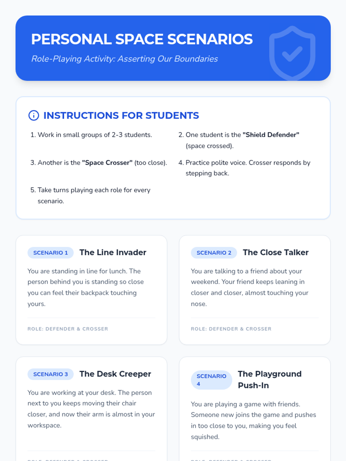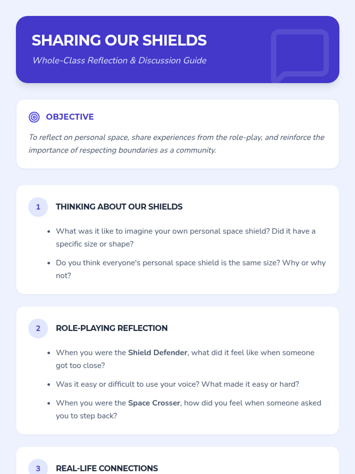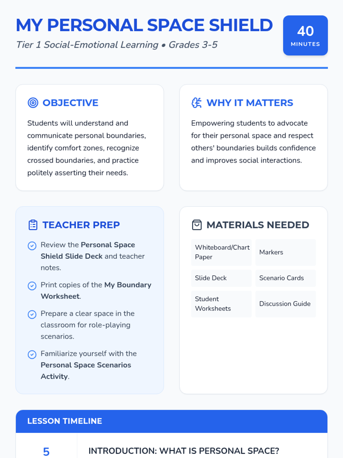 A 40-minute Tier 1 lesson for 3rd-5th graders to understand and communicate personal boundaries using the 'shield' metaphor. Students practice identifying comfort zones and politely asserting their needs through role-play and visualization.