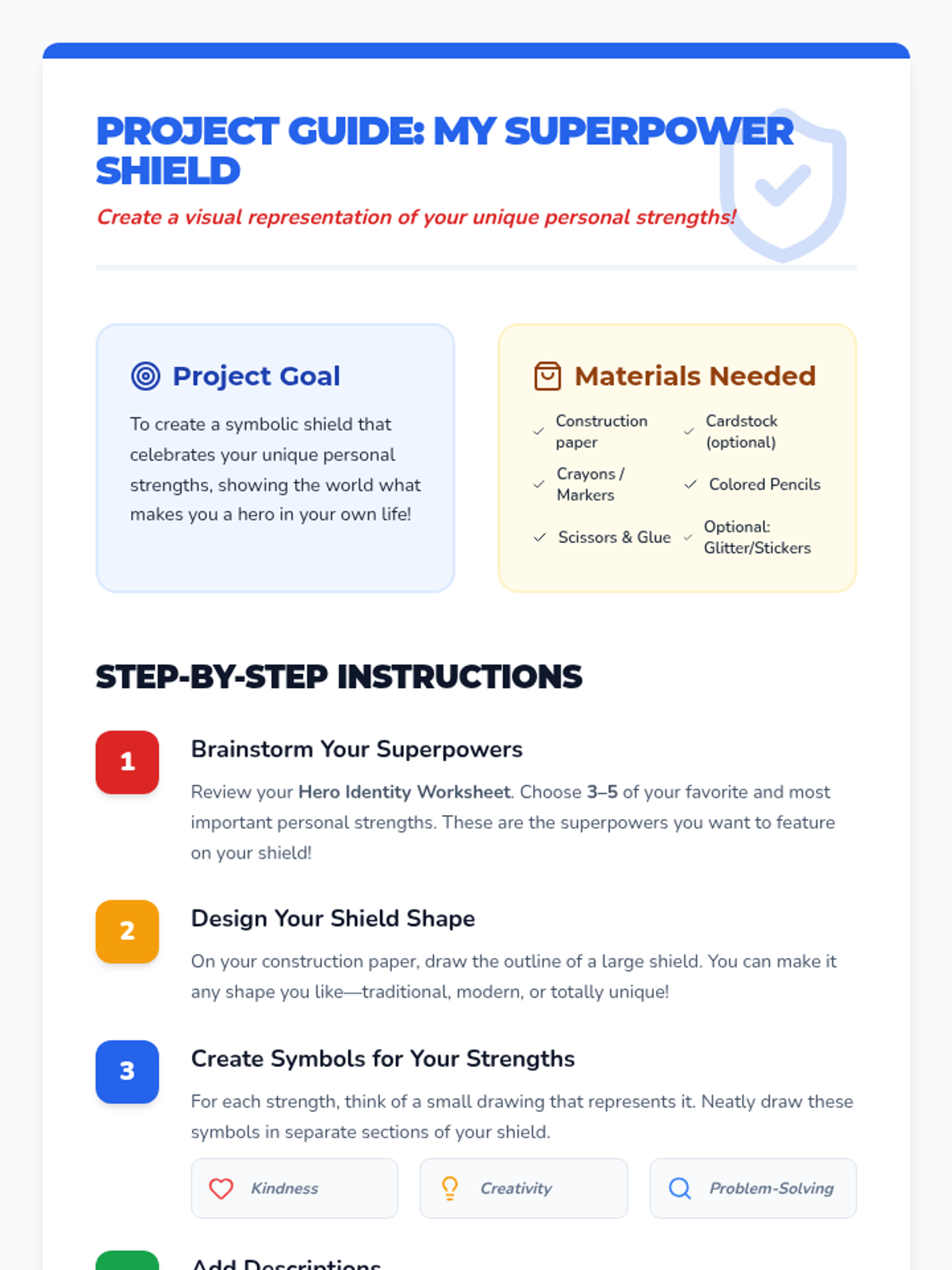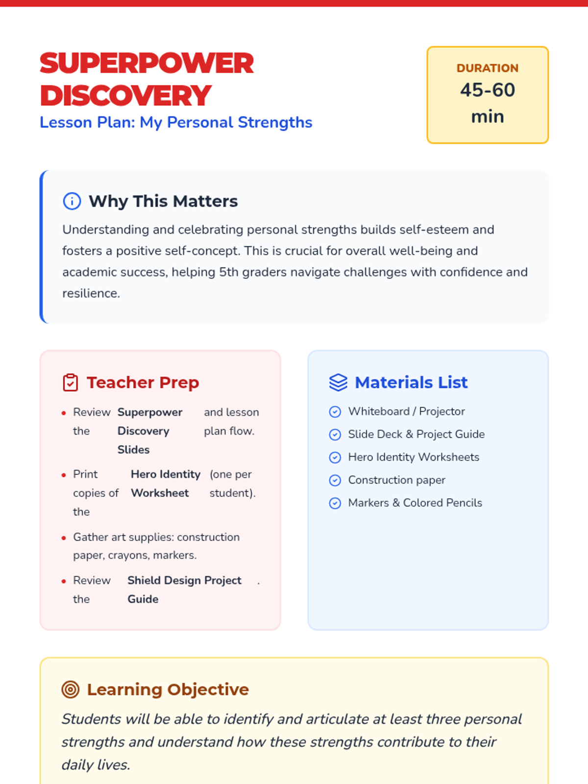 This lesson empowers 5th graders to identify and celebrate their unique personal strengths through the lens of 'superpowers'. Students will reflect on their qualities, document them in a hero profile, and design a symbolic shield representing their character strengths.