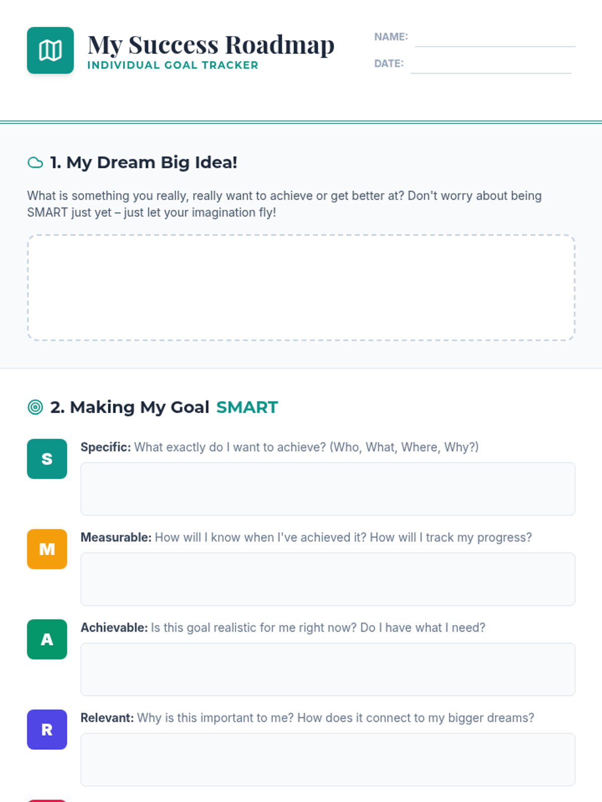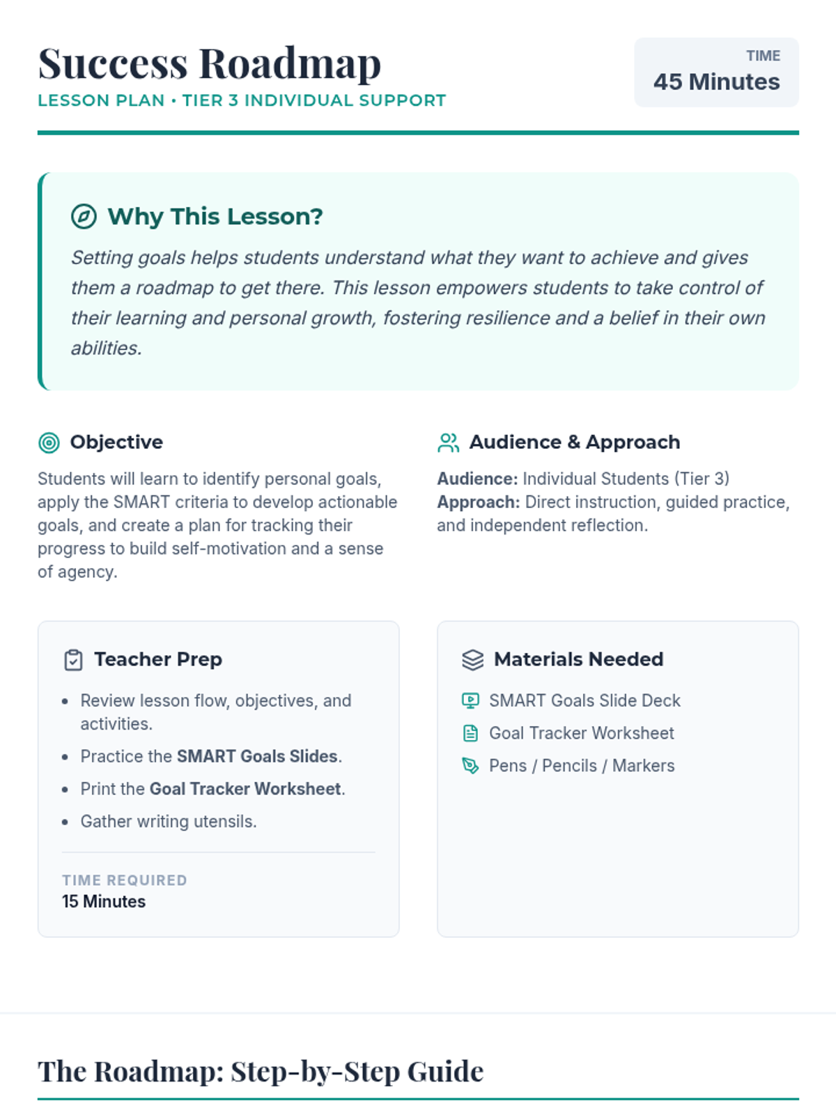 A Tier 3 individual lesson designed to help students set SMART goals and develop a personalized roadmap for success and self-motivation.