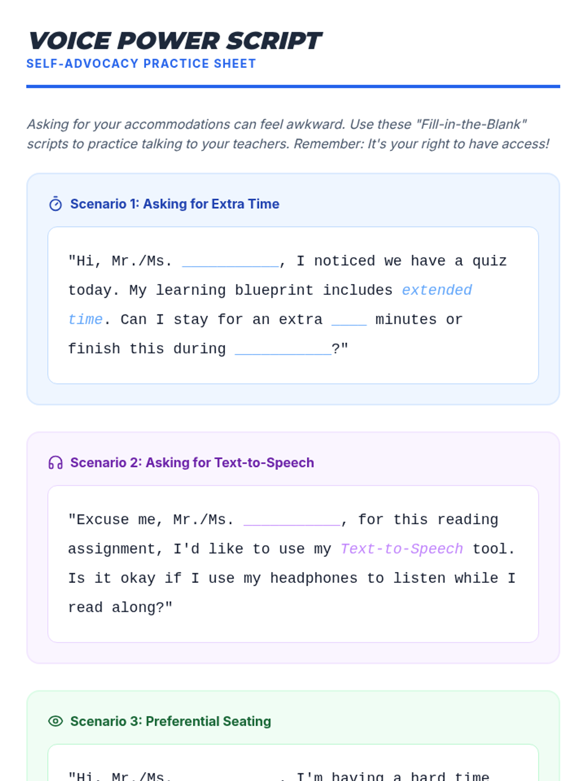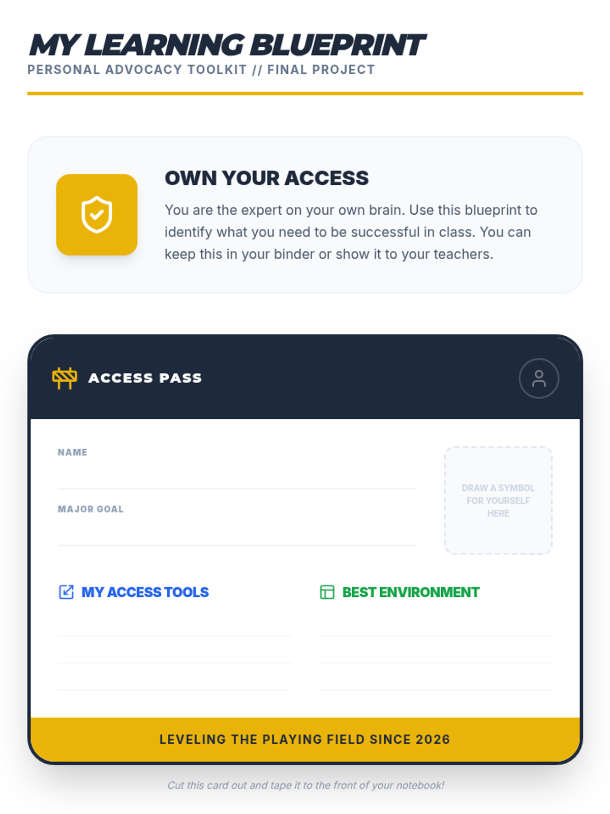 Students identify their own needs and create a personal advocacy tool to communicate their accommodations to teachers effectively.