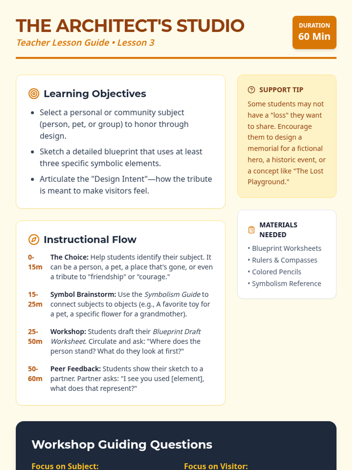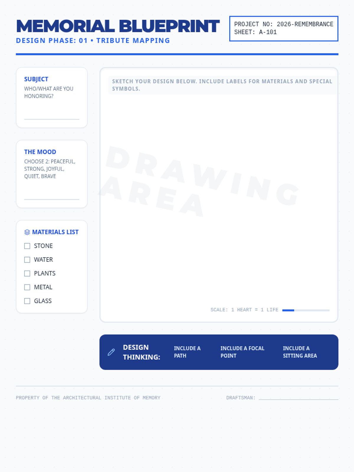 Students transition from analysis to creation, drafting blueprints for a personal or community tribute using symbolic materials and shapes.