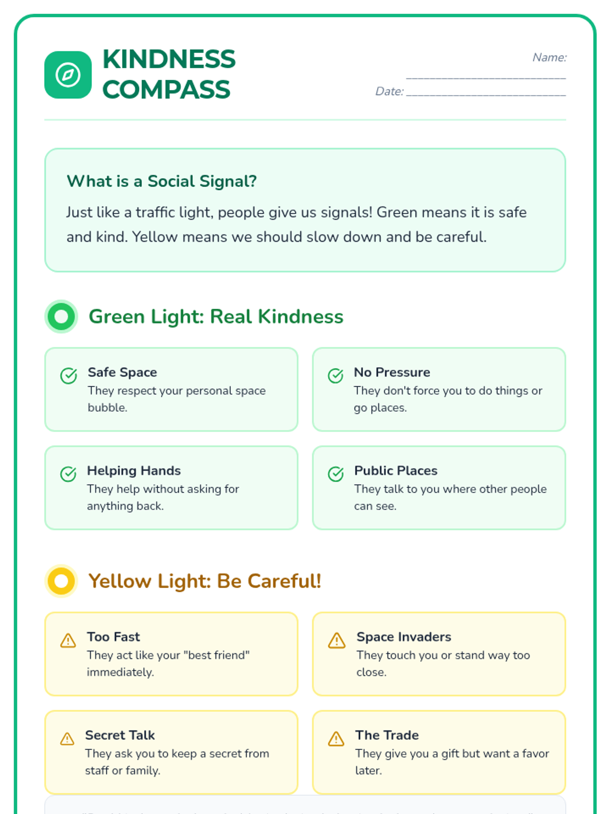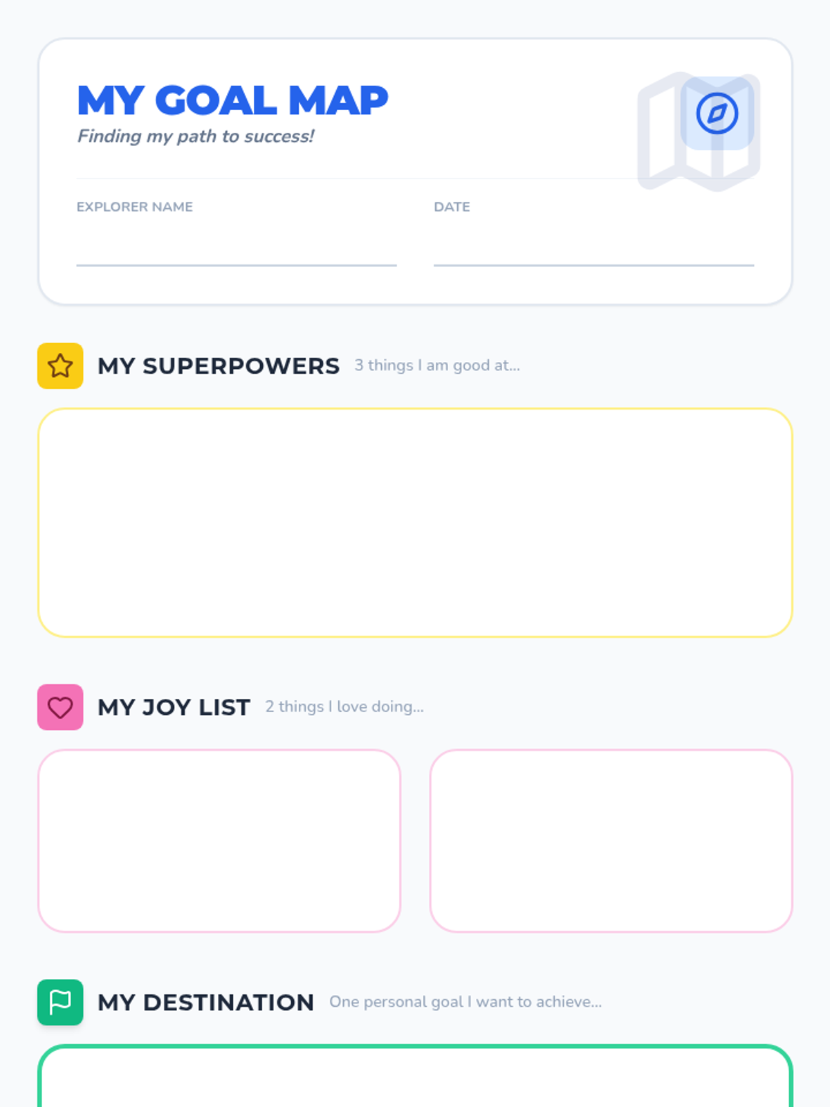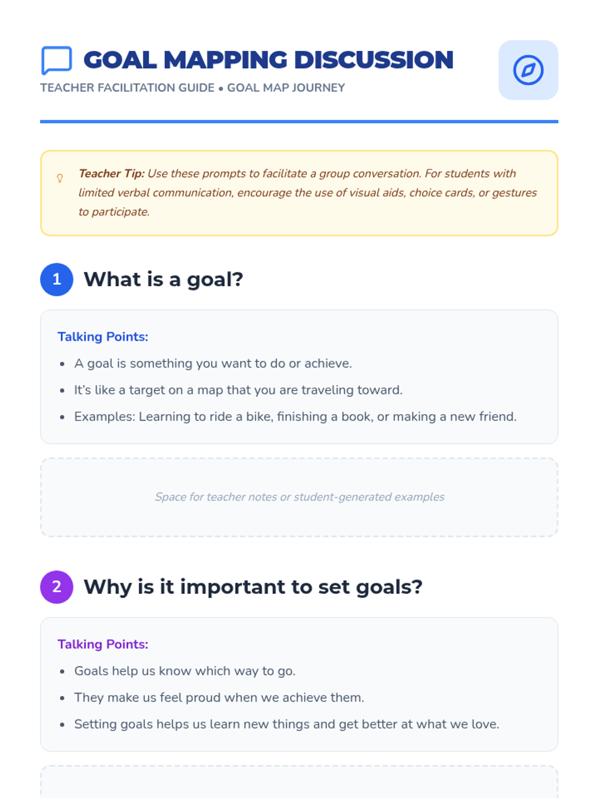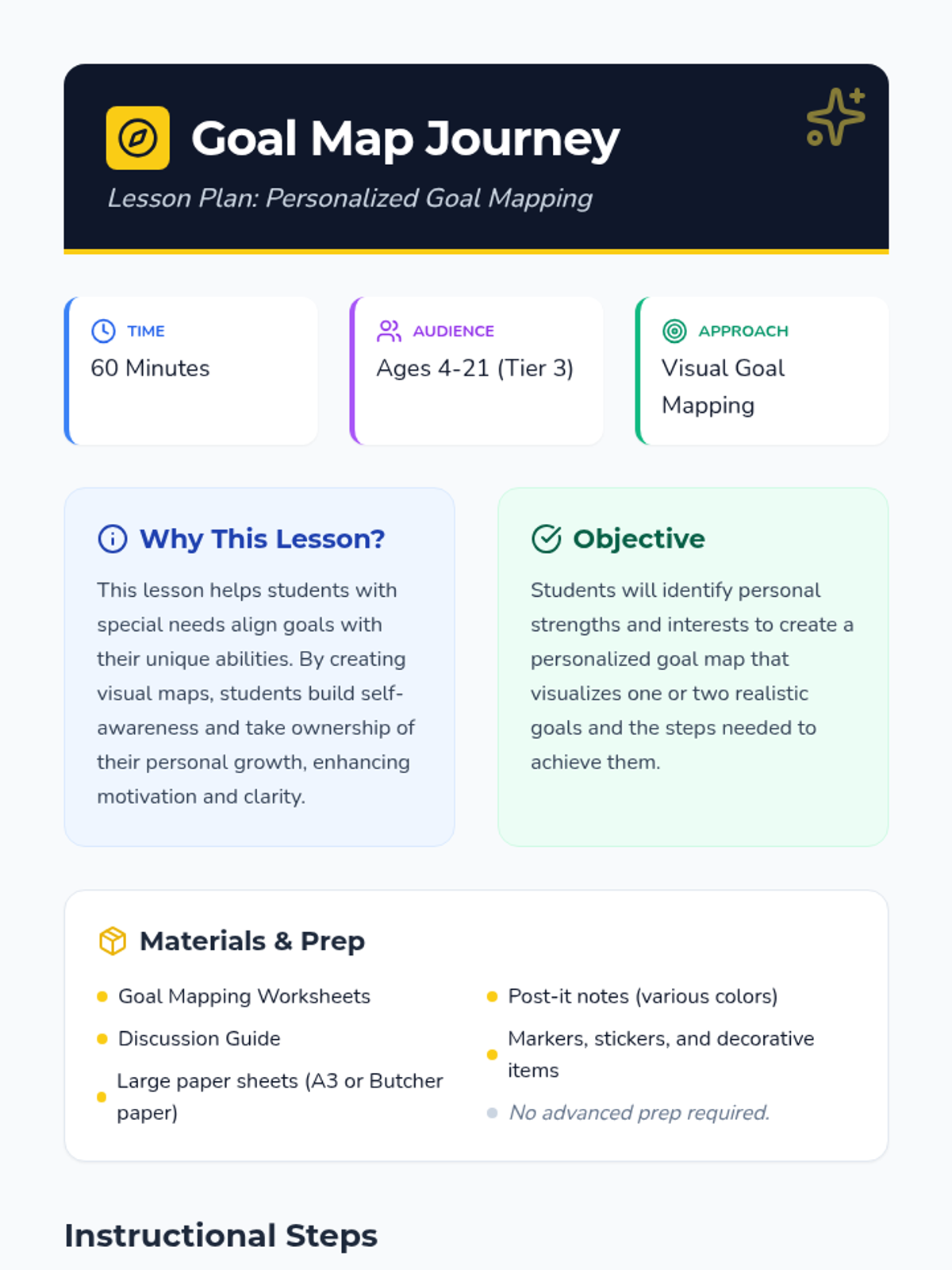 A specialized lesson designed to help students with special needs identify their strengths and set achievable personal goals through visual mapping and guided discussion.