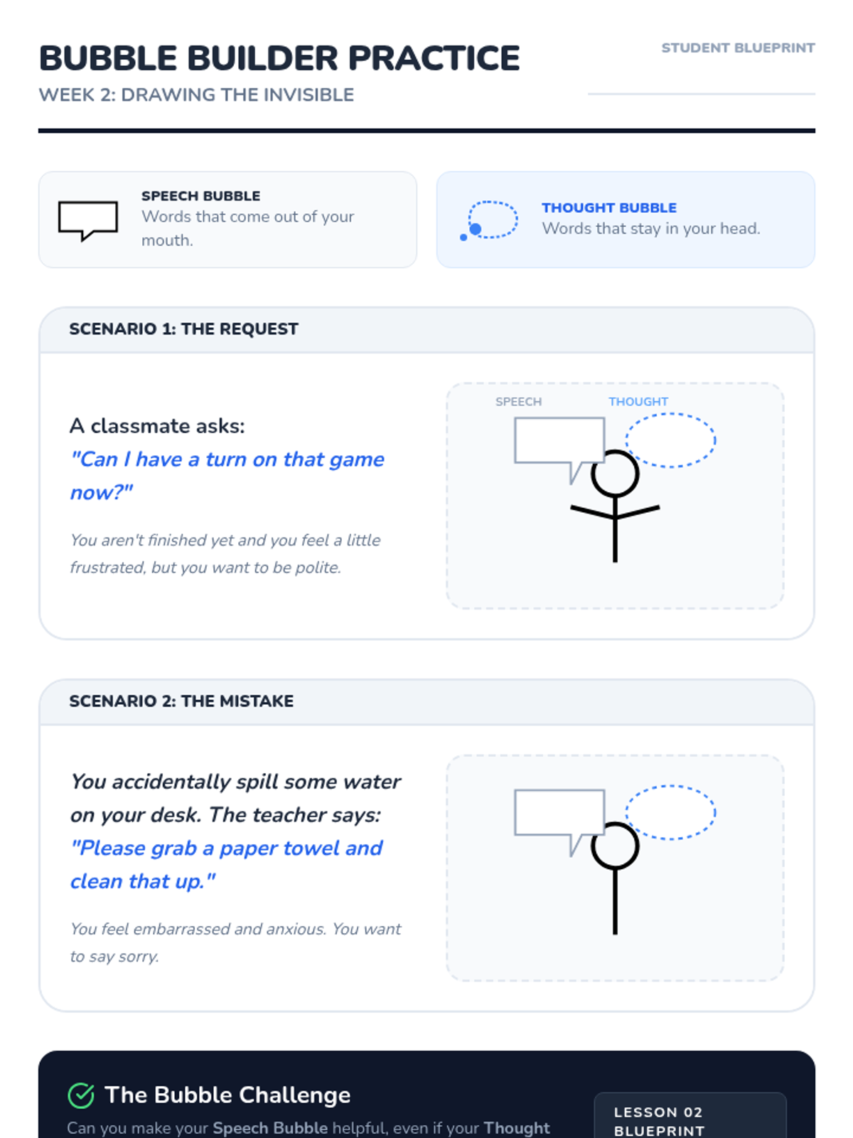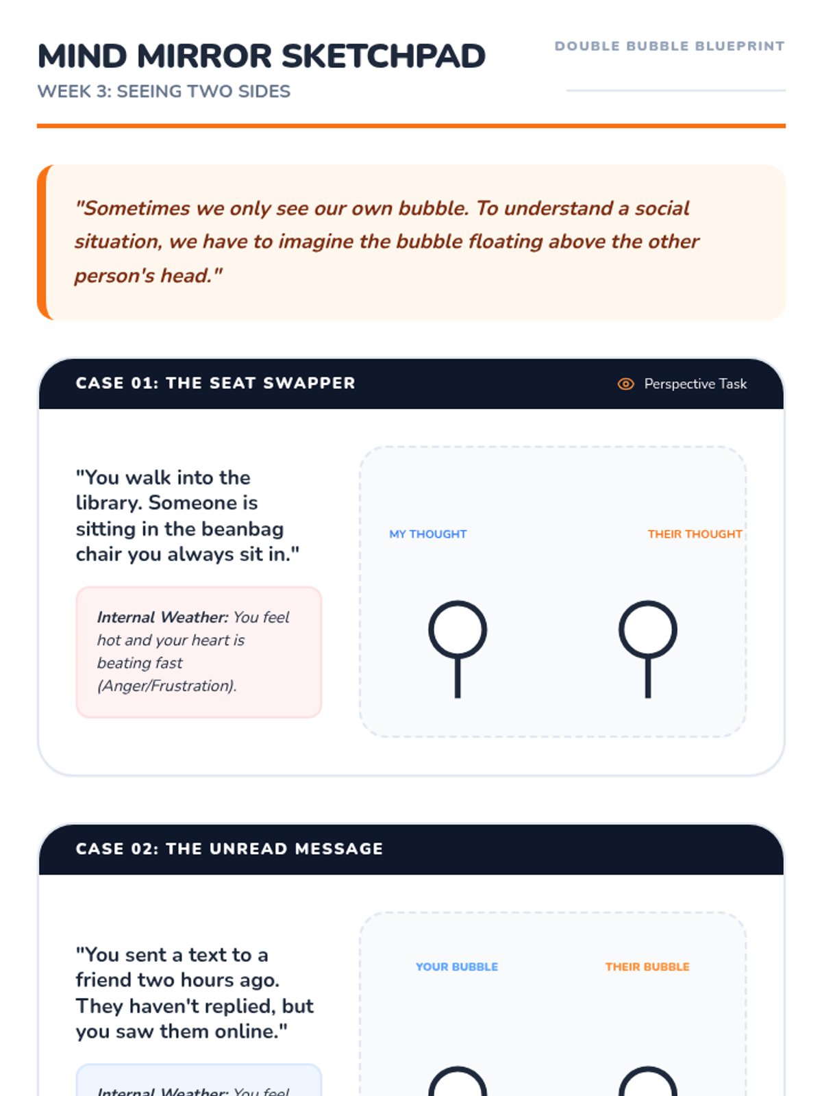 A 50-minute immersion into the mechanics of empathy. Students practice active listening techniques and use 'detective' skills to analyze social scenarios from multiple perspectives.