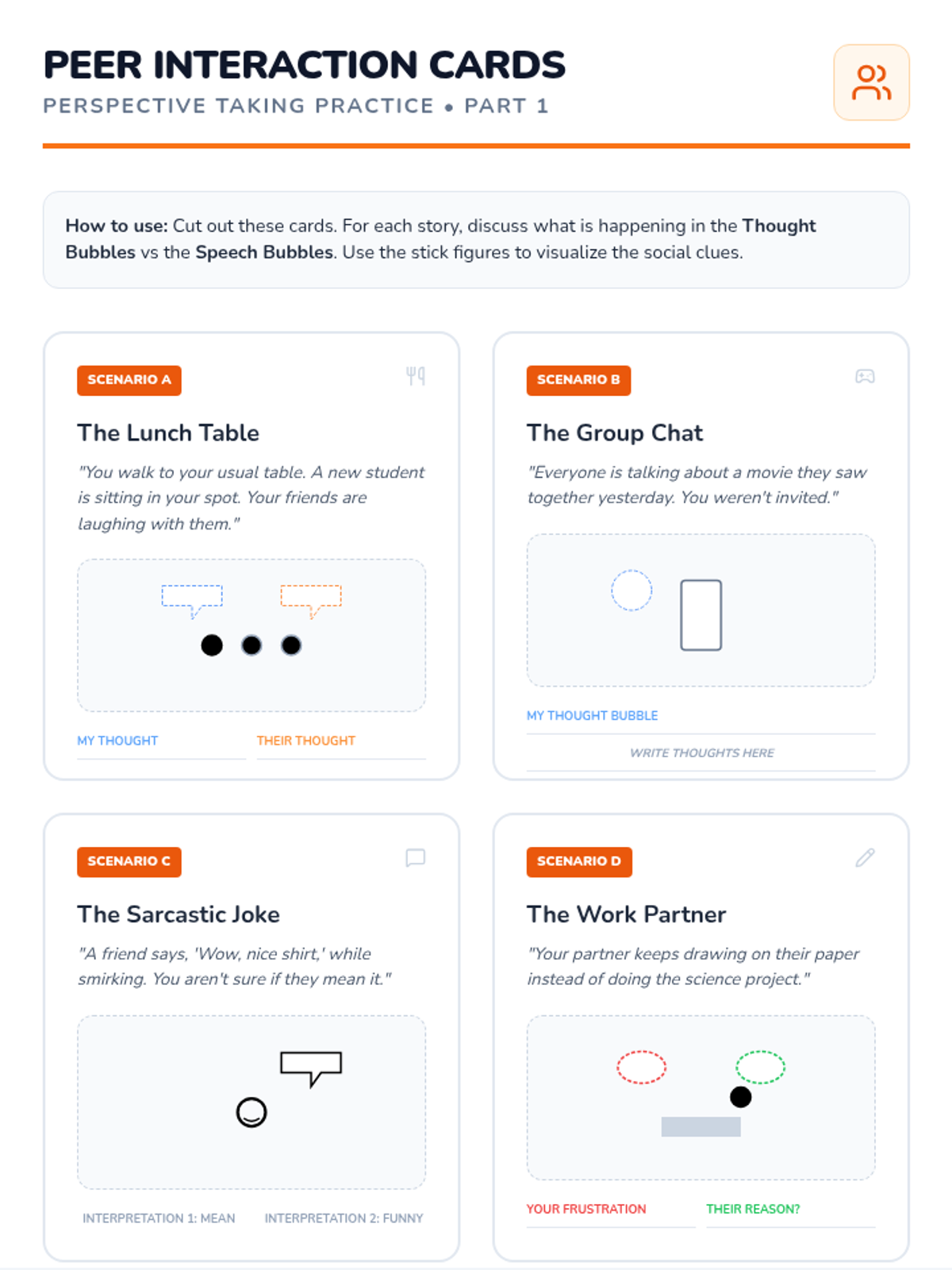 Using stick-figure mapping to visualize the thoughts and feelings of others during social interactions to build perspective-taking skills.