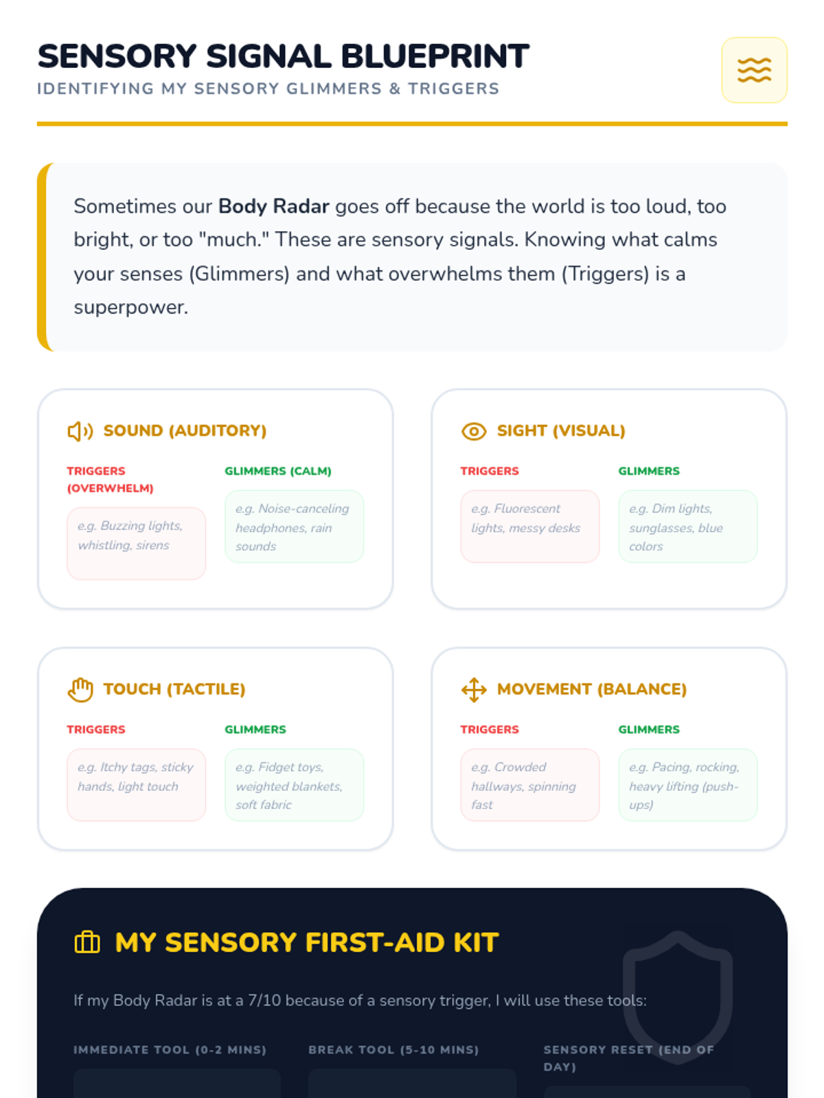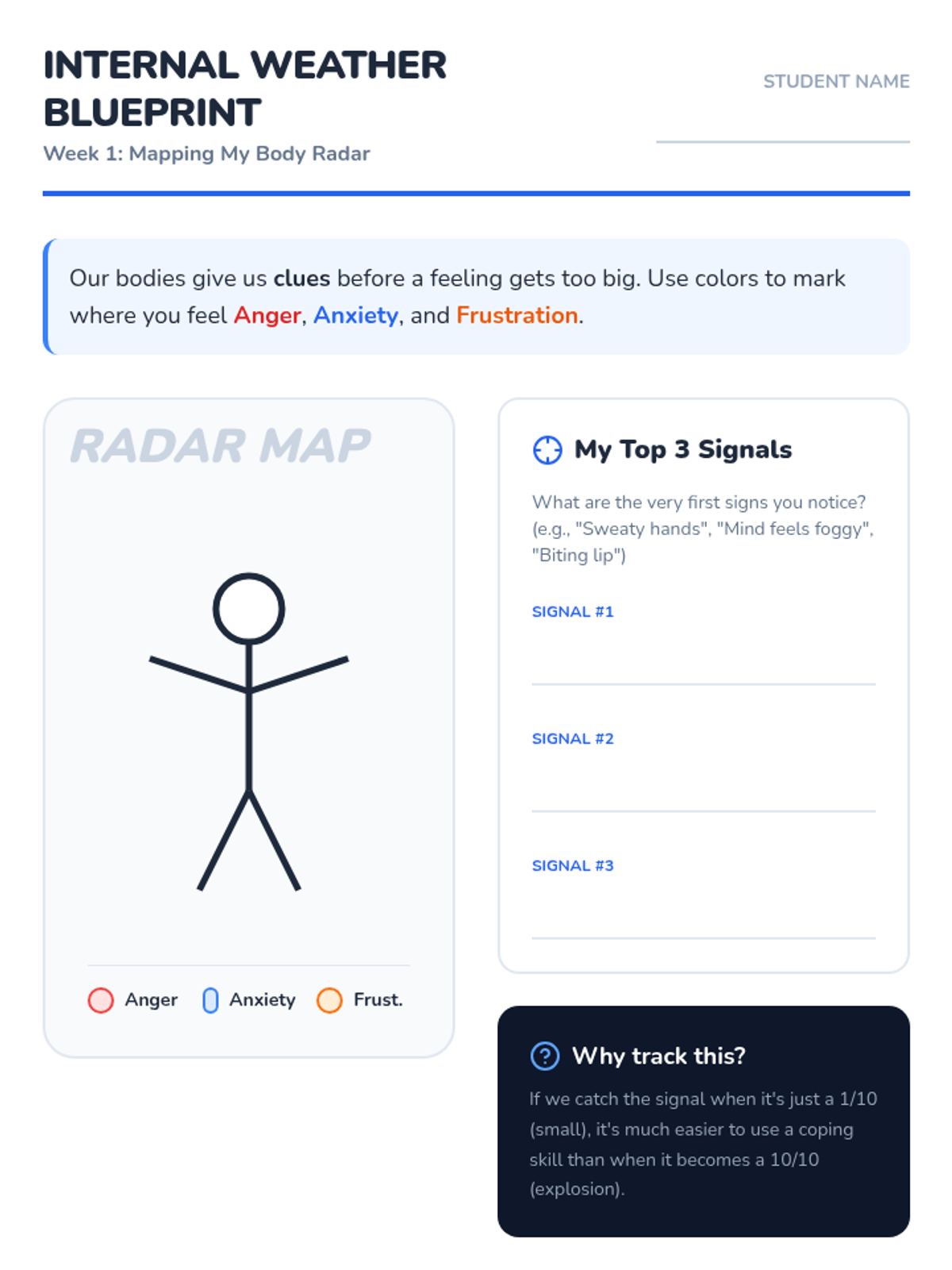 Students learn to identify the physical sensations associated with anger, anxiety, and frustration, creating a 'Body Radar' to catch big feelings early.