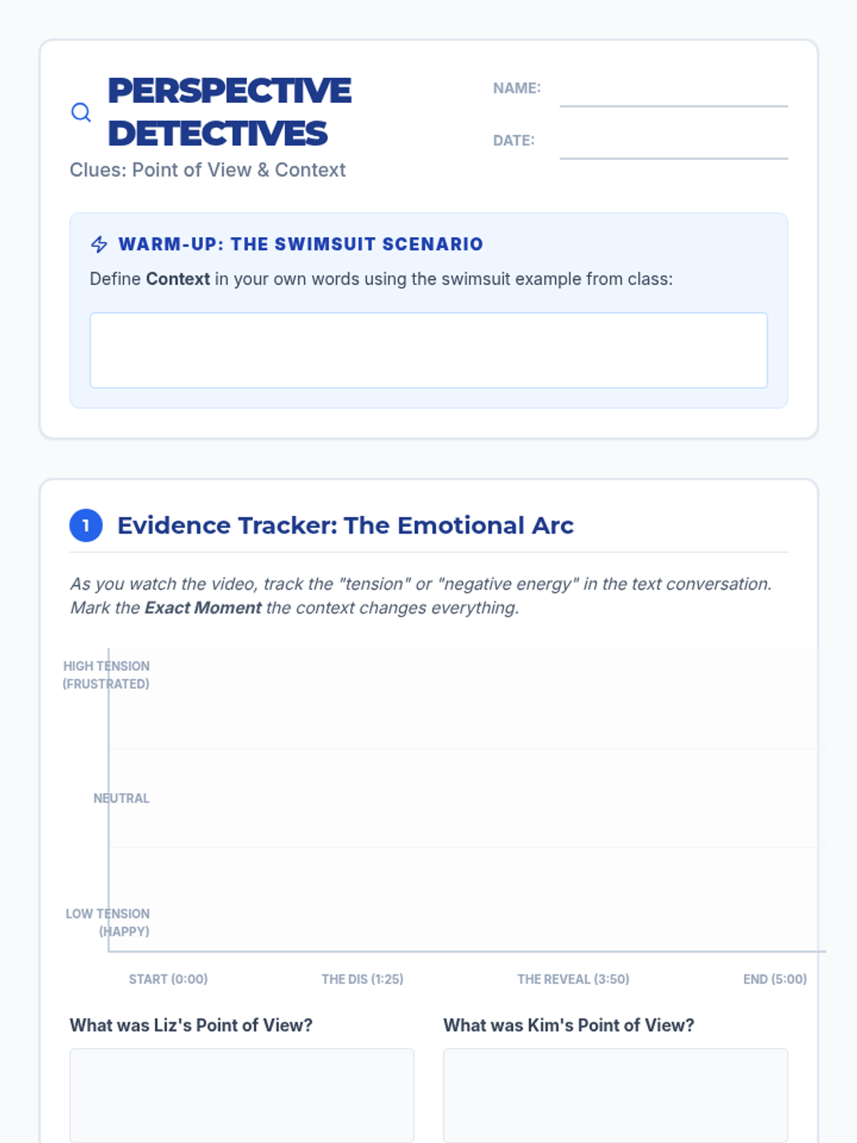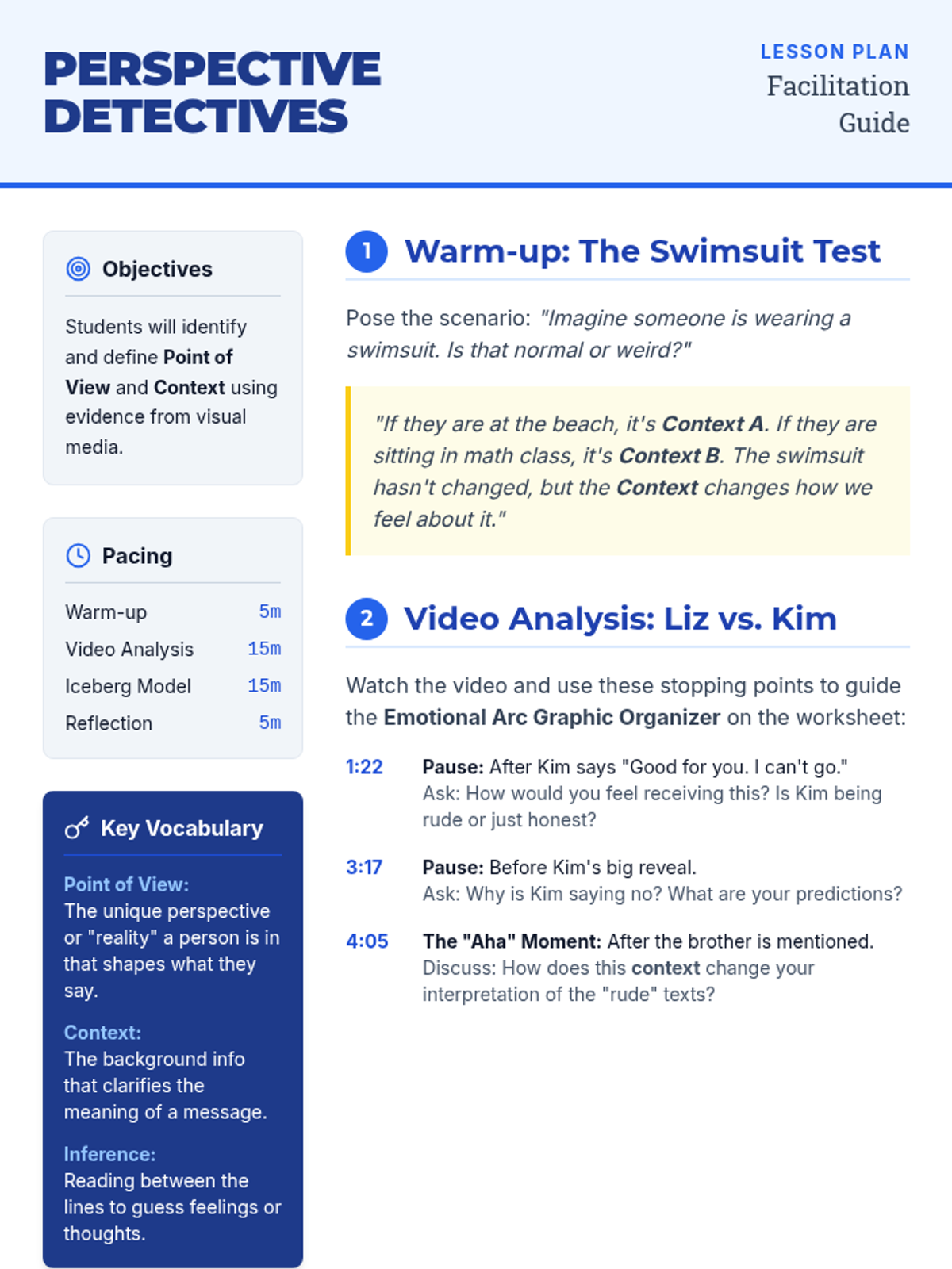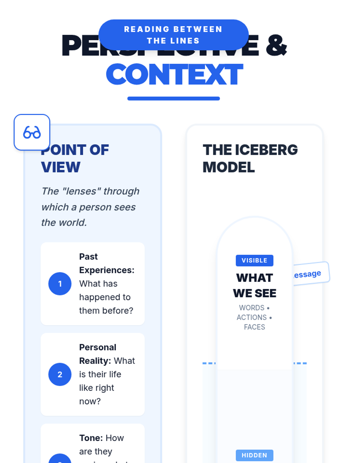 Students explore how point of view and context shape meaning by analyzing a text-based conflict between two characters, culminating in an 'Iceberg Model' analysis of what lies beneath the surface of communication.