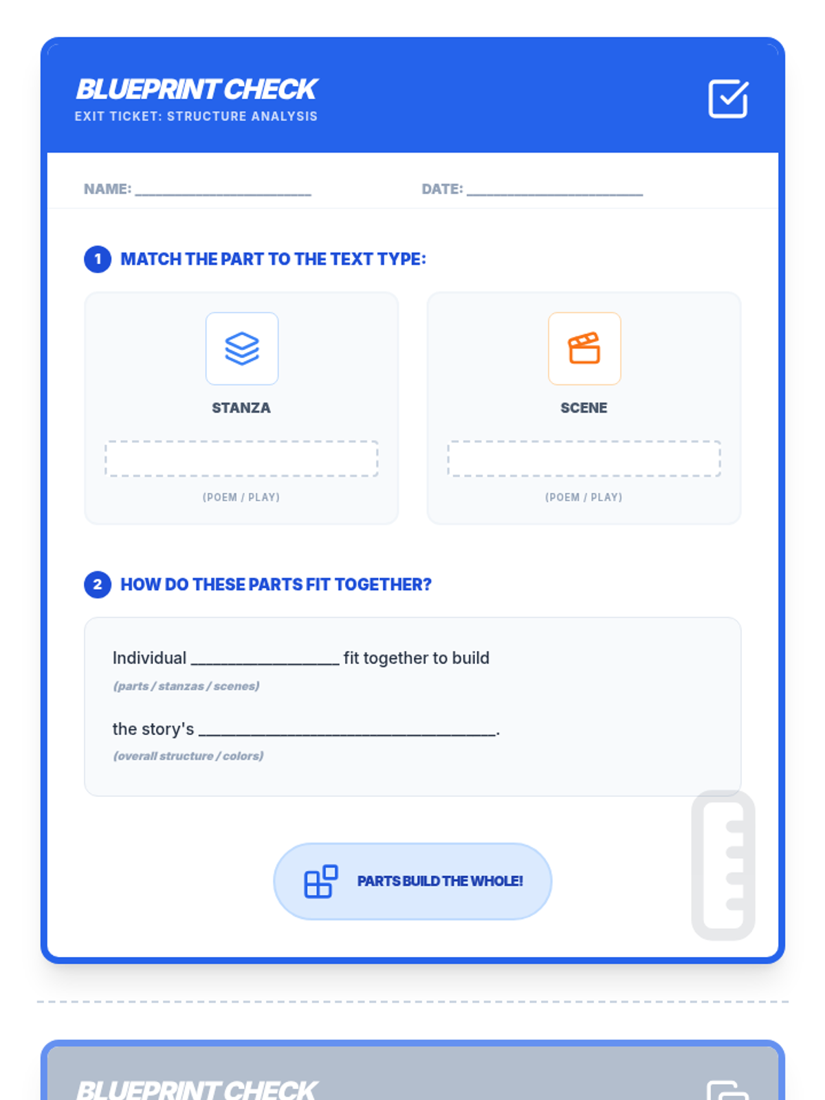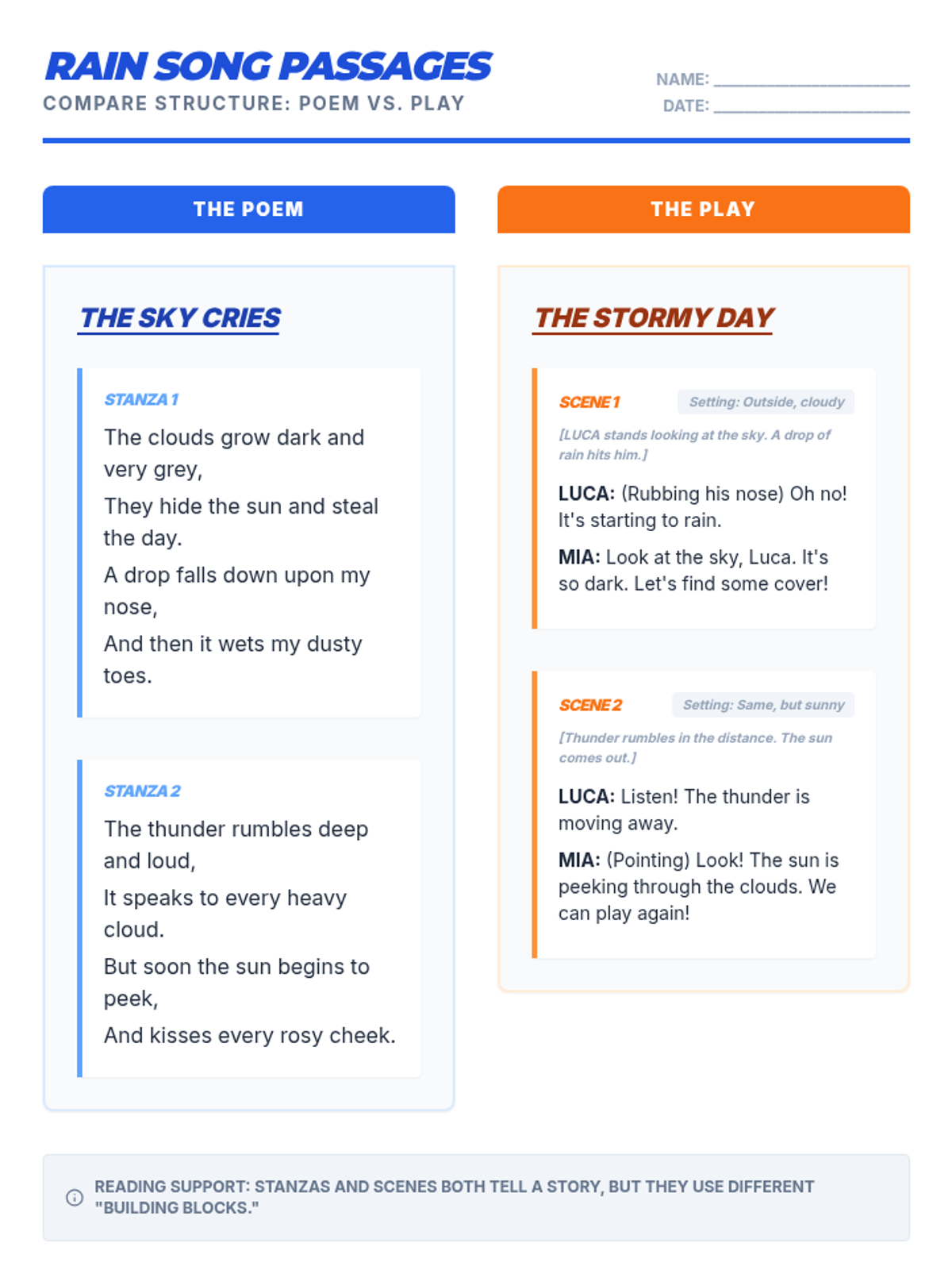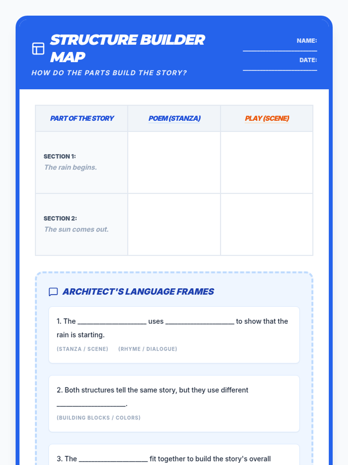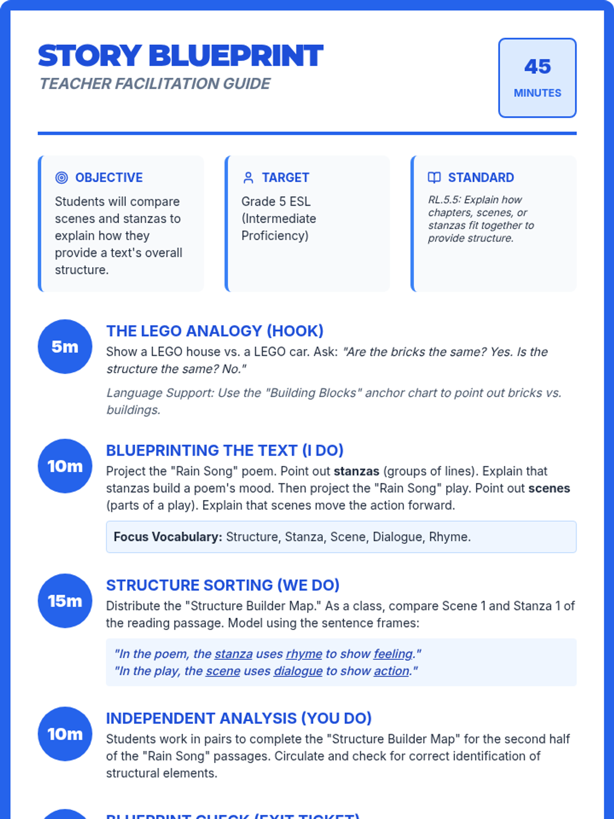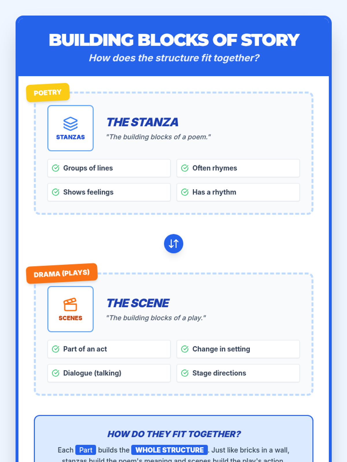 A Grade 5 ESL lesson focused on comparing the structural elements of poetry (stanzas) and drama (scenes). Students will analyze how these individual parts fit together to build an overall story using visual aids and sentence frames.