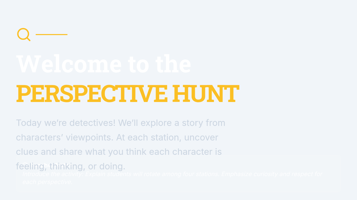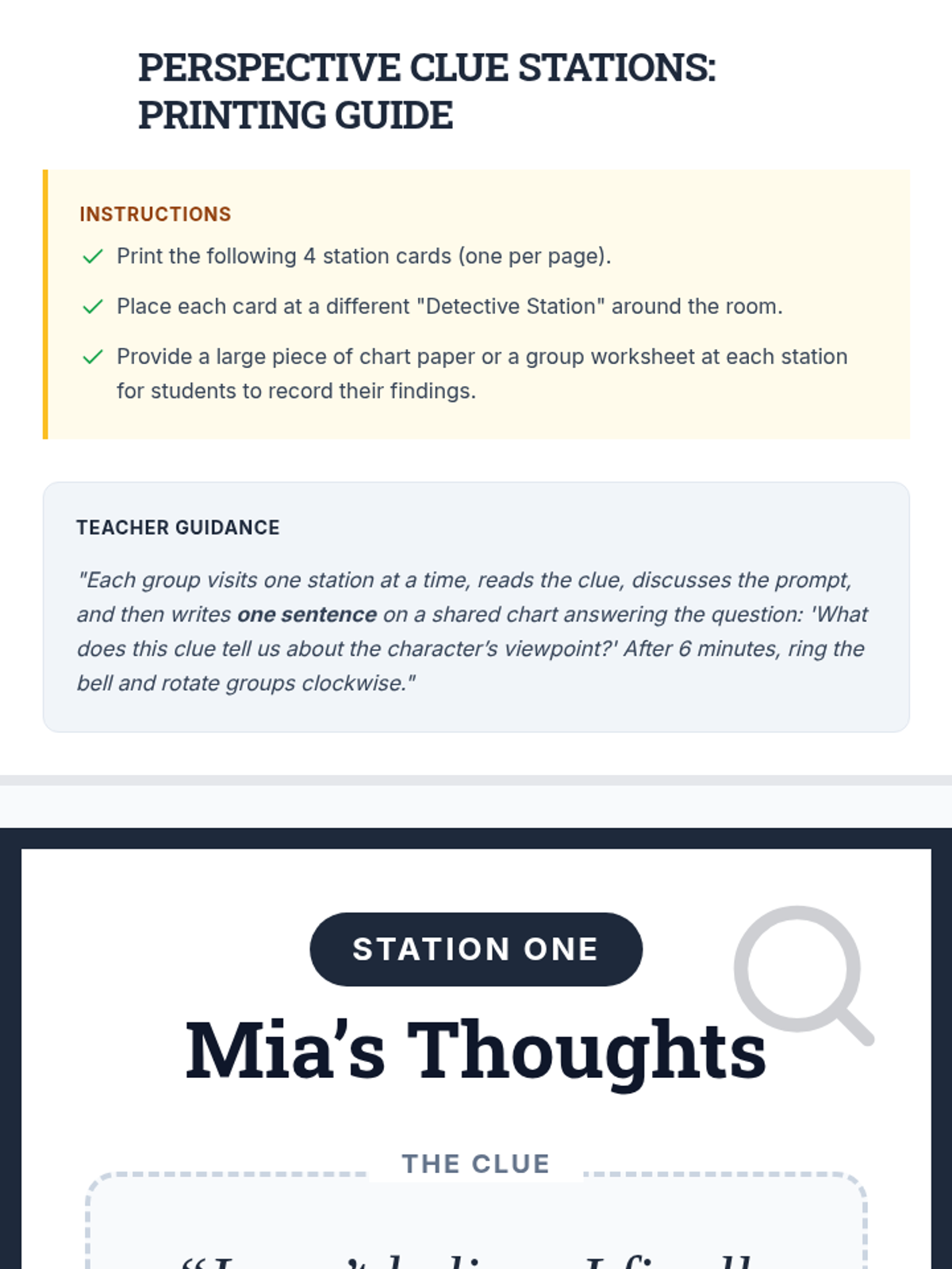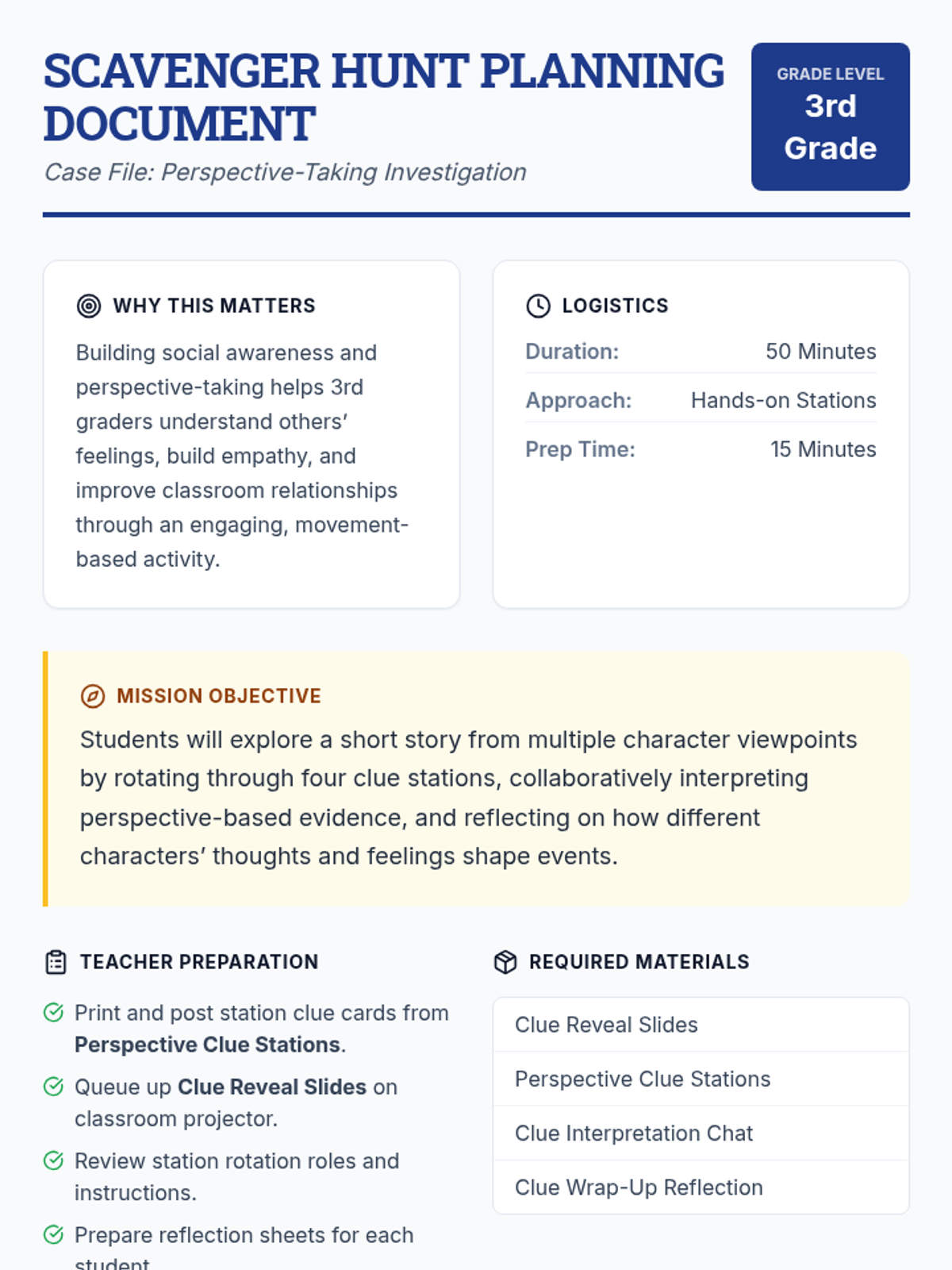 A 50-minute lesson where 3rd graders become 'perspective detectives' to uncover how different characters feel and think in a story. Students rotate through stations to examine clues, fostering social awareness and empathy through active exploration.