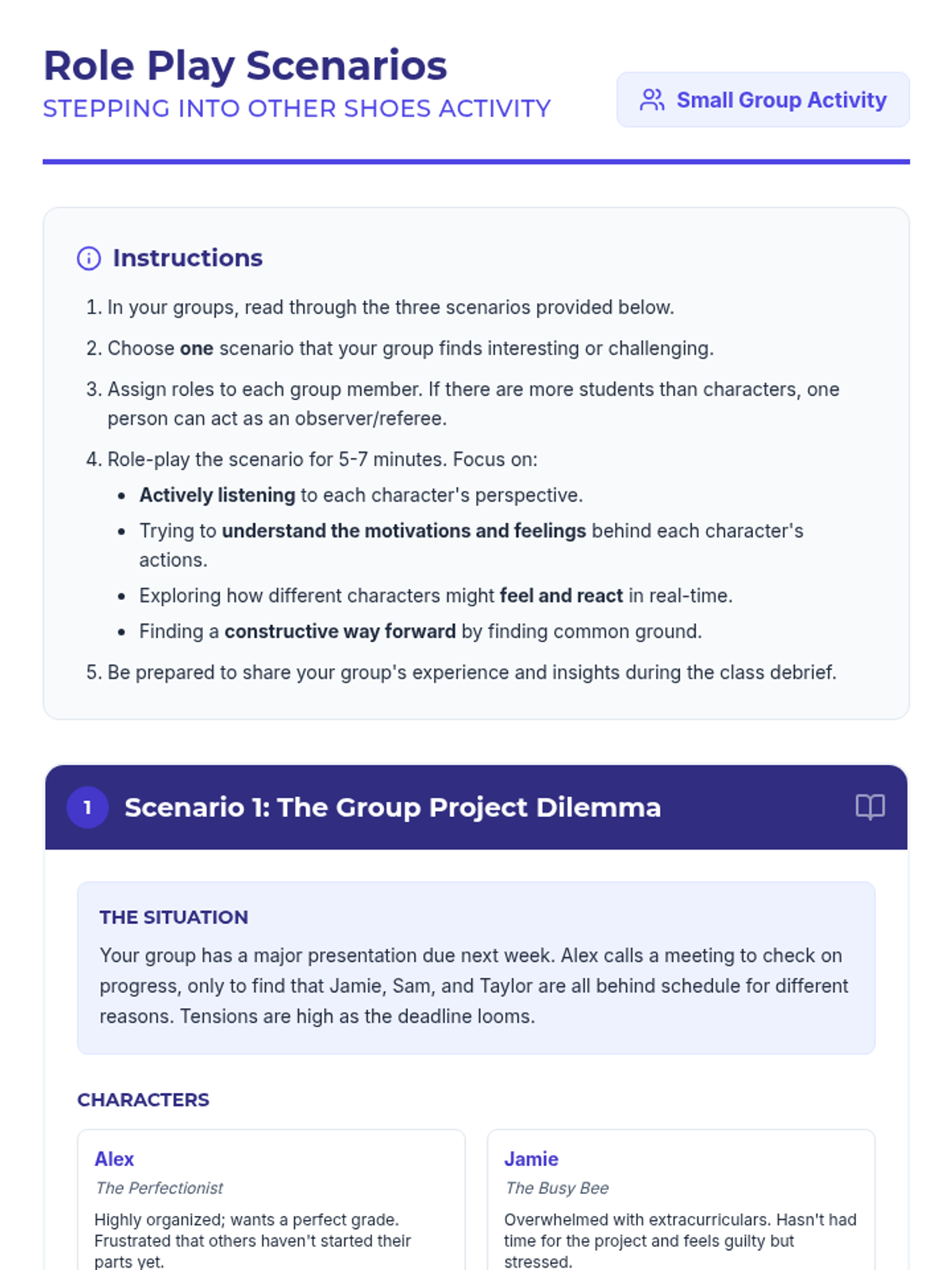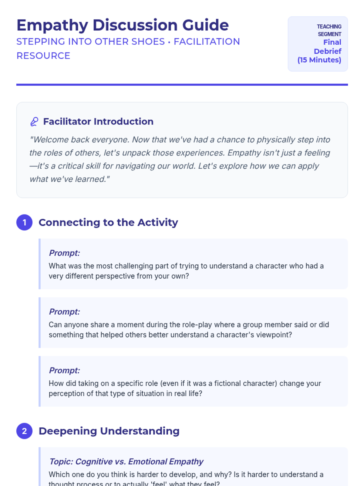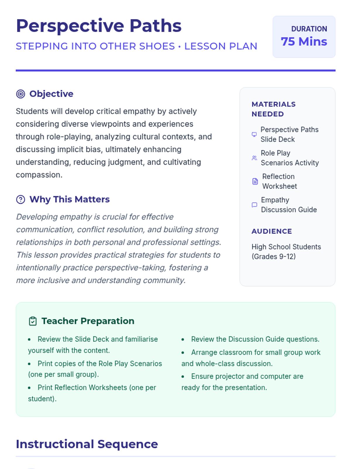 A 75-minute high school lesson focused on developing critical empathy through role-playing, analyzing cultural contexts, and discussing implicit bias to enhance social and vocational interactions.