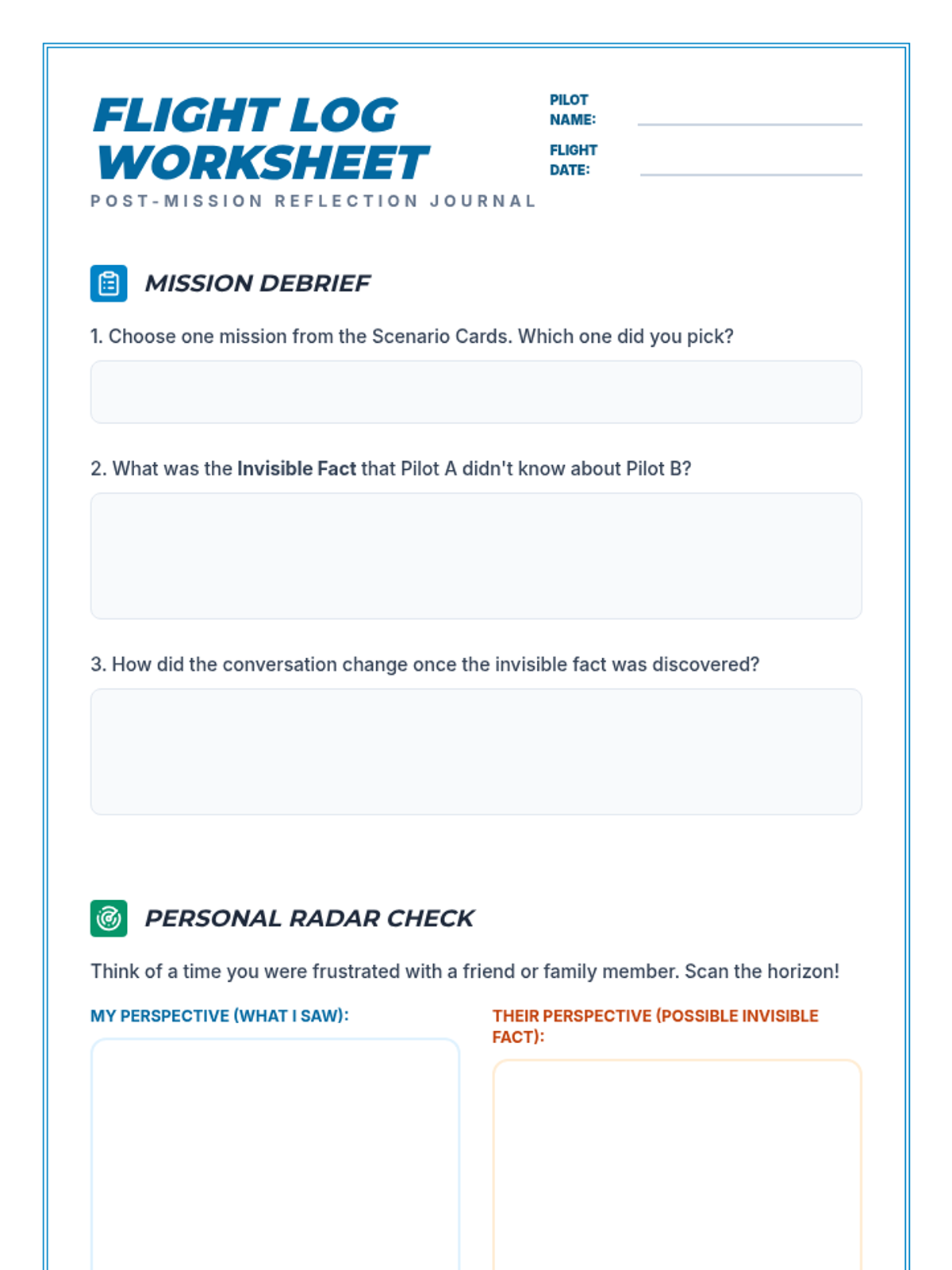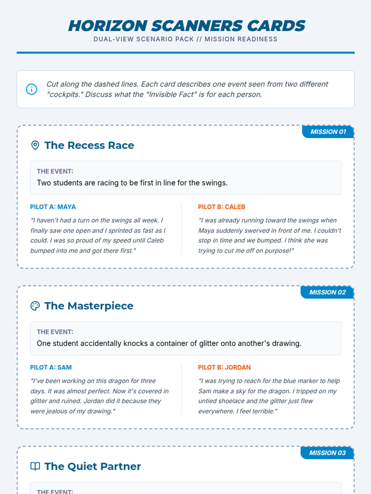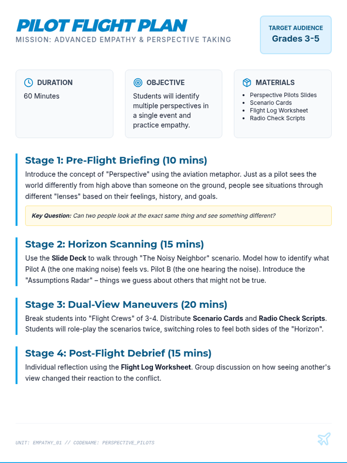 A comprehensive lesson for 3rd-5th graders focused on advanced empathy and perspective-taking. Students use aviation-themed metaphors to explore how different people experience the same event in various ways, helping to reduce assumptions and improve conflict resolution.