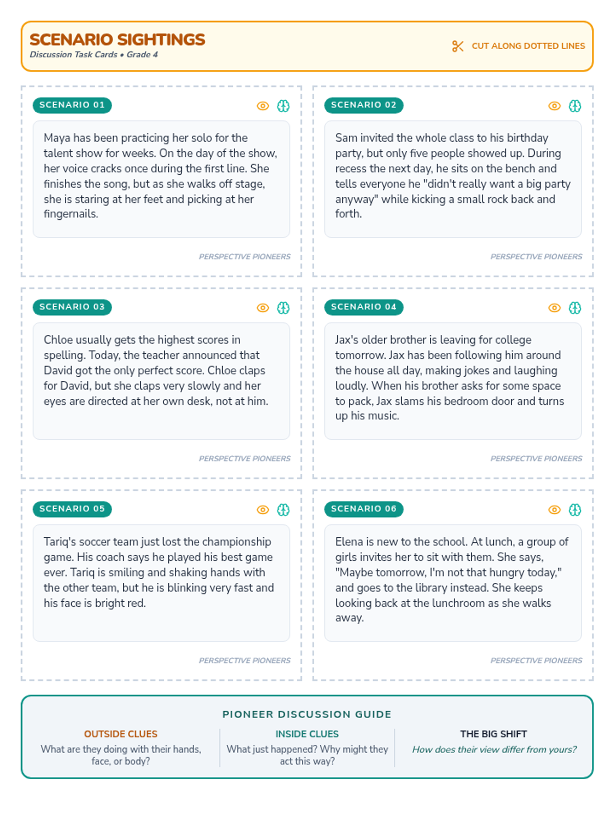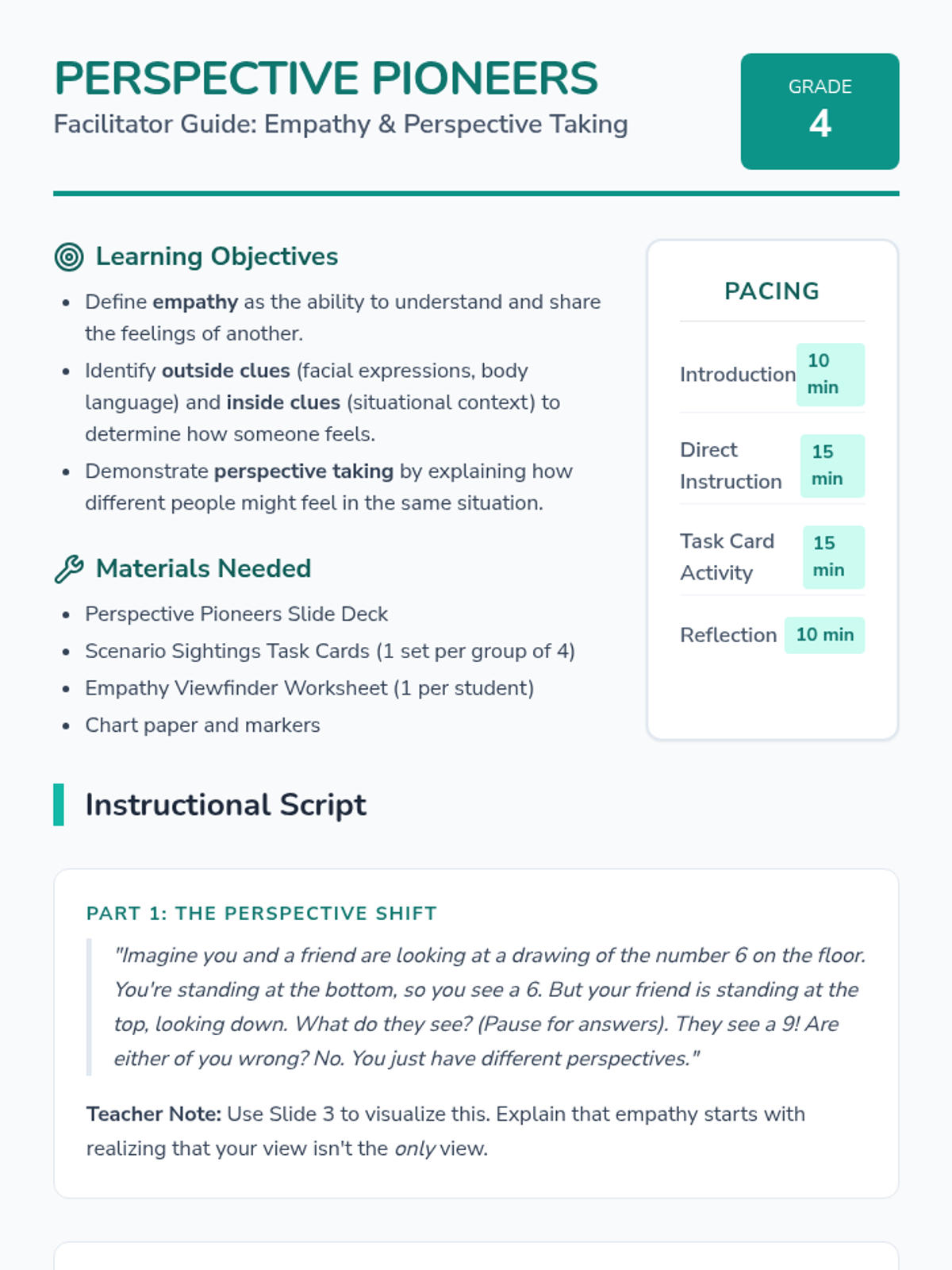 A comprehensive lesson on empathy and perspective-taking for 4th graders, focusing on identifying social clues and understanding diverse viewpoints.