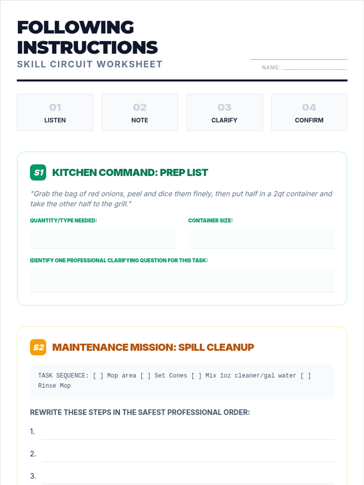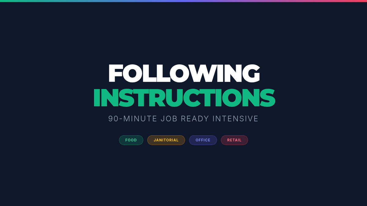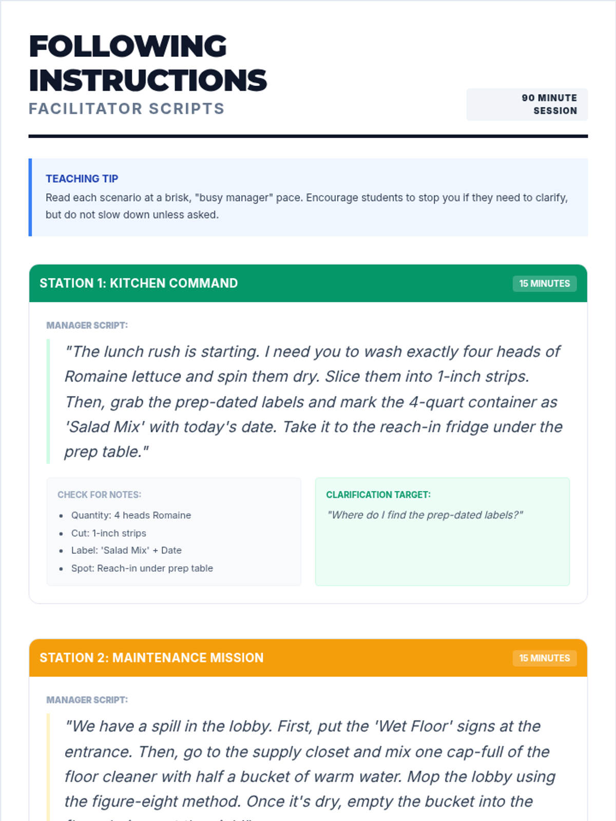 The core 90-minute training session covering four industry-specific challenges. Students rotate through scenarios to master the 4-step professional process for following instructions.