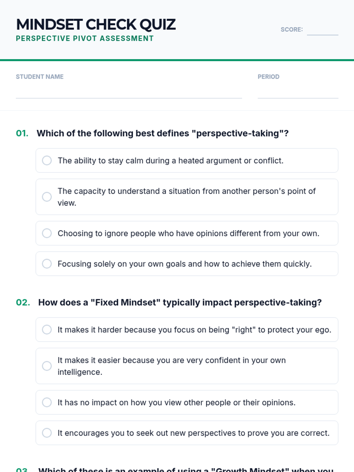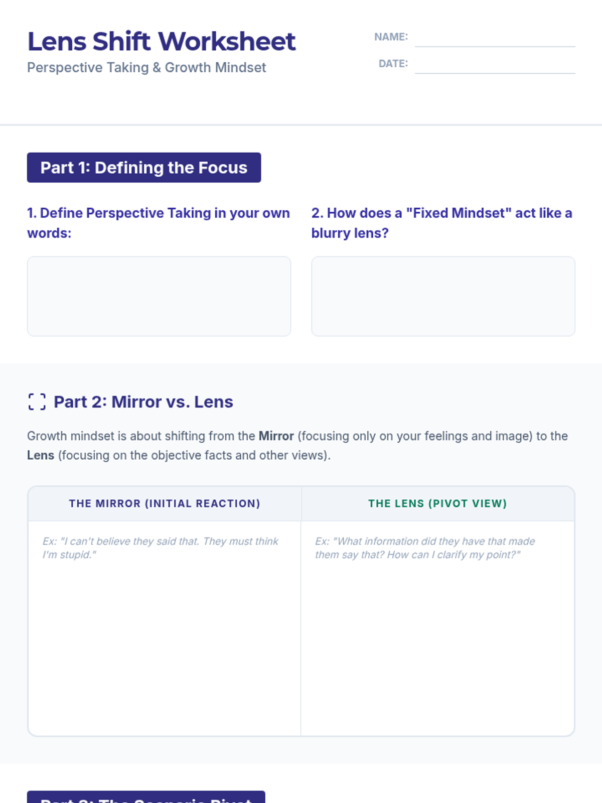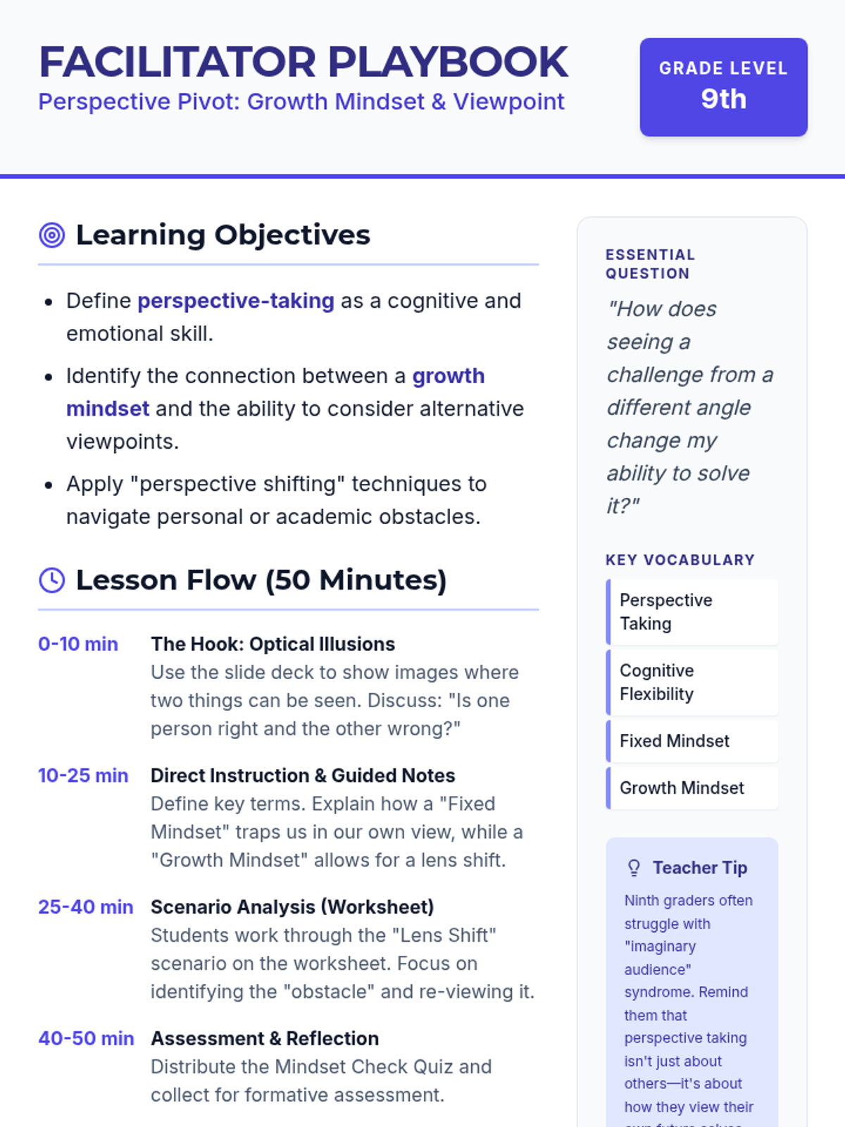 A lesson designed for 9th graders to explore the intersection of perspective-taking and growth mindset. Students will learn how to shift their 'lens' to overcome challenges and understand others better.