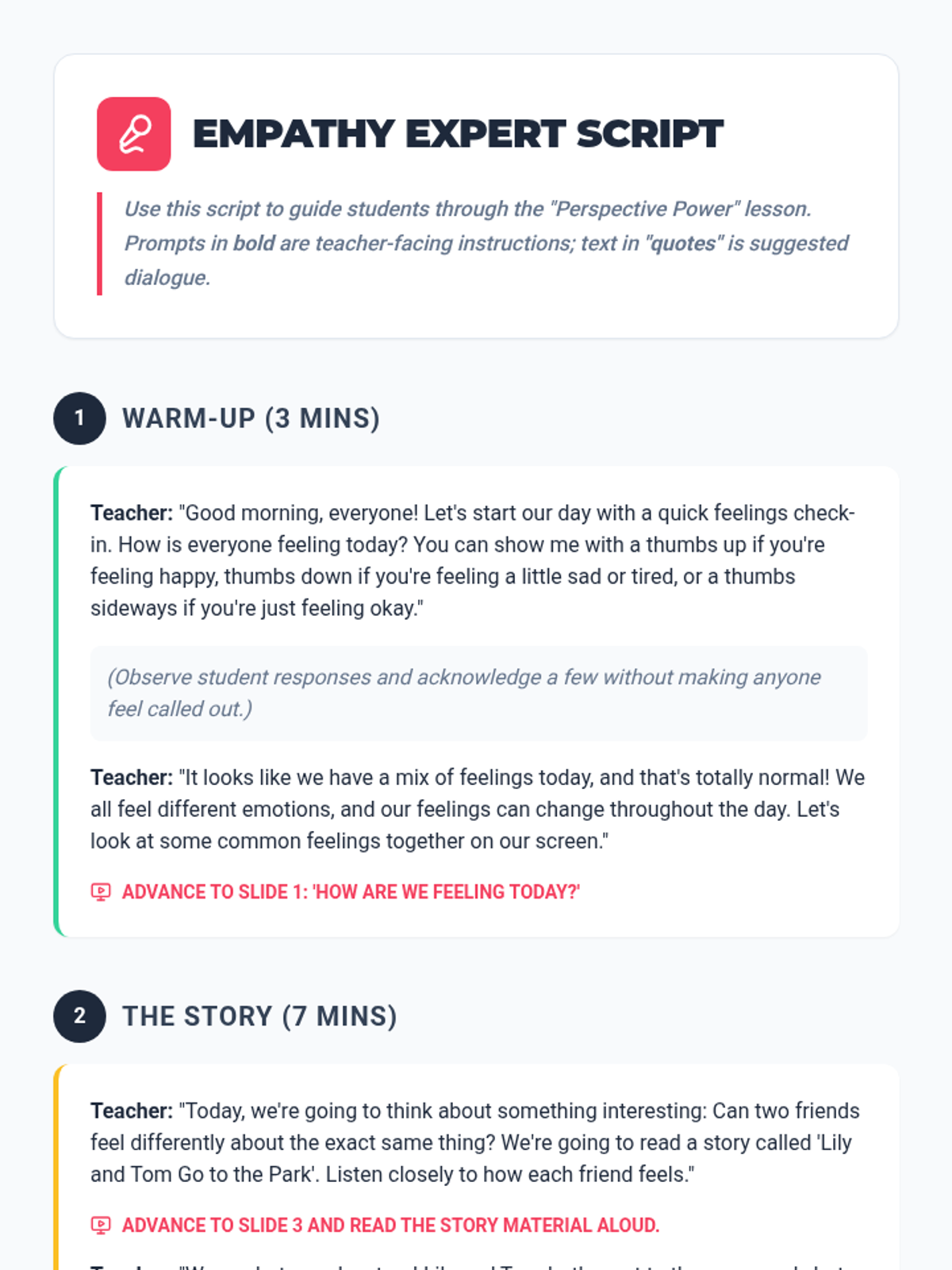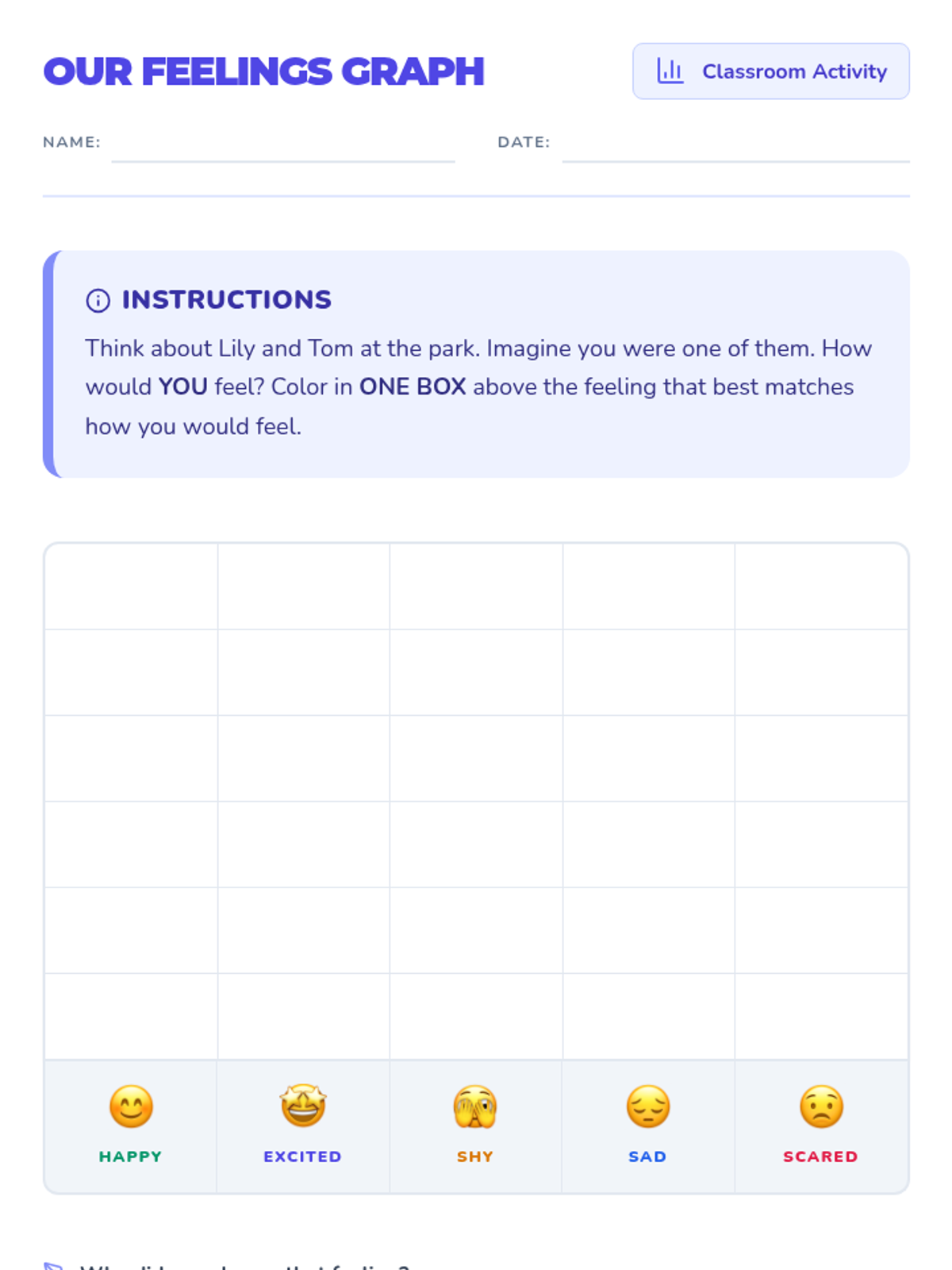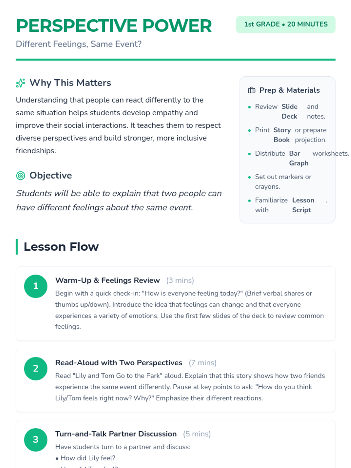 This lesson helps 1st graders understand that people can have different feelings about the same event, a fundamental skill for developing empathy and social-emotional awareness. Students will explore two perspectives of a park trip and graph their own reactions to the scenario.