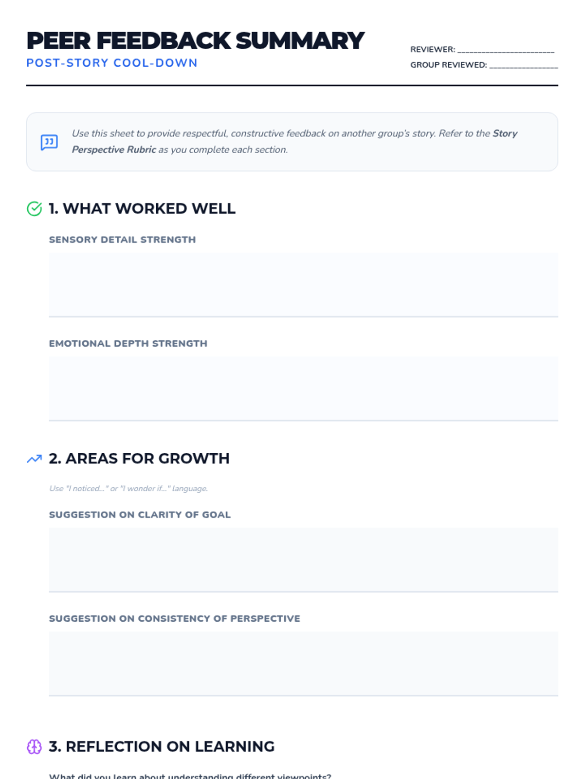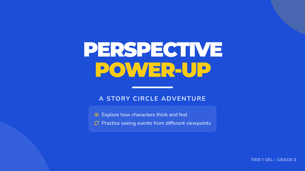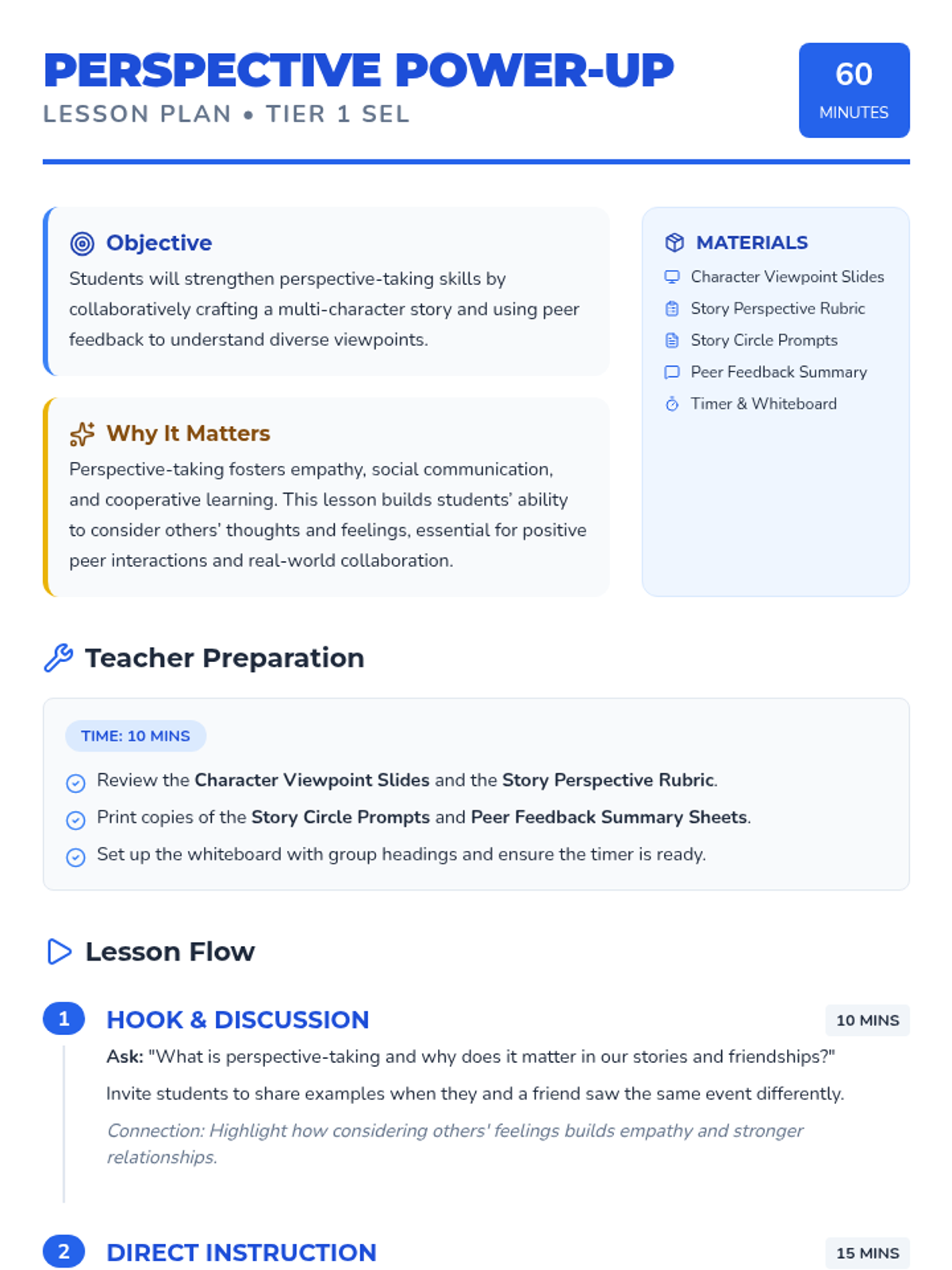 A 60-minute Tier 1 lesson for 5th graders to develop perspective-taking skills through collaborative storytelling and peer feedback. Students learn to identify and express character viewpoints, building empathy and communication skills.