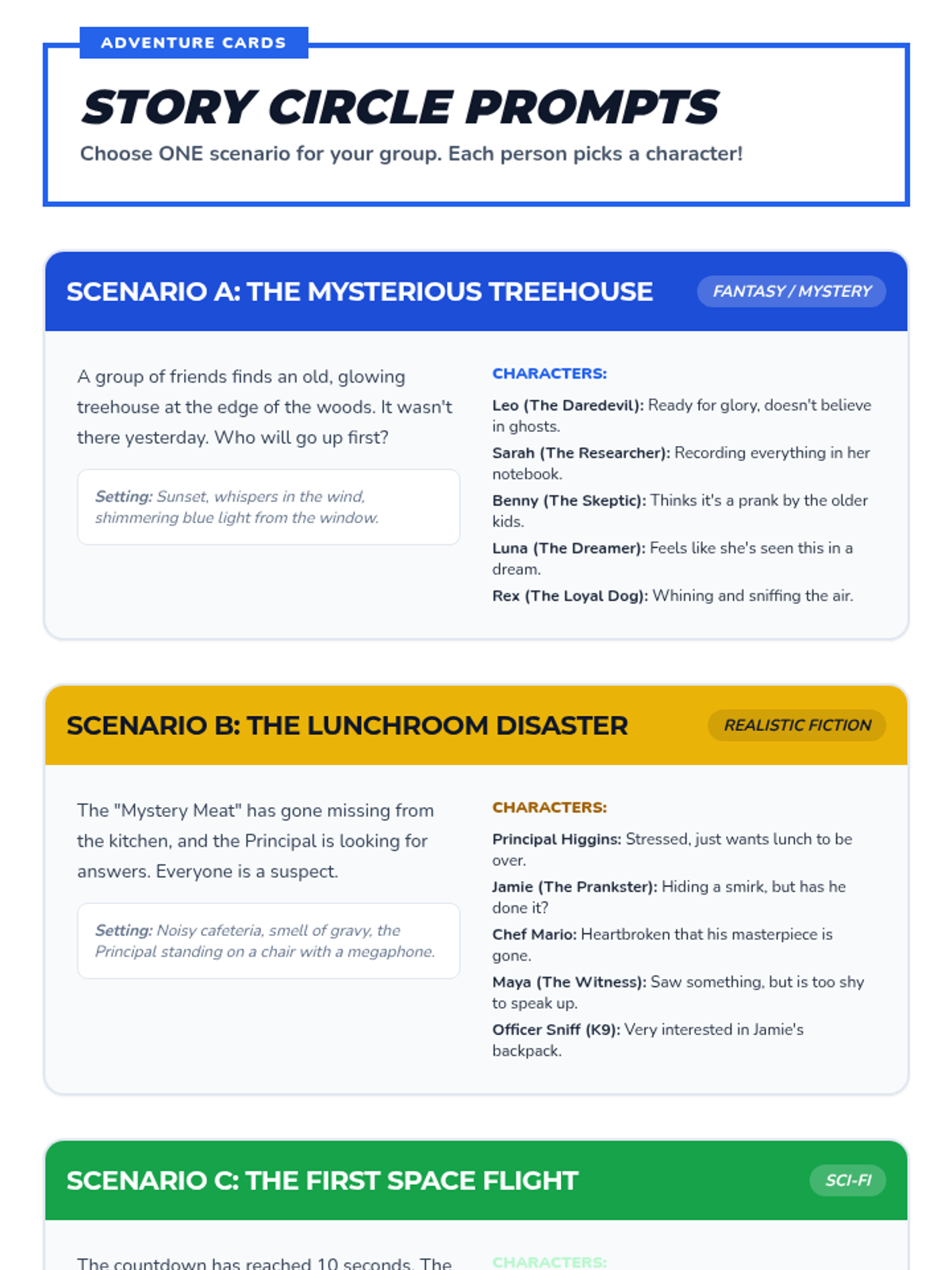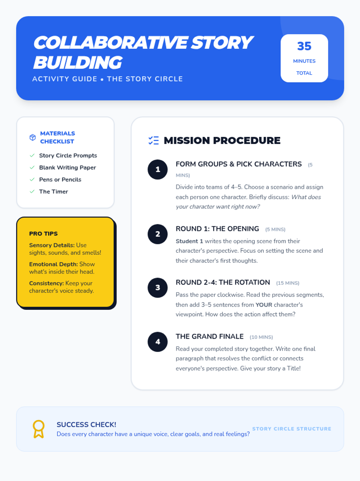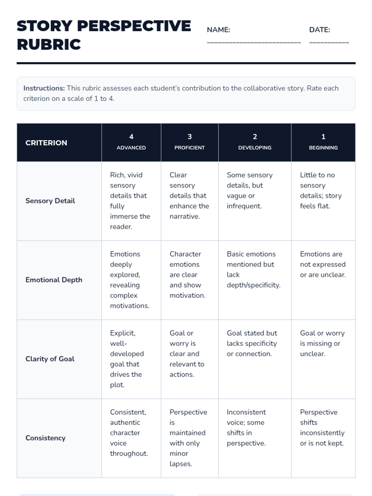 A 60-minute Tier 1 lesson for 5th graders to develop perspective-taking skills through collaborative storytelling and peer feedback. Students learn to identify and express character viewpoints, building empathy and communication skills.