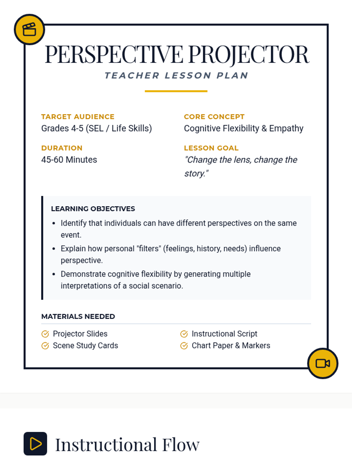 A social-emotional learning lesson that uses a cinema-themed 'projector' analogy to help 4th and 5th graders understand how different viewpoints shape our perception of social situations.